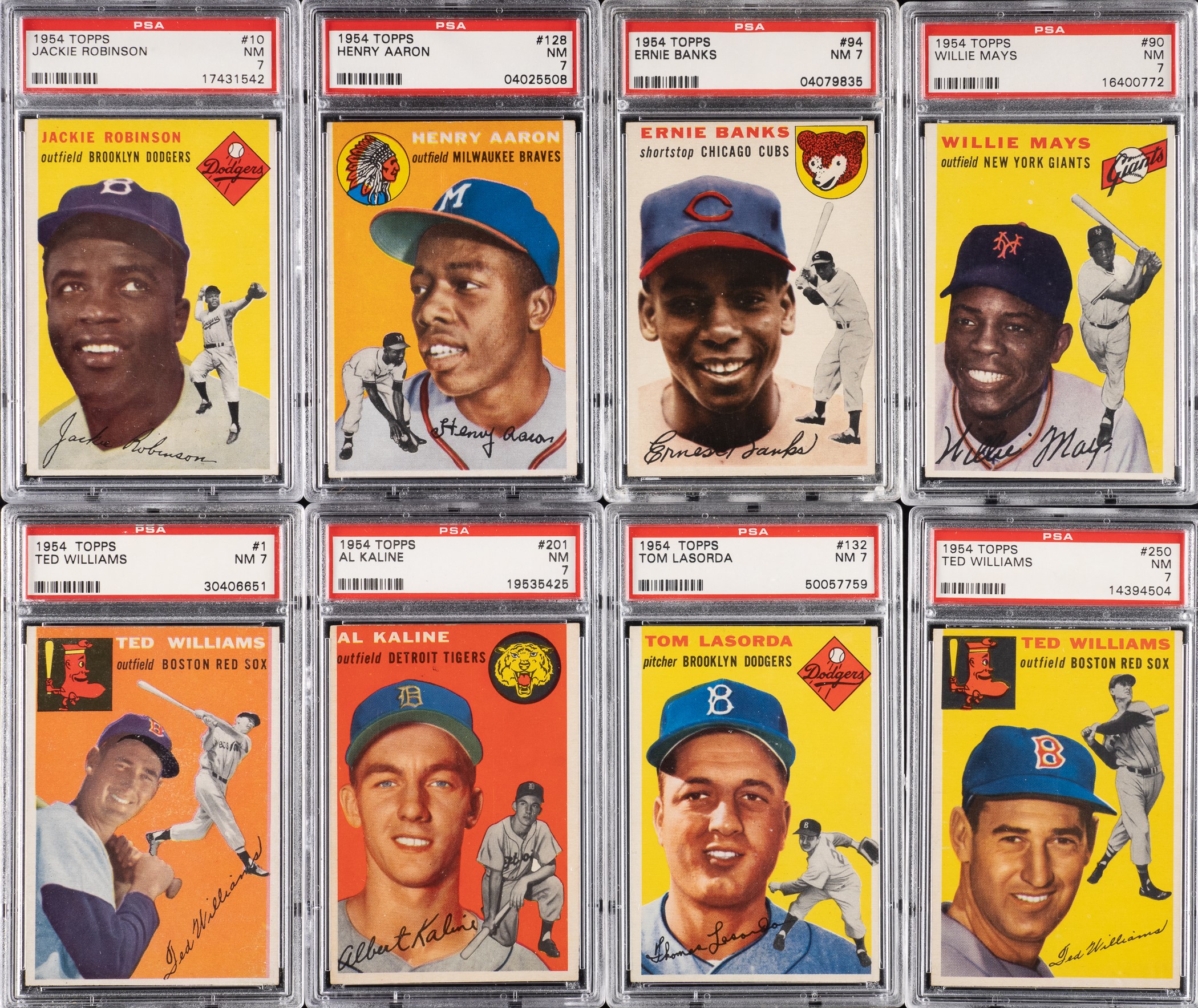 The 1954 Topps set is one of the most popular sets of the 1950s. Issued in the heart of the decade, the 1954 Topps set features the rookie cards of Hank Aaron, Ernie Banks, and Al Kaline, among many other Hall of Famers and stars, including two examples of Ted Williams (first and last card in the set), all in brilliant and stunning color. Presented is one of the finest sets of this classic issue that we have ever offered! All of the 250 cards in this complete set have been graded and encapsulated by PSA and consist of thirteen NM-MT 8s, eight NM+ 7.5s, and 229 NM 7s. The set's overall GPA of 7.07 ranks it 29th on the PSA Set Registry out of 233 sets registered to date. As any collector of high-grade early 1950s cards knows, assembling a complete set of any 1950s vintage issue is a daunting challenge, and this is especially true of 1954 Topps. The assembly of a set of this high quality and unrivaled consistency is the result of a tremendous investment of time, effort, and patience (in addition to capital). Many 1954 Topps cards are particularly challenging to find in high grade, especially due to print lines, centering issues, and their flush-to-the top-border design. PSA Grading Composite: NM-MT 8 (13 cards): #58, 105, 112, 133, 156, 165, 170, 181, 197, 214, 224, 230, and 235. NM+ 7.5 (8 cards): #7 Kluszewski, 20 Spahn, 24, 91, 99, 144, 221, and 223. NM 7 (229 cards): #1 Williams, 3 Irvin, 10 Robinson, 13 Martin, 17 Rizzuto, 30 Mathews, 32 Snider, 36 Wilhelm, 37 Ford, 45 Ashburn, 50 Berra, 70 Doby, 83 Collins, 90 Mays, 94 Banks RC, 102 Hodges, 128 Aaron RC, 132 Lasorda RC, 201 Kaline RC, 239 Skowron RC, and 250 Williams. This set was assembled one card at a time by a very dedicated, condition-conscious collector over a period of many years, with a concern for all factors but with a special consideration to overall eye appeal. The total SMR value for the individual cards is $49,035. Total: 250 cards. The size/weight of this item requires that there will be an additional shipping charge for this lot. Opening Bid $10,000.