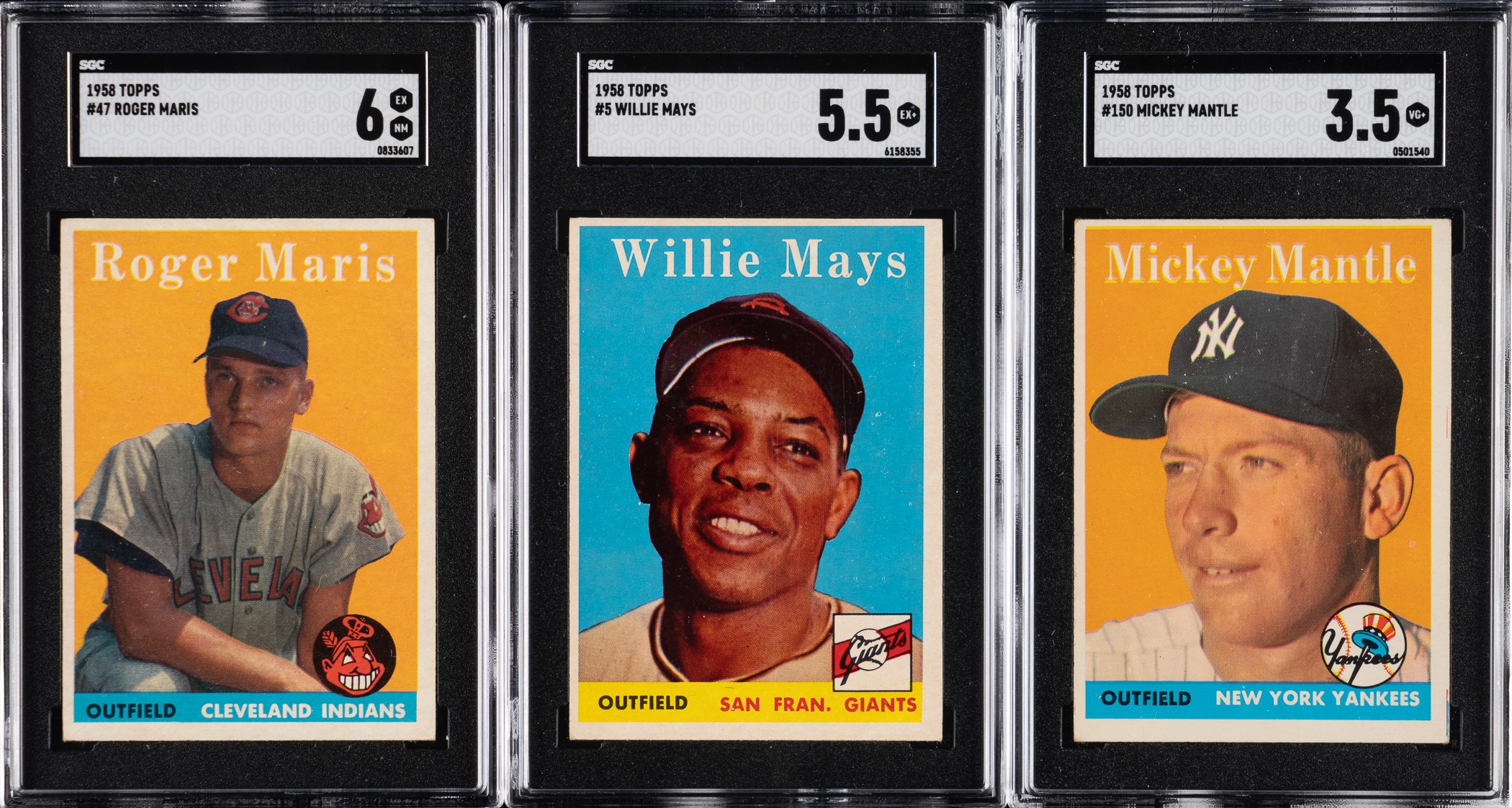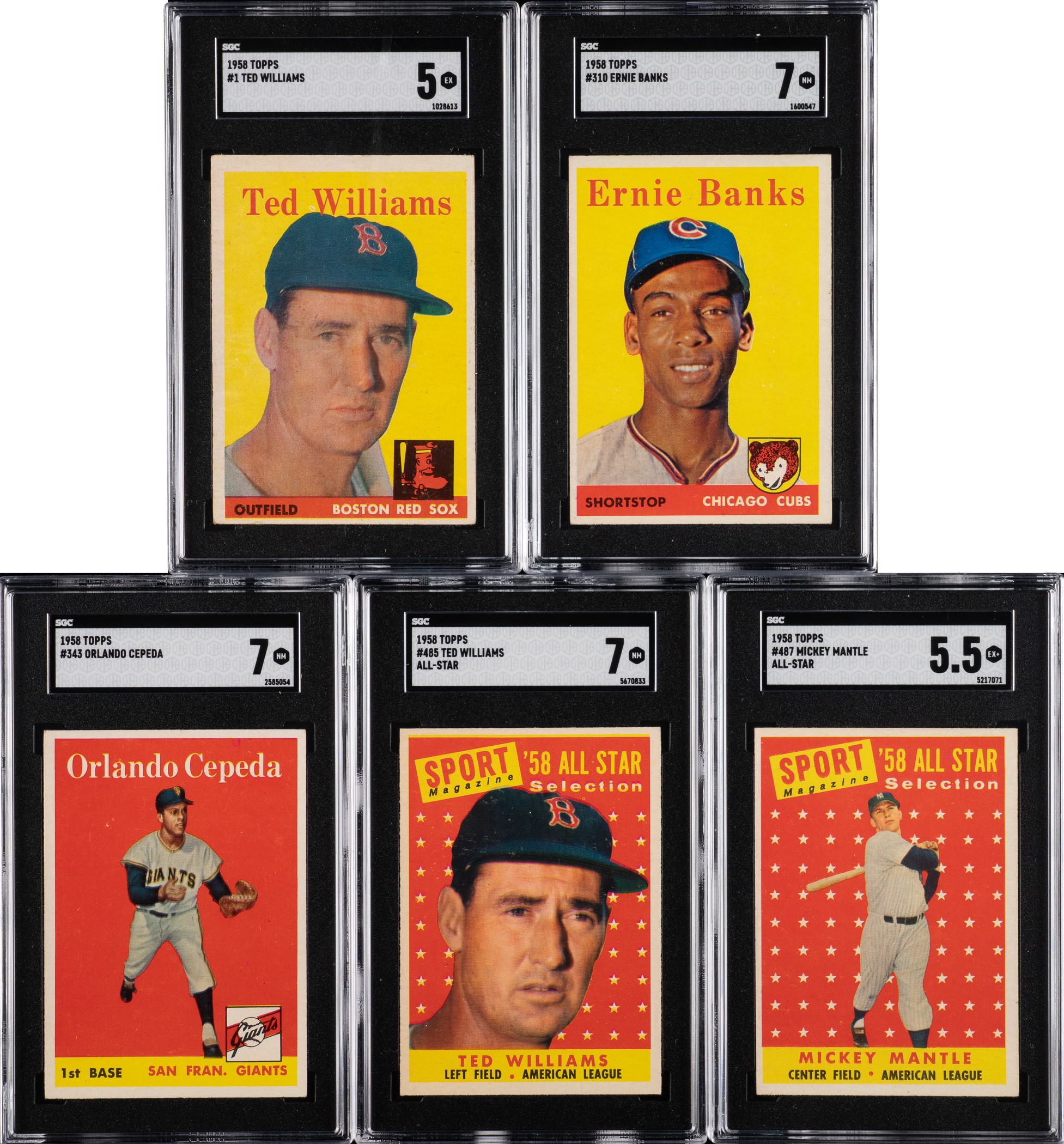 The classic 1958 Topps set features all the great stars of the era, in many cases more than once, because many stars appear again on special multiplayer cards or in the All-Star series (#476-494). Included are seven yellow-letter variations. Condition is 17% Ex-Mt to Nr/Mt, 73% Vg-Ex to Ex, and 10% Gd to Vg (including twelve lesser and a couple with a slight miscut). We have selected eight cards for grading and encapsulation by SGC. Keys: #1 Williams (EX 5), 5 Mays (EX+ 5.5), 25 Drysdale (Fr), 30 Aaron (Ex), 47 Maris RC (EX/NM 6), 52 Clemente (Ex), 70 Kaline (Vg-Ex+), 71 Dodgers Team (marked in pencil, otherwise Nr/Mt), 88 Snider (10/90 T/B, otherwise Ex), 150 Mantle (VG+ 3.5), 162 Hodges (Vg-Ex+), 187 Koufax (Ex+), 246 Yankees Team (small pencil mark on reverse, otherwise Vg+), 270 Spahn (Ex-Mt), 271 Martin (Ex-Mt), 285 F. Robinson (Ex), 288 Killebrew (Vg-Ex), 307 B. Robinson (10/90 L/R, otherwise Ex), 310 Banks (NM 7), 314 Snider/Alston (90/10 T/B, otherwise Ex-Mt), 320 Ford (Ex), 321 Williams/Klu (Ex), 343 Cepeda RC (NM 7), 351 Braves' Fence Busters (Vg-Ex), 370 Berra (Ex), 375 Reese (15/85 L/R, otherwise Ex-Mt), 418 Mantle/Aaron (15/85 L/R and T/B, otherwise Ex), 436 Mays/Snider (Ex), 440 Mathews (Ex+), 476 Musial AS (Vg), 485 T. Williams AS (NM 7), 486 Mays AS (Ex), 487 Mantle AS (EX+ 5.5), and 488 Aaron AS (Vg). Seven yellow-letter variations: #8 (Vg-Ex+), 11 (Ex), 13 Ex+), 60 (Ex), 79 D. Williams (Vg+), 97 (Vg-Ex+), and 100 Wynn (Ex). Very attractive and consistent mid-grade complete set of this classic 1950s issue. Total: 494 cards. Opening Bid $1,000.