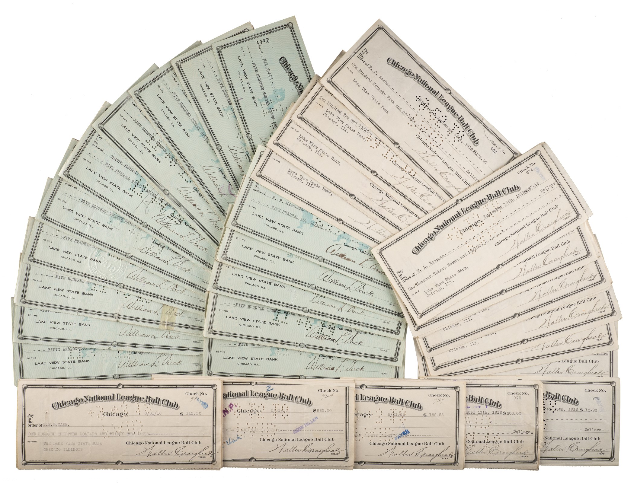 Collection of sixty-five Chicago Cubs payroll checks issued in 1918 and 1919. The signatures of two different Cubs front-office executives appear, respectively, on the front of the checks: Walter Craighead (all from 1918) and William Veeck (all from 1919). The signatures are scripted in either black fountain pen. The checks are made out to (and endorsed on the reverse by) the following players (breakdown by year): 1918 (40): Barber (8/31), two Deal (8/31 and 9/13), two Douglas (8/31 and 9/13), two Flack (8/31 and 9/13), three Hendrix (8/31 and two 9/13), two Hollocher (8/31 and 9/13), two Killefer (8/31 and 9/13), two Knabe (8/31 and 9/13), two Mann (8/31 and 9/13), two Martin (8/31 and 9/13), two McCabe (8/31 and 9/13), two Merkle (8/31 and 9/13), Mitchell (8/31), three O'Farrell (8/31 and two 9/13), three Paskert (8/15, 8/31, and 9/13), two Pick (8/31 and 9/13), two Tyler (8/31 and 9/13), Vaughan (9/13), Walker (8/31), two Wortman (8/31 and 9/13), and Zeider (9/13). 1919 (25): Bailey (10/28), Barber (10/28), Carter (10/28), Daly (10/28), Deal (10/28), Flack (10/28), Friberg (10/28), Hendrix (10/28), Herzog (10/28), Hollocher (10/28), Killefer (10/28), Lear (10/28), Magee (10/28), Mann (10/28), Martin (10/28), McCabe (10/28), Merkle (10/28), Mitchell (10/28 and 12/15), O'Farrell (10/28), Paskert (10/28), Pick (10/28), Robertson (10/28), Tyler (10/28), and Vaughn (10/28). The checks (8.25 x 3.75 inches) all have normal bank cancellation stamps and holes. Flaws included but not limited to: edge tears, folds, and creases. In Good to Very Good condition overall. This lot originates from the extraordinary collection of a longtime Chicago Cubs executive, Eldred "Salty" Saltwell, which is consigned to this auction by his family. The collection, which includes a remarkable array of contracts, checks, and other related documents and mementos, will be presented over a series of auctions and will offer publicly for the first time many significant items spanning decades of Chicago baseball. Total: 65 checks. Auction LOA from James Spence/JSA. Opening Bid $1,000.