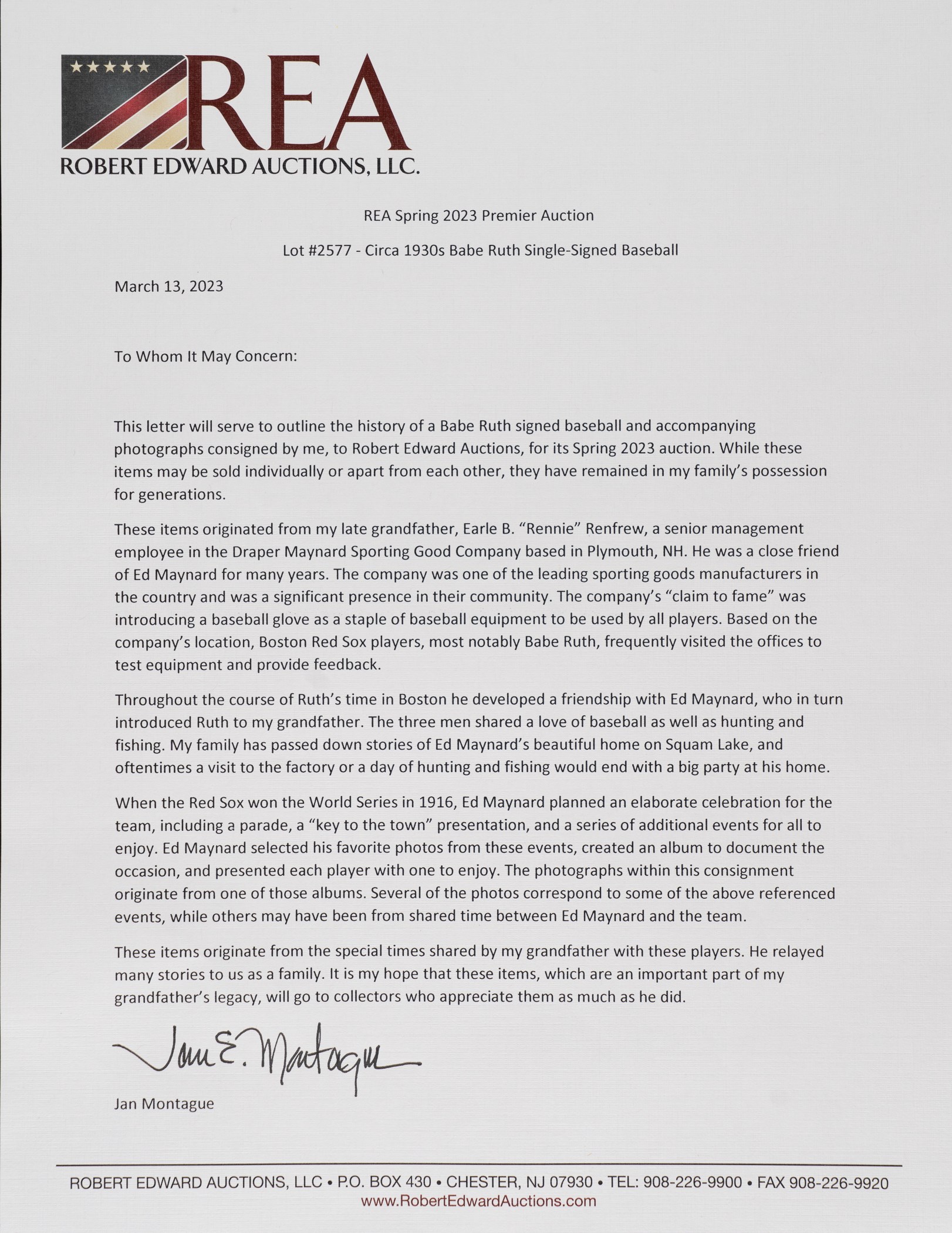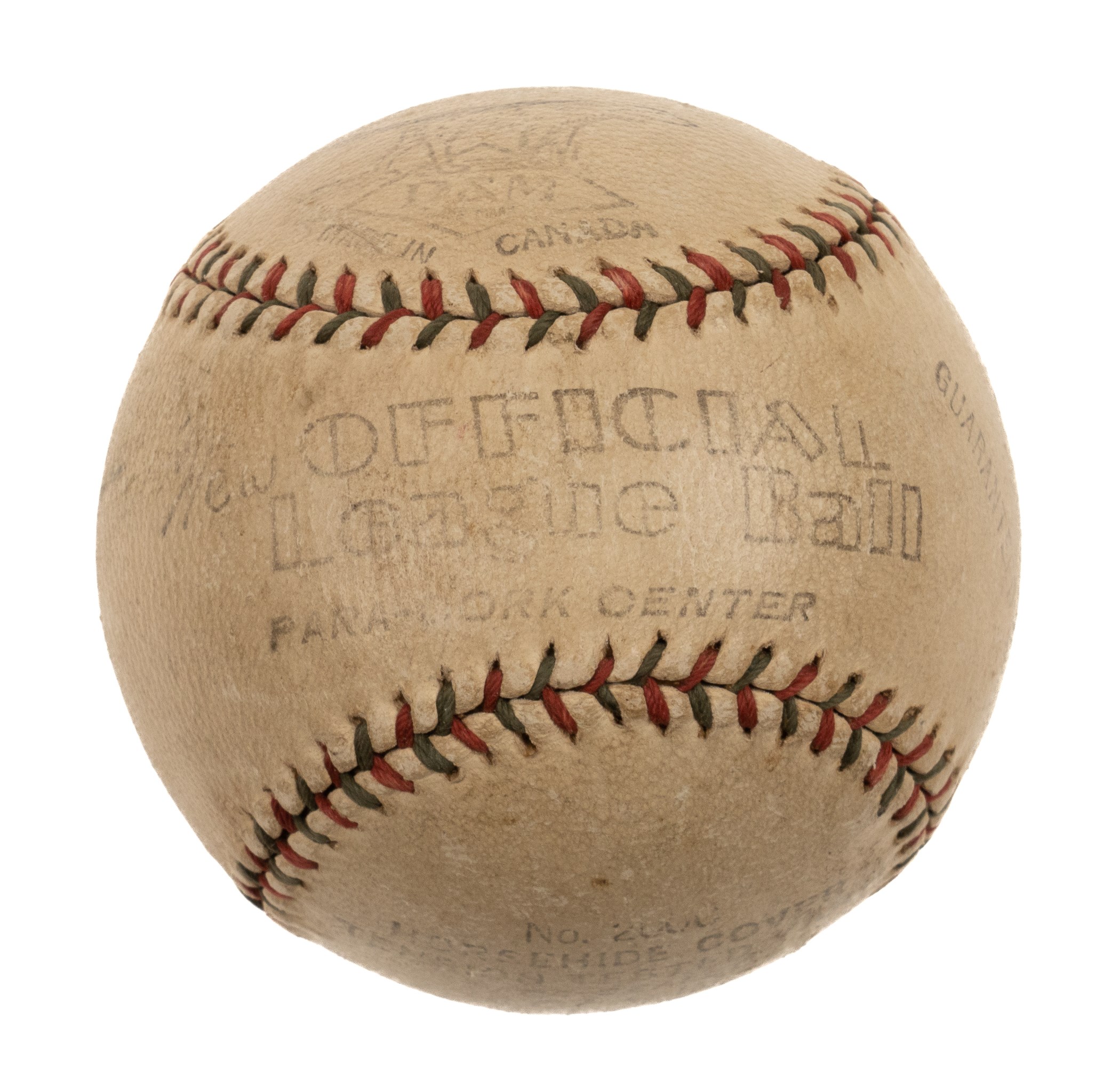 D&M "New Official League" baseball signed by Babe Ruth, who has scripted his name in blue fountain pen across the sweet spot. This ball most likely dates to the early 1930s manufacturing period. This ball (along with the additional nine lots in this auction) originates directly from our consignor's grandfather, who was an executive at the Draper & Maynard Company. The Draper & Maynard Sporting Goods Company, located in Plymouth, New Hampshire, was founded in 1881 and was one of the first companies to manufacture baseball gloves. Soon after, the company expanded its baseball line and became a major supplier to both amateur and professional clubs throughout the country. During the 1920s the company boasted that over ninety percent of Major League players used its gloves. D&M's close proximity to Boston also resulted in frequent visits to the factory by Red Sox players, including Ruth. The company remained in business until 1937, when P. Goldsmith Sons Company of Cincinnati, Ohio, purchased the rights to produce sporting goods under the D&M name. The ball is moderately toned and has a number of minor abrasions, as well as a few additional surface marks. In Very Good condition overall. Full LOA from James Spence/JSA. Opening Bid $2,000.