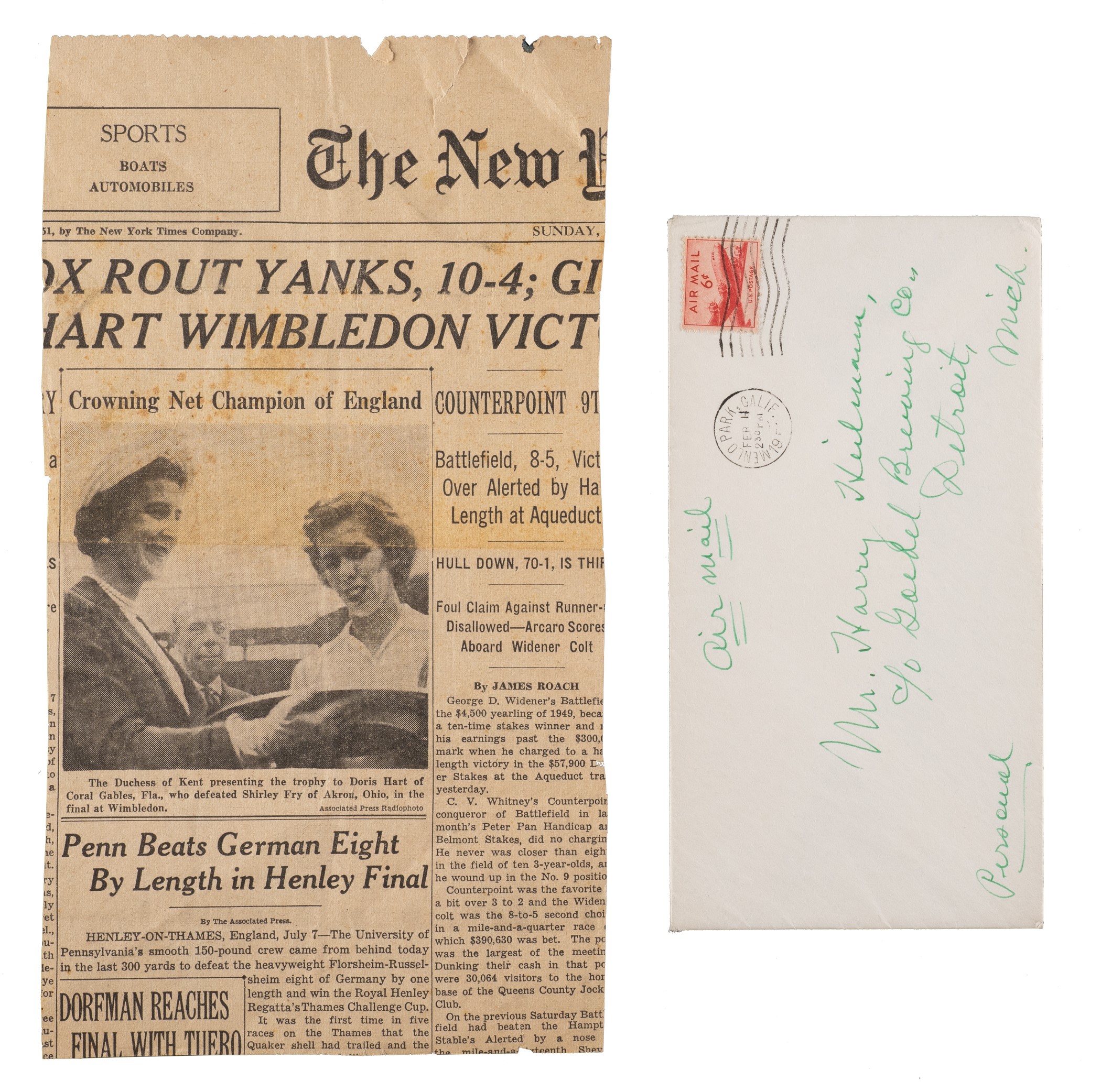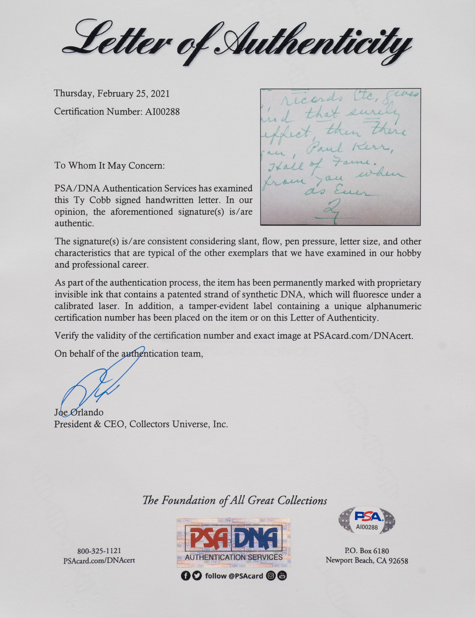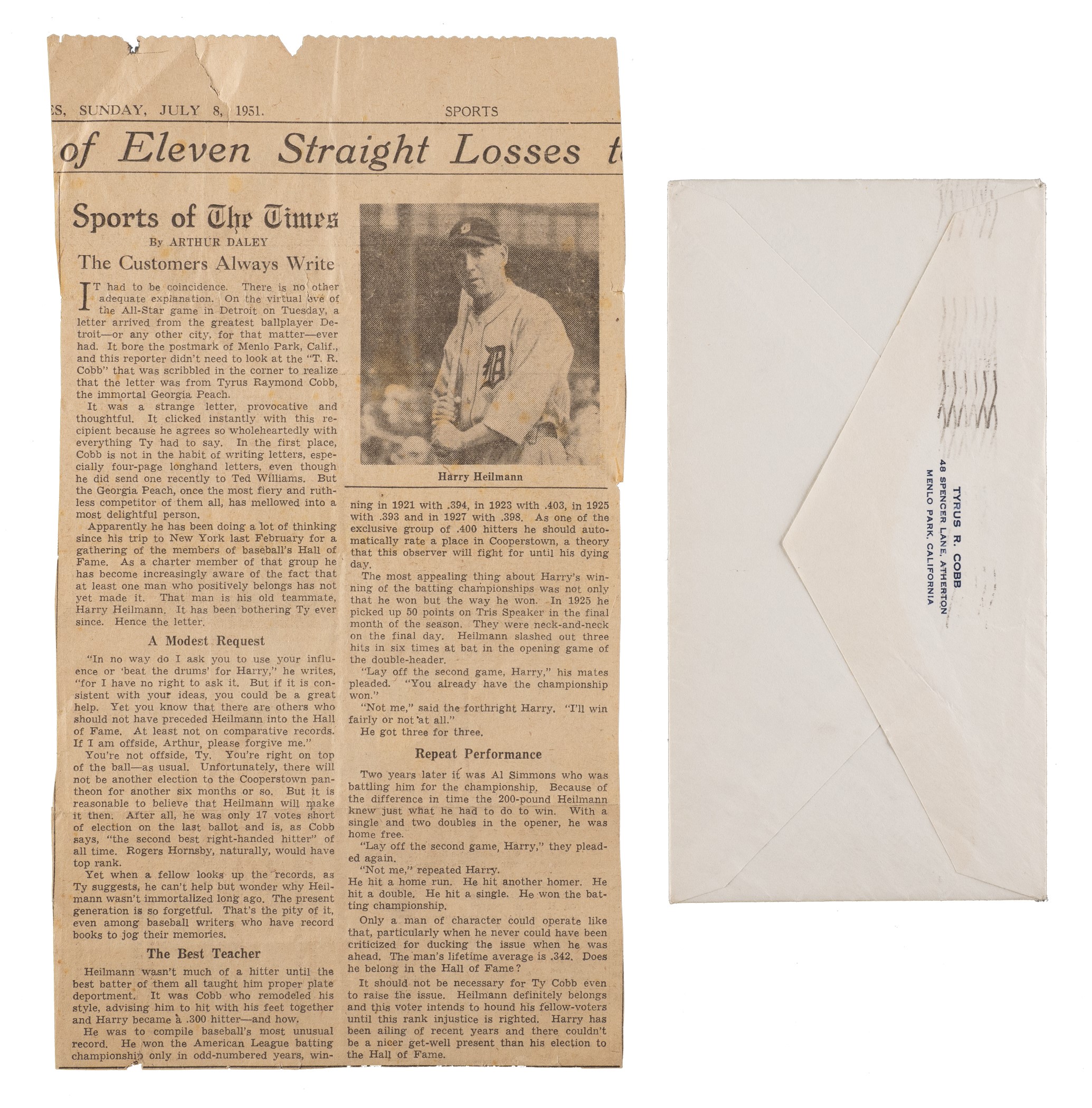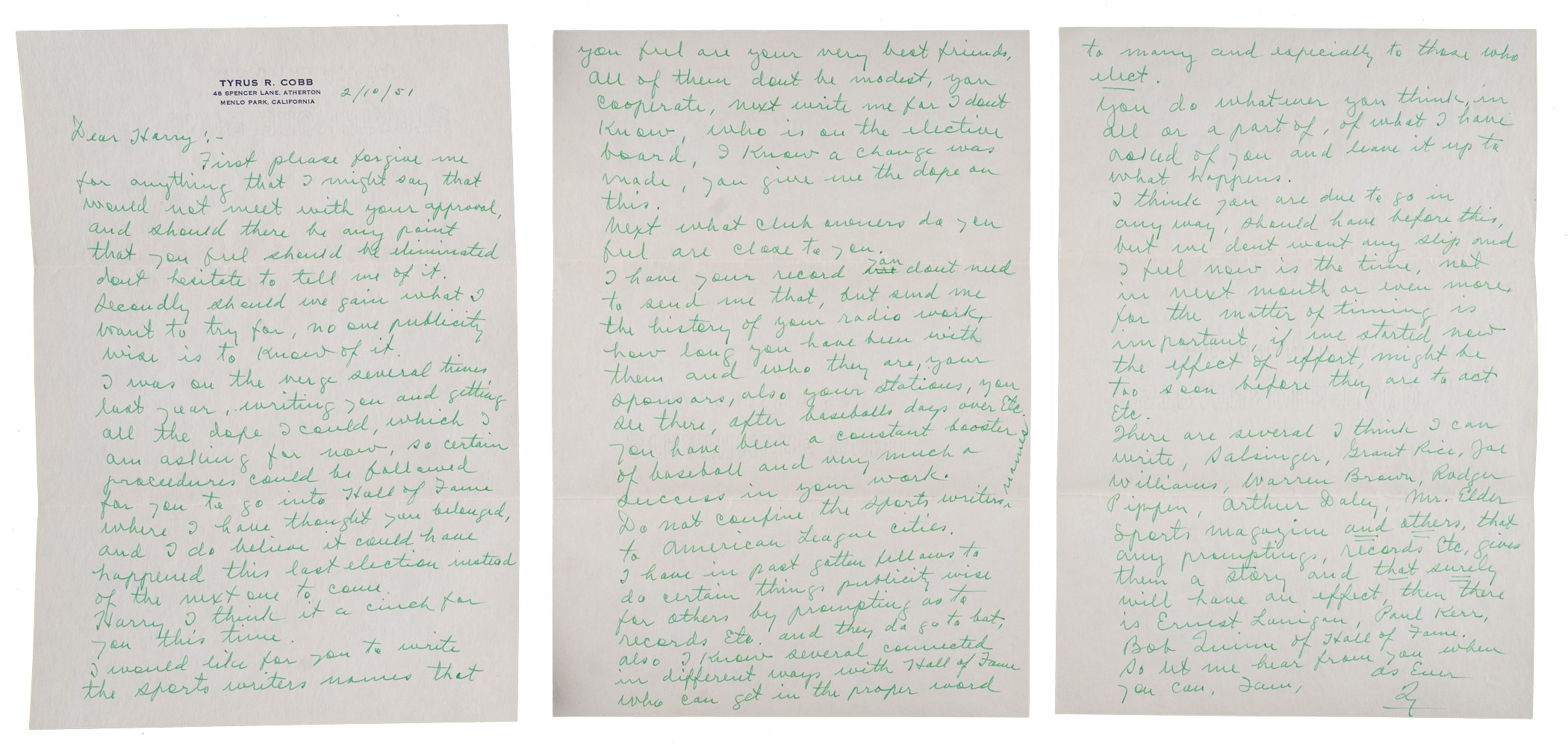 Three-page handwritten letter dated February 10, 1951, and signed by Hall of Fame outfielder Ty Cobb. In his letter, written on his personal stationery to former teammate Harry Heilmann, Cobb explains his efforts in trying to get Heilmann elected to the Baseball Hall of Fame. Both the text and Cobb's signature (first name only) have been scripted in his customary green ink. It seems almost hard to believe in this day and age that a player who led the league in batting four times, including one season in which he hit over .400, and finished his seventeen-year career with a .342 average, would have trouble making the Hall of Fame, but that was exactly the situation Heilmann found himself in at the time. Heilmann retired in 1932 and, incredibly, during his first nine years of eligibility (1937-1945) he never garnered more than fourteen votes! Sadly, the main reason Cobb was taking an active interest in Heilmann's election in 1951 was because Heilmann was suffering from cancer and did not have much longer to live. Even with Cobb's help, Heilmann fell seventeen votes short in 1951. Unfortunately, Heilmann died five months after Cobb wrote this letter. Perhaps Heilmann's death softened the hearts of some of the Hall of Fame voters, because the following year he was easily elected to the Hall, receiving the highest number of votes (203) of any candidate that year. Each page of the letter (7.25 x 10 inches) has two horizontal mailing folds. In Near Mint condition overall. The signature and all writing are essentially flawless. The letter is accompanied by its original mailing envelope (Very Good), addressed in Cobb's hand and postmarked "Feb 11, Menlo Park, Calif." Also accompanied by an original newspaper clipping, dated July 8, 1951, regarding Cobb's publicly known efforts to get Heilmann voted into Baseball's Hall of Fame. Total: 4 items (three pages, envelope, and newspaper clipping). Full LOA from PSA/DNA. Opening Bid $2,000.