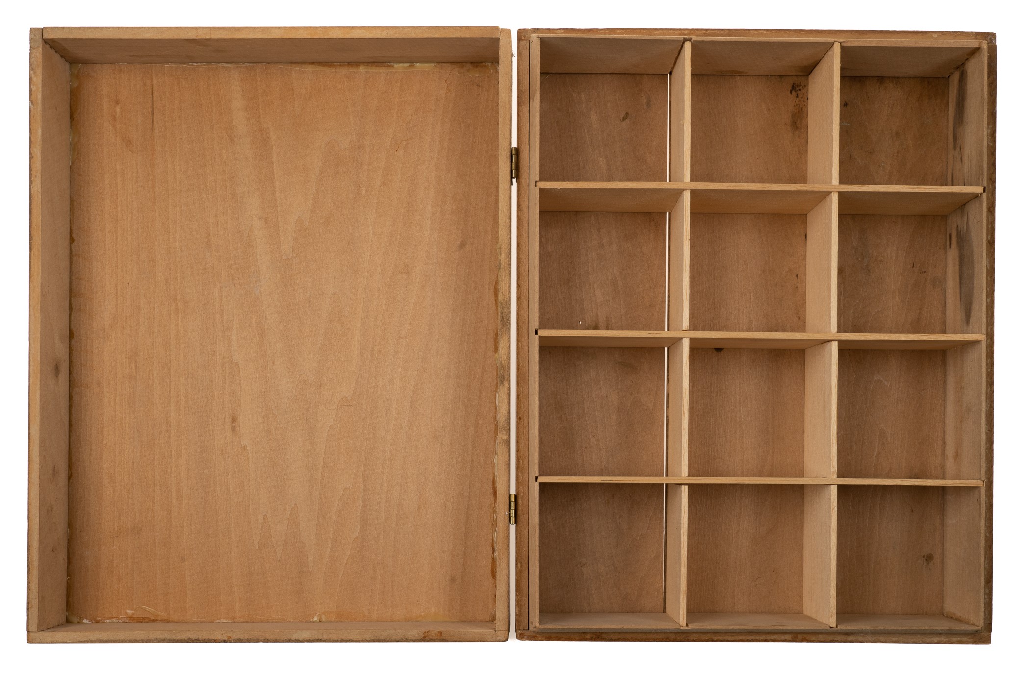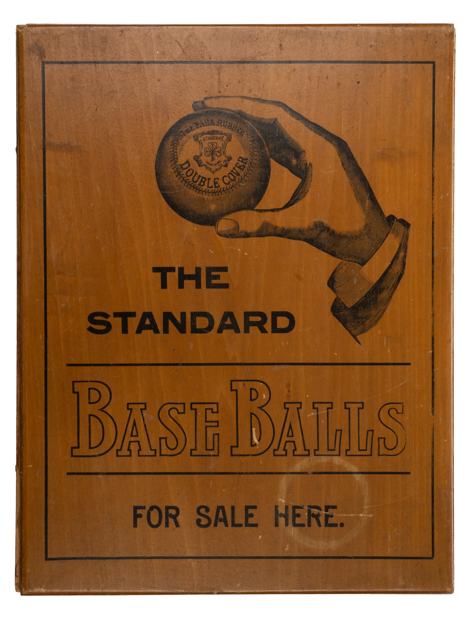 Extremely rare point-of-sale wooden display box for "The Standard Double Cover Baseball." This special display box was supplied to merchants by the manufacturer. The illustrated lid features a hand holding the "Double Cover" baseball, and the lettering below alerts patrons that "The Standard Base Balls For Sale Here." This is only the fourth example of this rare and very substantial display piece we have ever handled. The hinged lid opens to reveal twelve individual wooden compartments (delineated by interlocking wooden slats), that would have housed the balls (no balls are present with the box). Though the exact year of this box's manufacture is unknown, it almost certainly dates to the late nineteenth century, most likely circa 1890s. The box (9.75 x 12.75 x 3.25 inches) has moderate-to-heavy wear, including the center panel of the lid being reattached with glue. The bottom panel is split into two pieces and has been reattached with nails. In Fair condition overall. This is a rarely offered nineteenth-century baseball advertising display piece with a strong "old country store" appeal. Opening Bid $300.