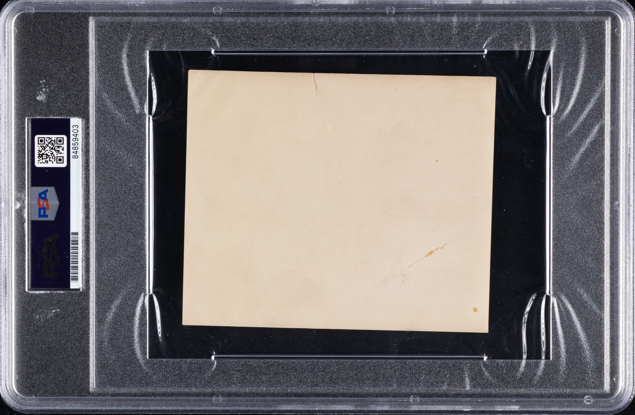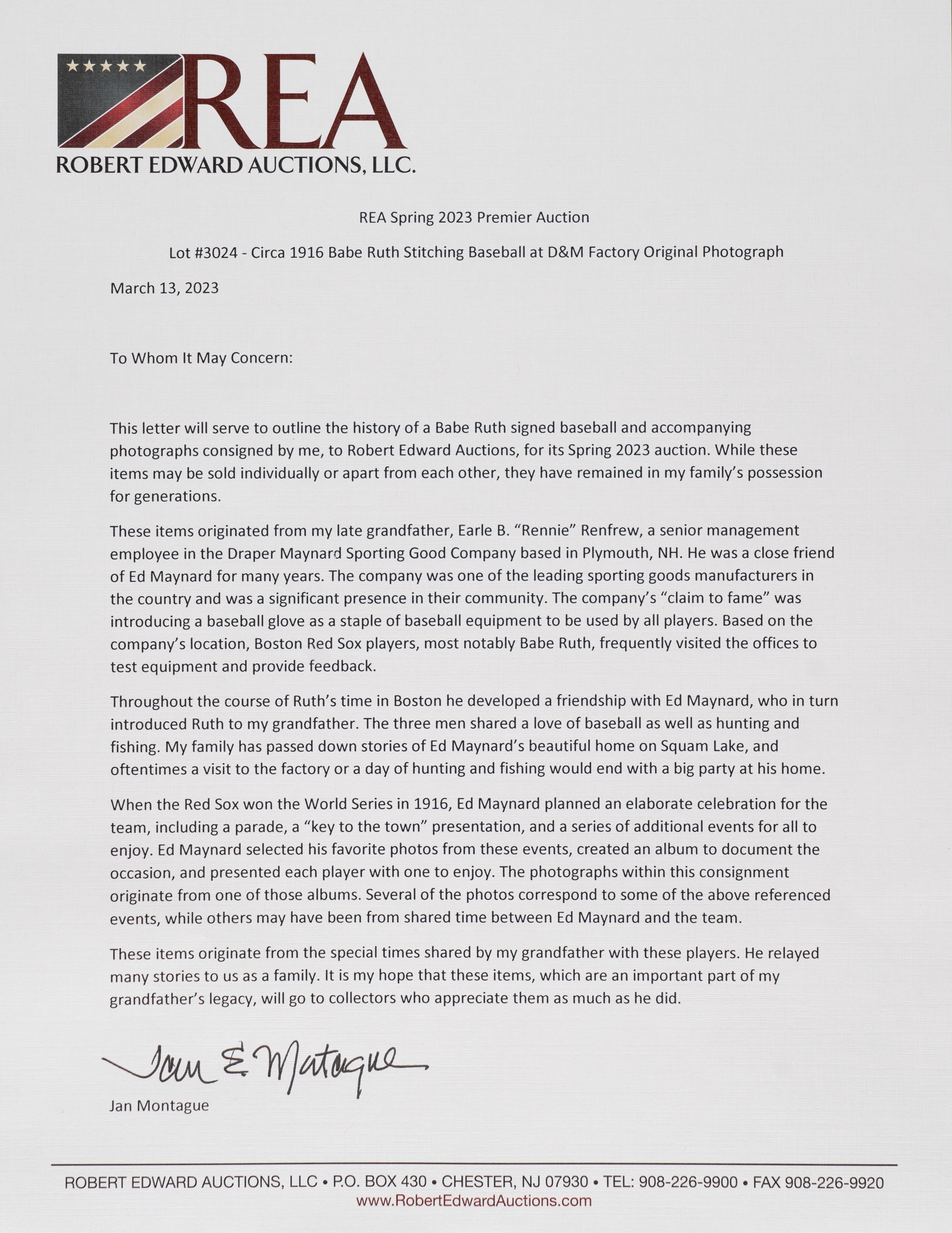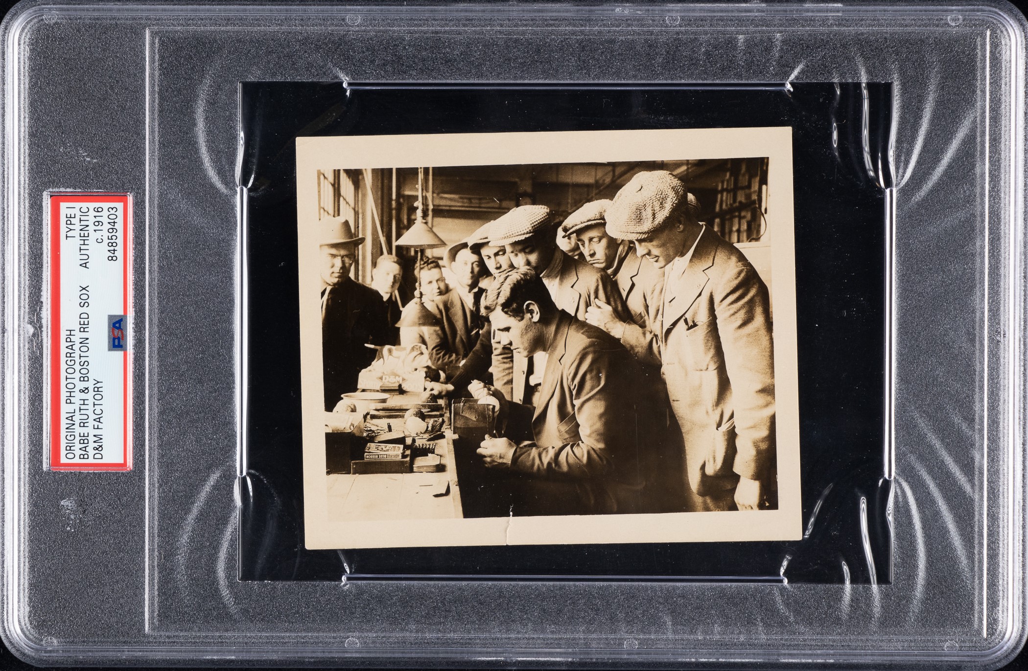 Extraordinary original photo of Babe Ruth posing with other members of the circa 1916 Boston Red Sox during their visit to the Draper & Maynard factory in Plymouth, New Hampshire. The candid photo is of Ruth assembling a baseball at the factory while a group of teammates admire his steady hand. Encapsulated and certified as an original Type I photograph by PSA/DNA. This photo (along with the additional nine lots in this auction) originates directly from our consignor's grandfather, who was an executive at the Draper & Maynard Company. Although the photo is undated, the players pictured played together on the Red Sox only in 1916 and 1917. The photo measures 5 x 4 inches and is a snapshot image that was used to assemble a presentation album (the original album is no longer included with this photo). These photo albums were distributed to the players (and likely executives/employees of the company). As a point of reference, REA sold an album from the Tillie Walker estate last year. The image has exceptional clarity, and aside from a few light creases and a small tear on the bottom edge, is in Excellent condition. Opening Bid $500.