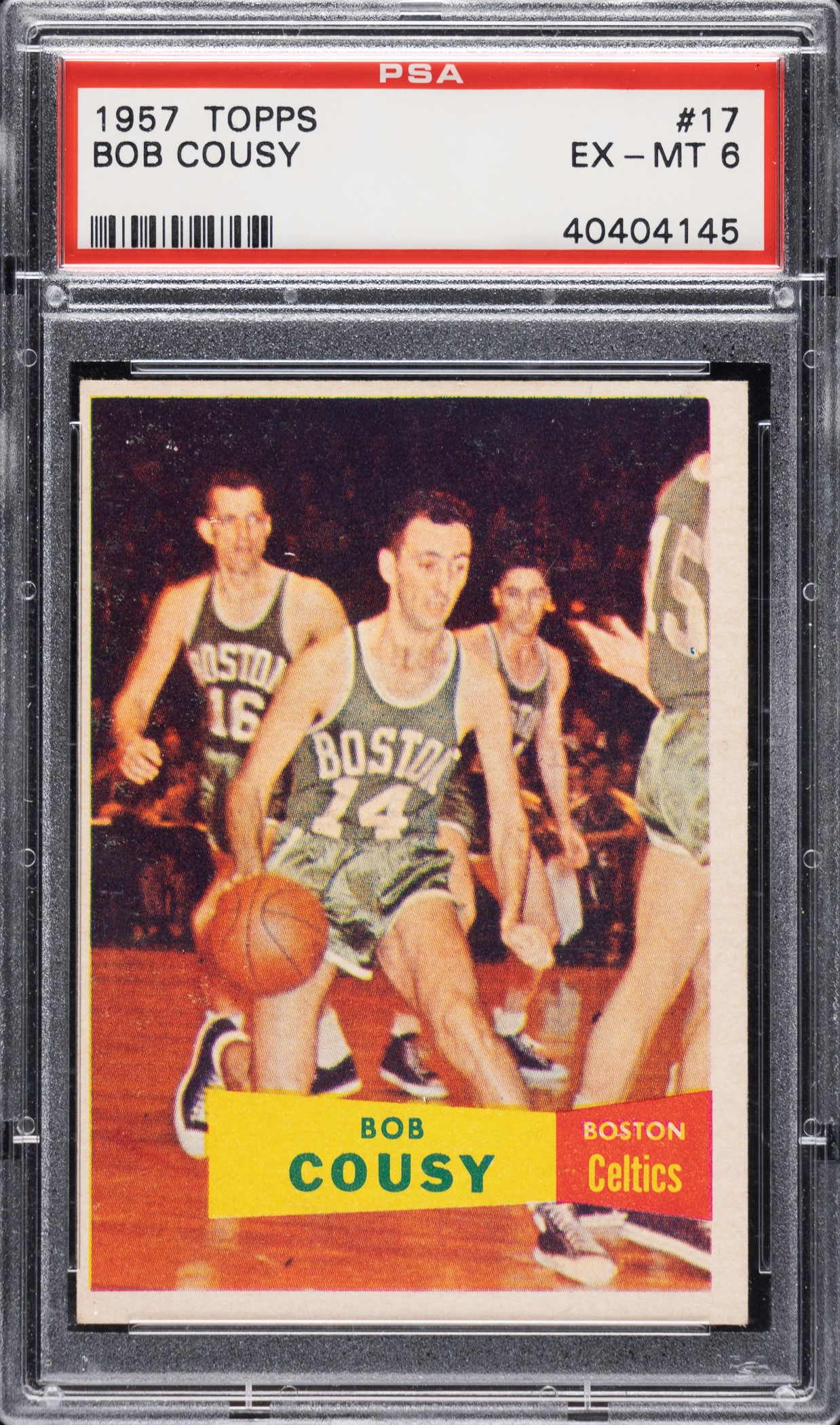 Graded EX-MT 6 by PSA. Beautiful example of Boston Celtics Hall of Famer Bob Cousy from the classic 1957-1958 Topps basketball series. This is Topps' first basketball set and the only one it issued in the 1950s. The set includes the rookie cards of all of the major stars of the era, and Cousy is one of the keys. The offered card boasts bright colors, a crisp image, strong corners, and centering toward the top left. Boldly printed reverse. 1957-1958 Topps basketball is well known for production-quality issues, making high-grade examples, especially of such a key card like Cousy, particularly scarce and desirable. This is a superb example of Cousy's rookie card and one that would be at home in a high-quality complete set, Hall of Fame, or important basketball-card collection. Opening Bid $500.