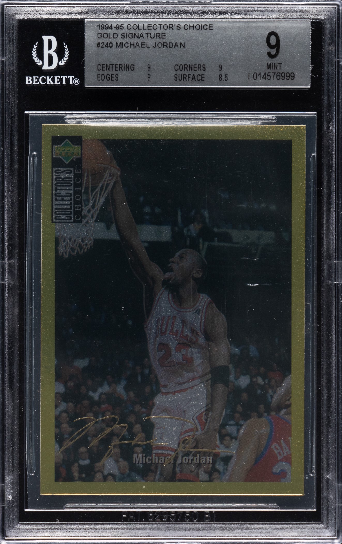 Graded MINT 9 by BGS. 1994-1995 Upper Deck Collector's Choice Basketball #240 Michael Jordan Gold Signature card. Gold signature cards #211-420 from this series were inserted in 1:35 Series Two Hobby/Retail packs and 1:20 Series Two Jumbo packs. Subgrades are 9 for centering, corners, and edges, and 8.5 for surface. This is an outstanding example of this rarely seen Michael Jordan parallel card. Opening Bid $200.
