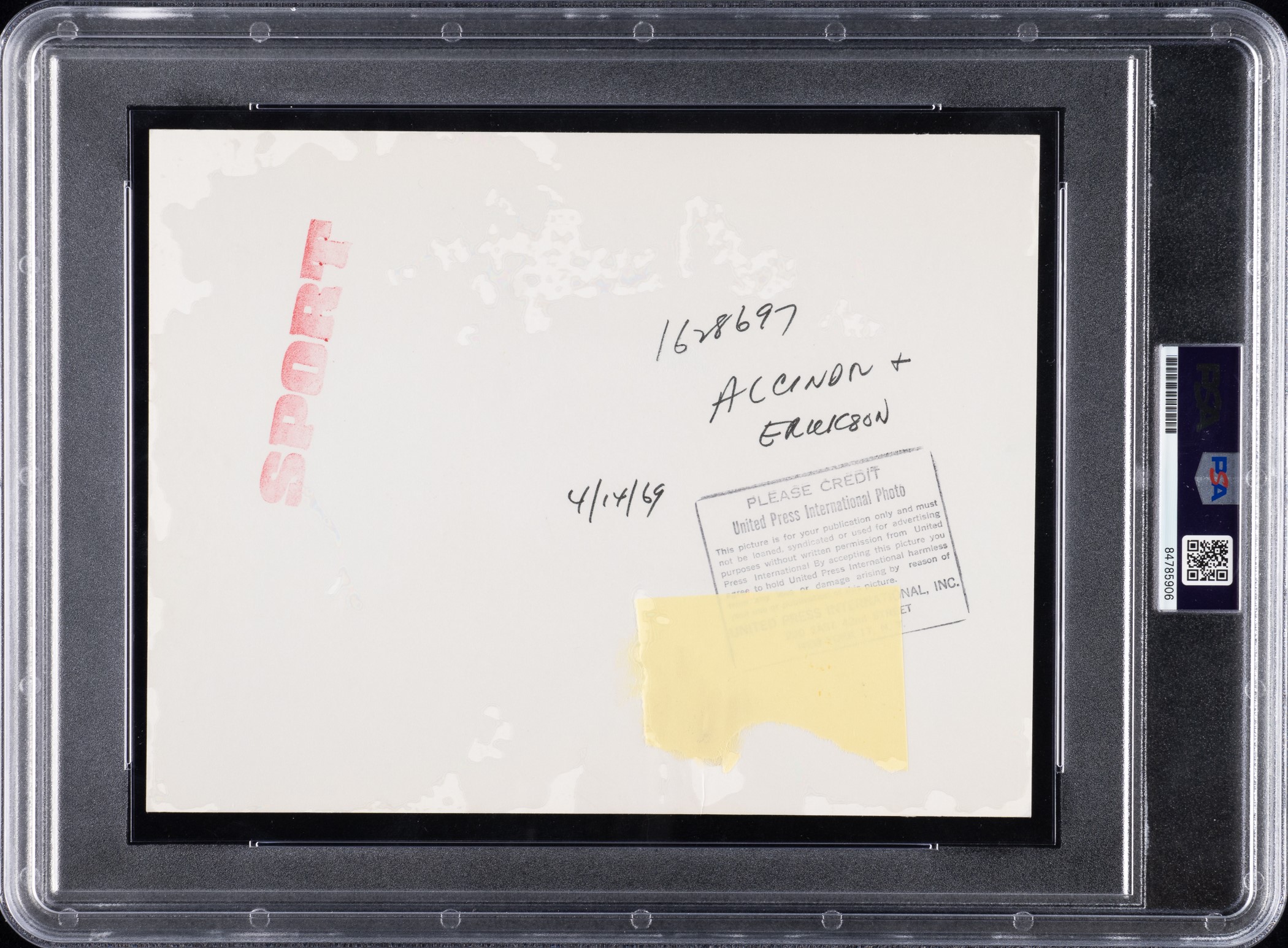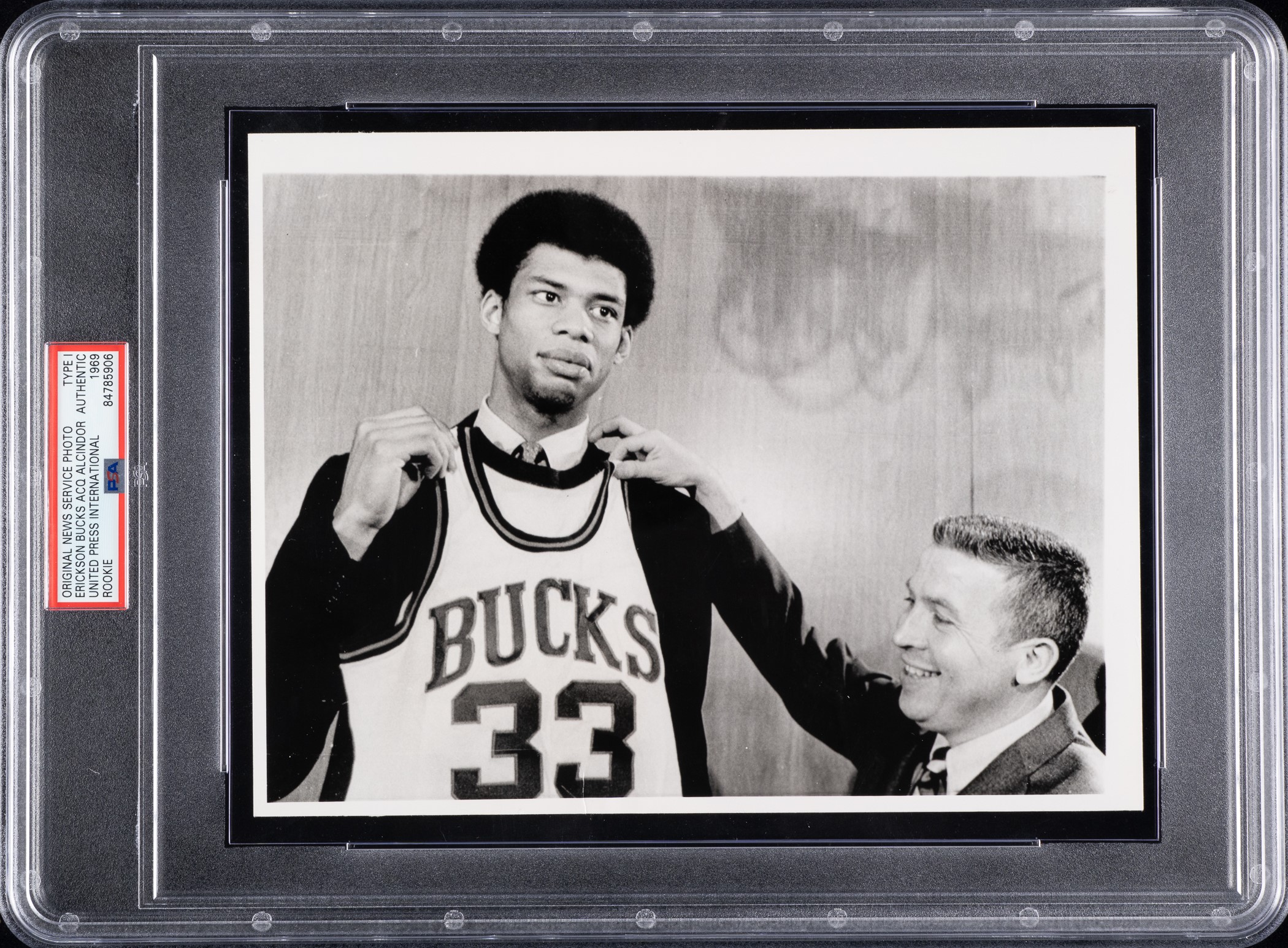 Original news photo of Lew Alcindor (Kareem Abdul-Jabbar) during the 1969 NBA draft, April 7, 1969. The historically significant photo features Alcindor being selected as the No. 1 pick of the draft by the Milwaukee Bucks. Certified as an original Type 1 photograph by PSA/DNA. The photograph pictures Alcindor and Milwaukee Bucks general manager John Erickson, as Erickson presents his newly acquired rookie with a team jersey. A "United Press International Photo" credit stamp appears on the reverse. The date "4/14/69" is noted in black ink on the reverse, along with the name identifications of "Alcindor & Erickson" and a red ink stamp that reads "Sport." Abdul-Jabbar is one of the greatest players in NBA history. Holder of numerous career records, he was elected to the Basketball Hall of Fame in 1995. The following year he was selected as one of the NBA’s 50 Greatest Players by a panel of experts. The photo (7.75 x 9.5 inches) has a small area of paper residue on the reverse and a few very light surface wrinkles (visible only when viewed at certain angles), which in no way detract from its overall Excellent appearance. Opening Bid $500.