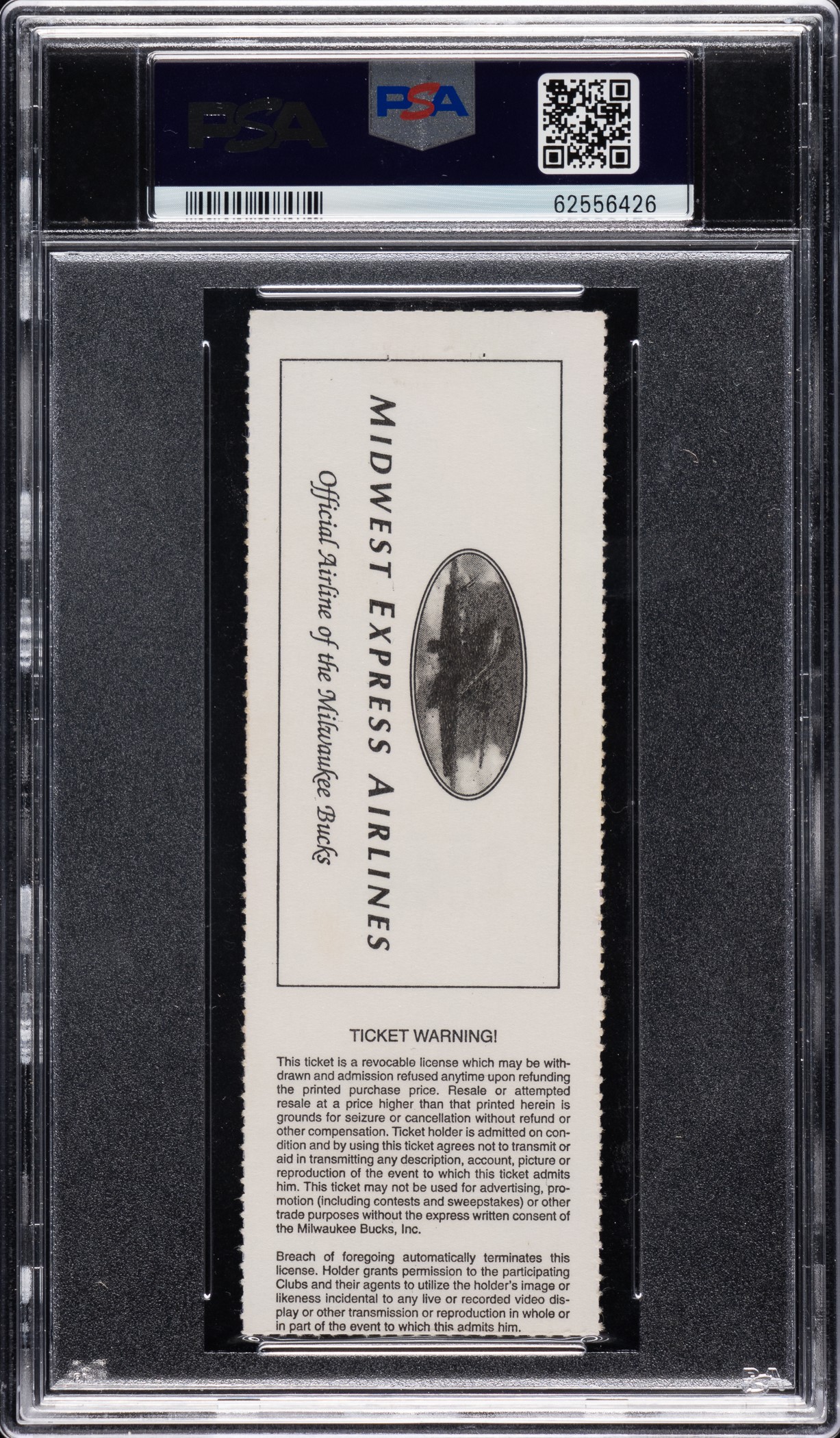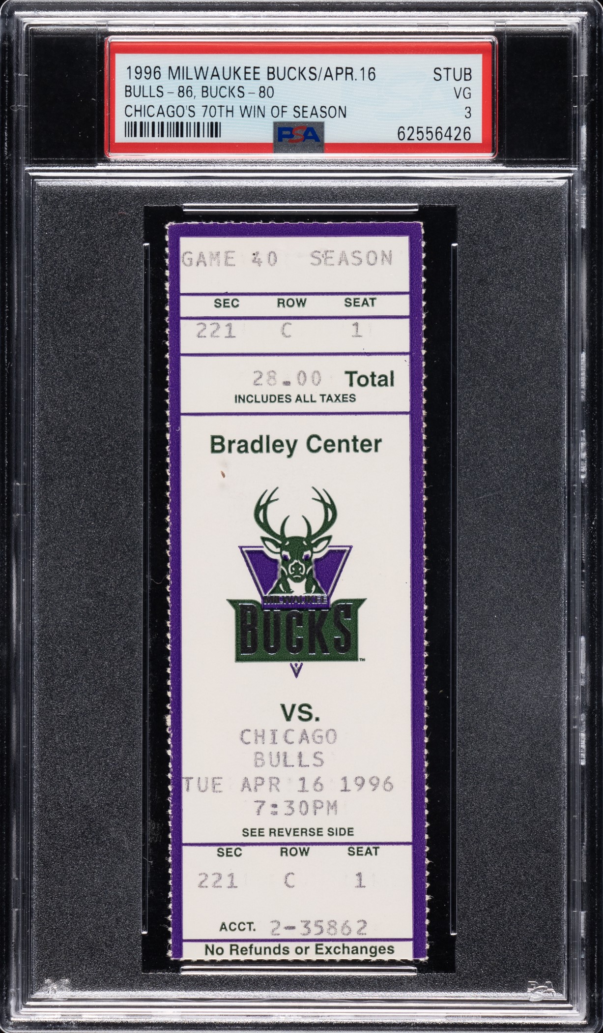 Graded VG 3 by PSA. Full ticket from the 1996 NBA game between the Milwaukee Bucks and Chicago Bulls held at the Bradley Center on April 16th. On this historic day, Michael Jordan and the Bulls won their record 70th game of the season, beating the Bucks 86-80. The victory marked the first time an NBA team would finish the regular season with 70+ wins. The Bulls finished the regular season with 72 wins and won the NBA Championship. The ticket has a pair of tiny holes near the top edge. Opening Bid $200.