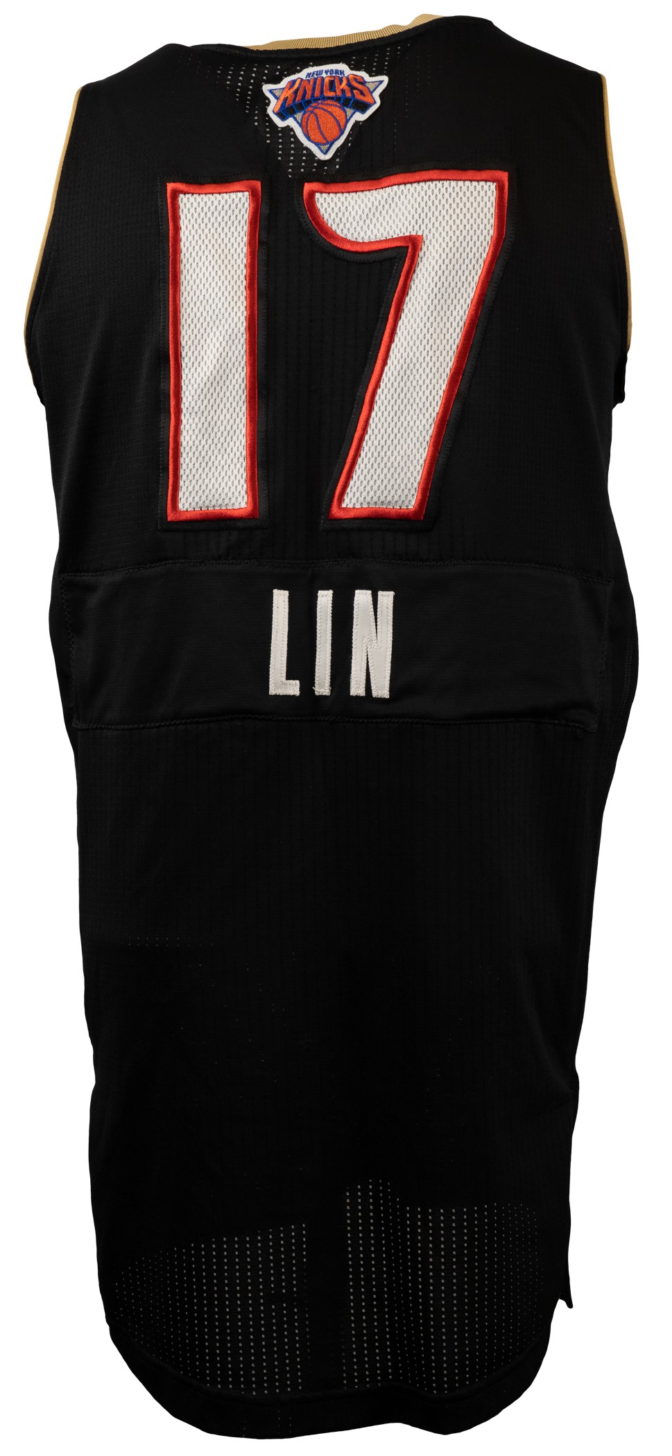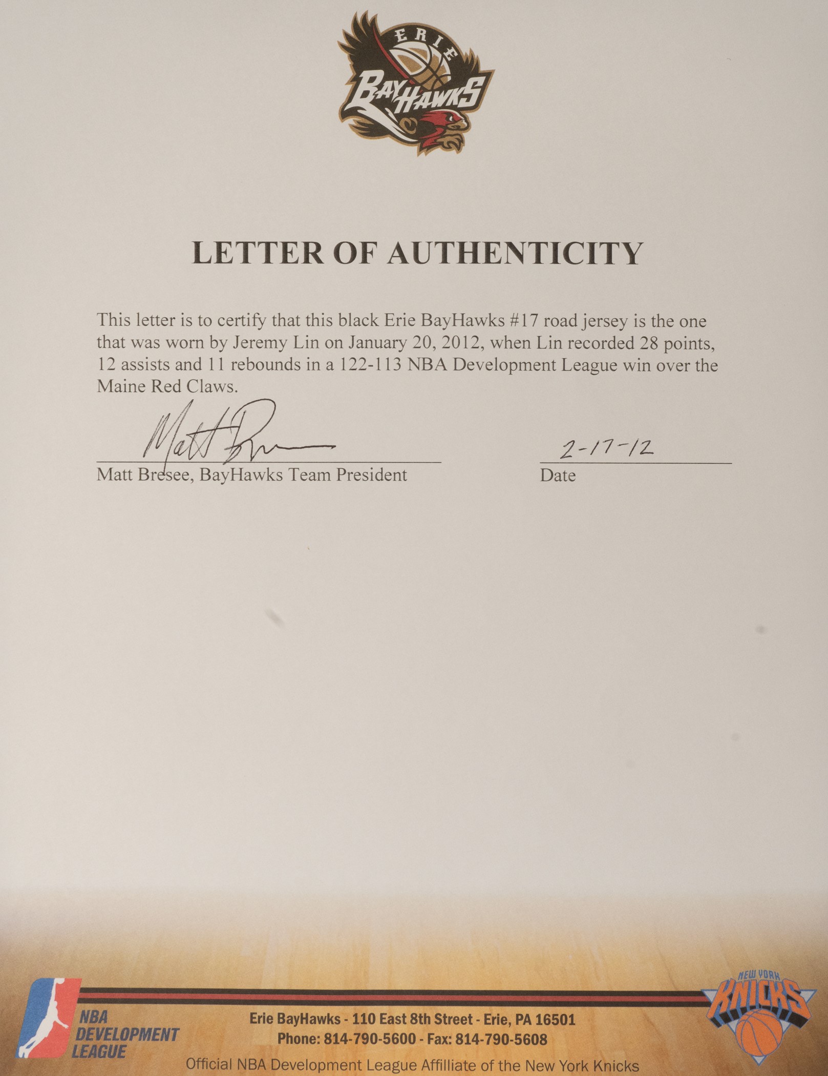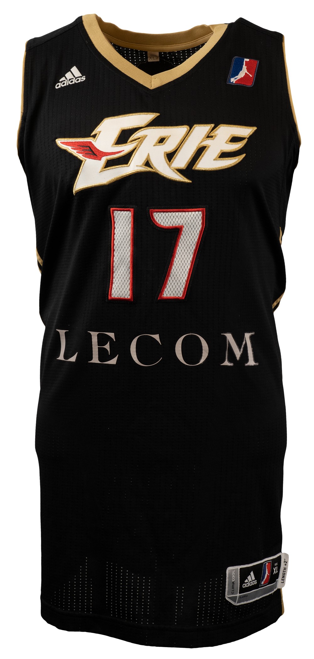 Erie BayHawks road jersey worn by Jeremy Lin on January 20, 2012, in a game against the Maine Red Claws. The black mesh jersey features "Erie and "Lecom" (the club's sponsor) across the front. The number "17" is featured on the front and reverse. "Lin" is lettered on the reverse directly below the number. An NBA Developmental League patch is affixed to the left breast, and an Addidas logo is visible on the right breast. The left front tail displays an "Addidas" size tag (XL) and a flag tail denoting "Length +2." Above Lin's number on the reverse is a New York Knicks patch, the NBA team that served as Erie's parent club that season. Original and unaltered, the jersey displays light use. Jeremy Lin had a tremendous game against the Maine Red Claws on January 20, 2012, finishing with 28 points, 12 assists, and 11 rebounds. Lin was called up three days later by the Knicks and the rest is history. Lin went on to play the best basketball of his career over the next few months, captivating the world during a period known as "Linsanity." Lin went on to finish the 2011-2012 NBA season averaging 14.6 points and 6.4 assists. This jersey is accompanied by a signed LOA from Matt Bresee, the BayHawks team president. Opening Bid $1,000.