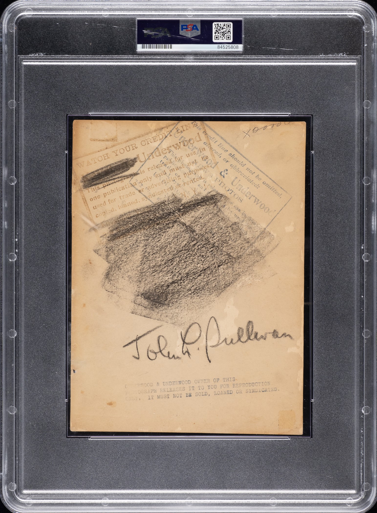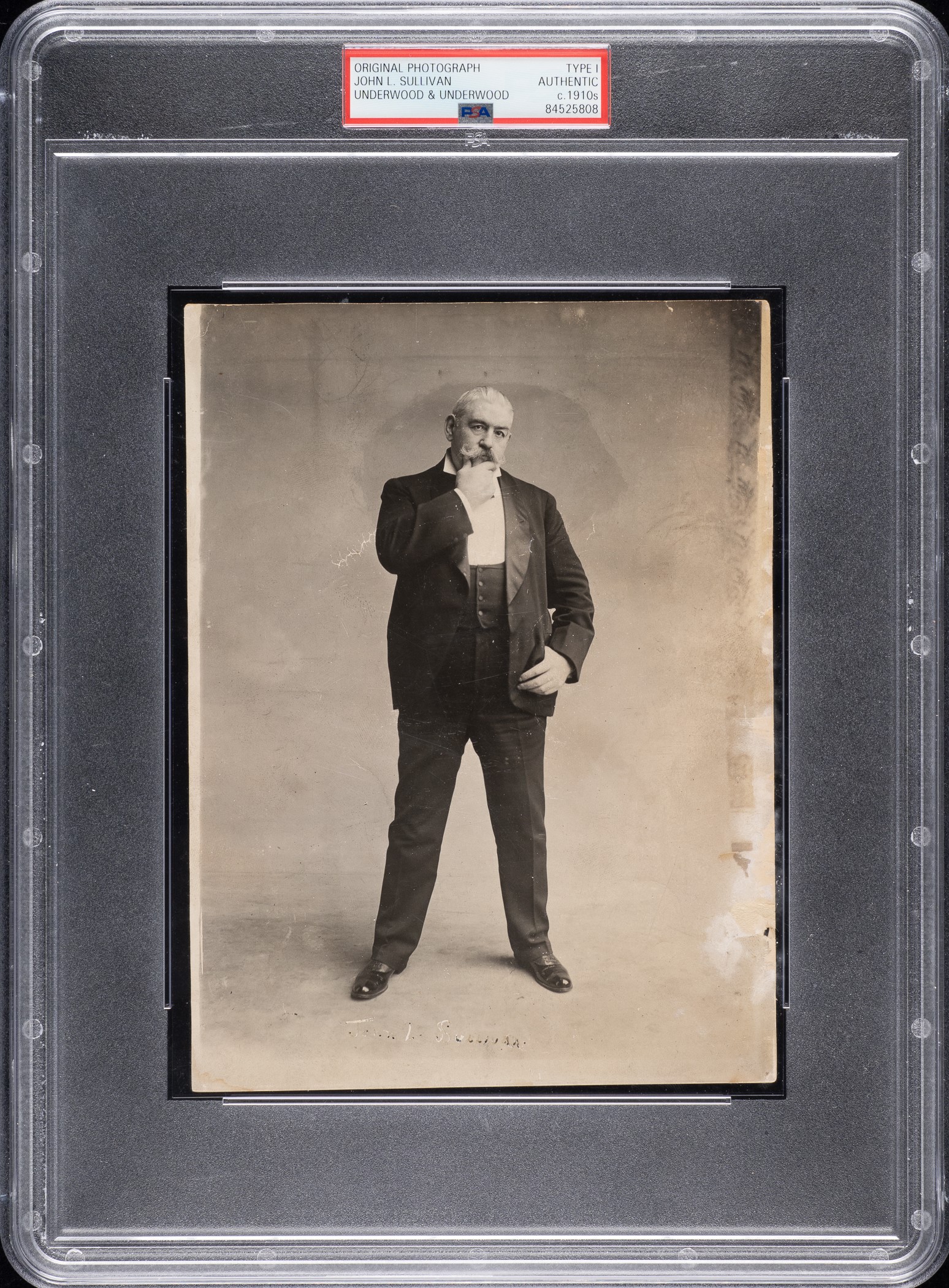 Original news photograph featuring legendary heavyweight boxing champion John L. Sullivan, circa 1910s. Encapsulated and certified as an original Type I photograph by PSA/DNA. The formal studio photograph pictures Sullivan in formal attire. A number of "Underwood & Underwood" credit stamps appear on the reverse, along with Sullivan's name. John L. Sullivan is generally regarded as the first undisputed heavyweight champion in boxing history, having gained the unofficial title in 1882 after defeating Paddy Ryan. Sullivan successfully defended his title for ten years before losing by knockout in the twenty-first round to Jim Corbett. The photo (6 x 8 inches) has paper loss along the right border and light creases. Sullivan's name is etched along the base of the photo. In Good condition overall. Opening Bid $200.