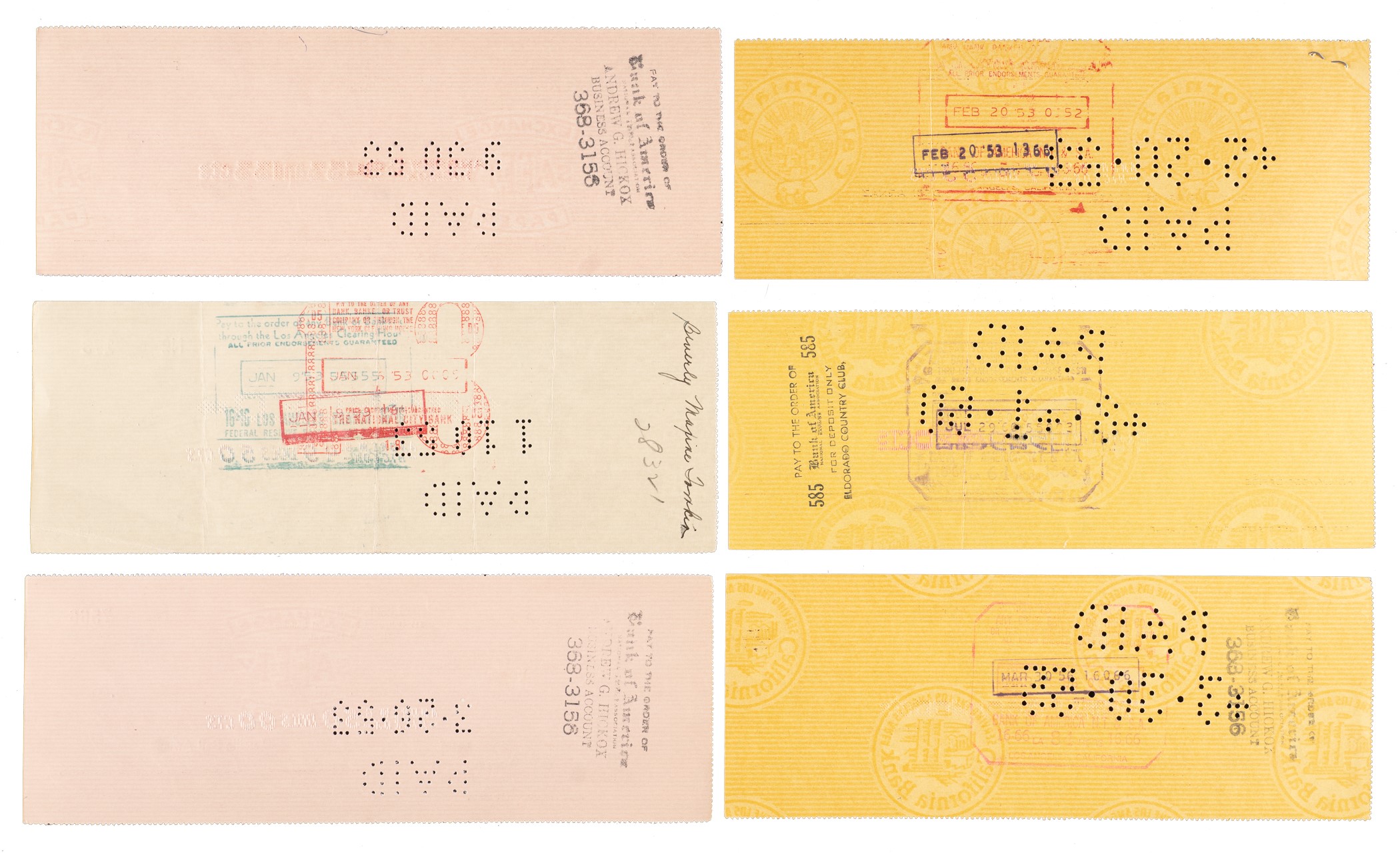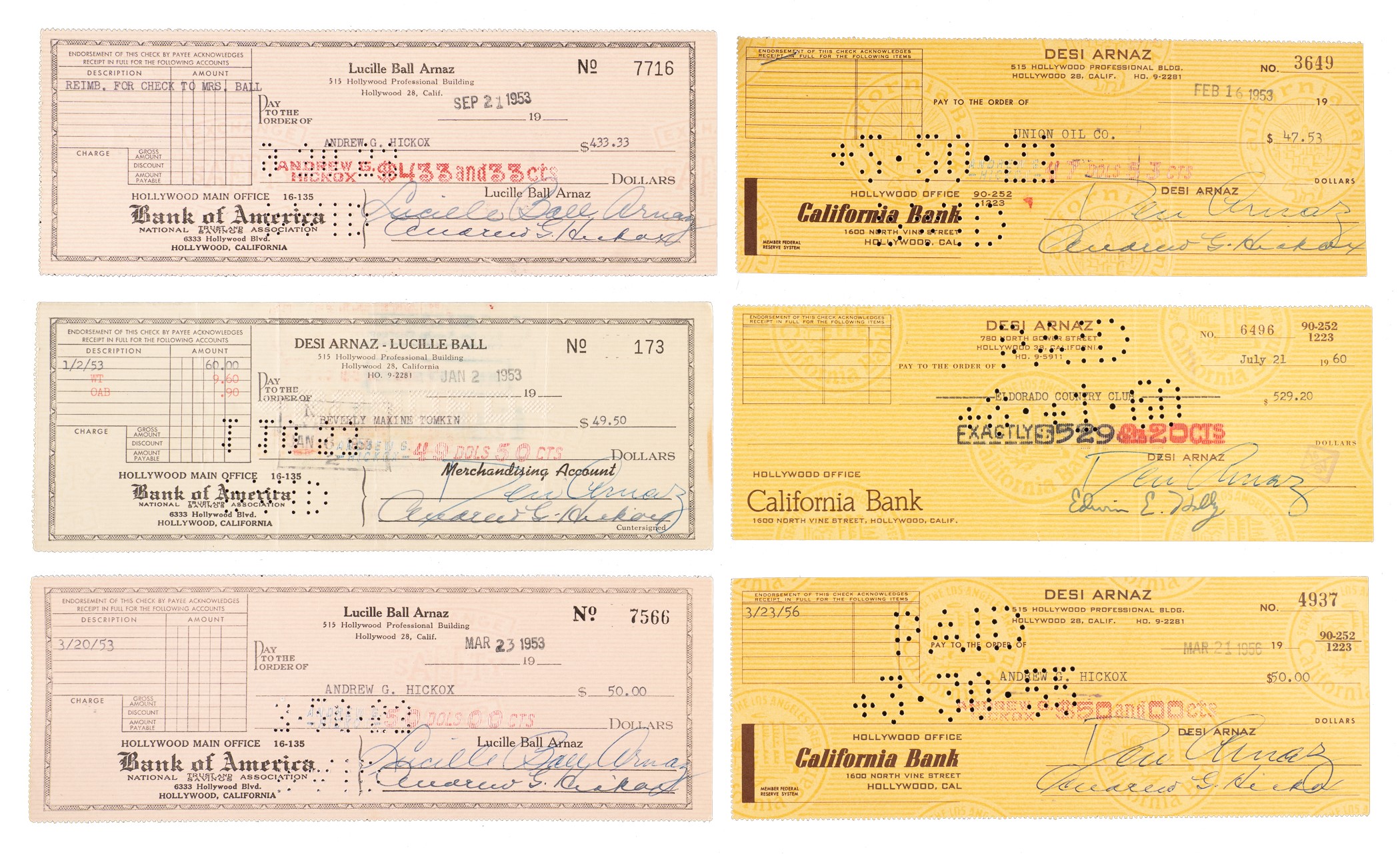 Collection of six Lucille Ball (2) and Desi Arnaz (4) personal checks signed, respectively, by Lucille Ball (1911-1989) and Desi Arnaz (1917-1986), the real-life husband and wife stars of the I Love Lucy show. The signatures are scripted in blue ballpoint pen. Four checks are dated from 1953 (two Lucille Ball and two Desi Arnaz), one from 1956 (Desi Arnaz), and one from 1960 (Desi Arnaz). One check has the names of both "Lucille Ball Arnaz" and "Des Arnaz," along with the address of their Hollywood office, printed along the top border. The remaining checks have just one name and their office address printed along the top border. The checks (8-1/2 x 3-1/8 inches and 8 x 3 inches) all display normal bank cancellation stamps and holes. Flaws included but not limited to are folds and creases. In Very Good to Excellent condition overall. Total: 6 checks. Auction LOA from James Spence/JSA. Opening Bid $100.