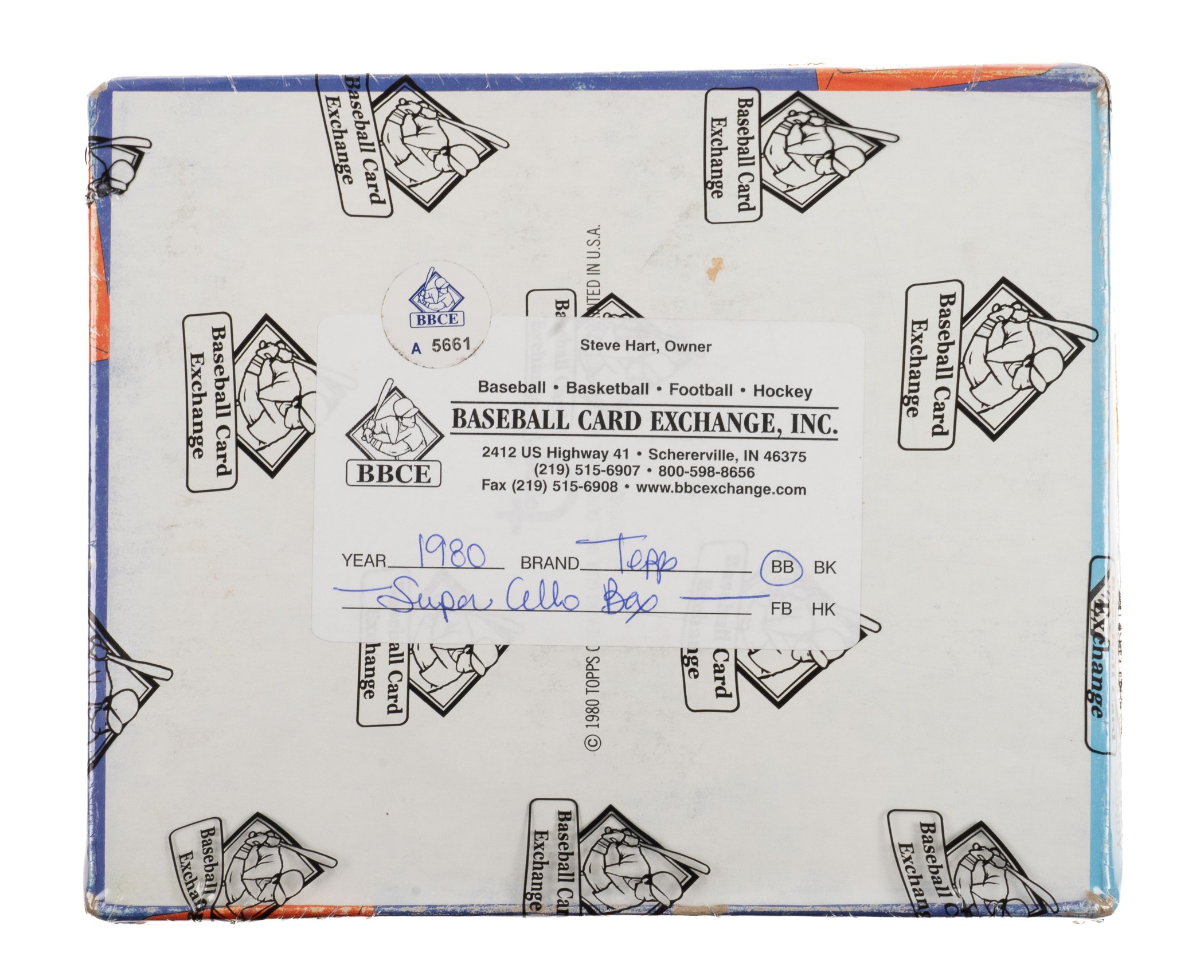 Complete, original unopened "Super" cello box of 1980 Topps baseball. The box houses twenty-four cello packs, with each pack containing twenty-eight cards, for a total of 672 cards. The 1980 Topps set includes the rookie card of Rickey Henderson, and many other Hall of Famers including Nolan Ryan, George Brett, and Ozzie Smith. All the other stars of the day are also included. While it is impossible to provide guarantees with reference to grading of unopened material, there is, of course, the very real possibility that within this box are Gem Mint cards. The store display box shows moderate shelf wear, including a piece of clear tape affixed to the top lid with the year "1980" written in black ink. All four seams are secured with clear tape, with two seams on a side panel split. The box comes shrink-wrapped by Baseball Card Exchange (owned by Steve Hart, the foremost expert on unopened material). A desirable unopened box from this popular 1980 baseball set! Opening Bid $500.