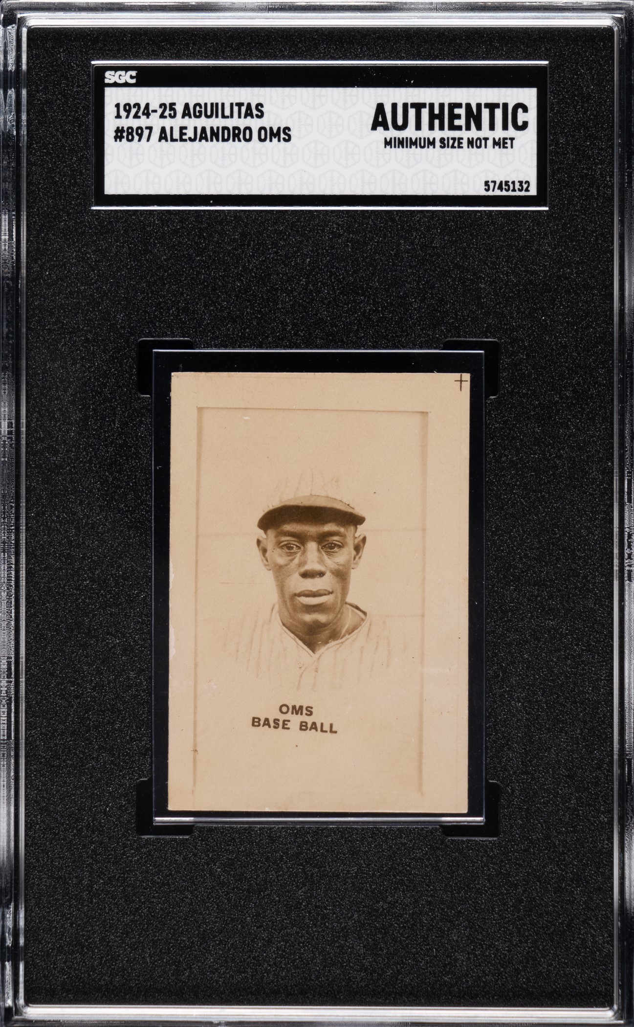 Rare 1924-1925 Aguilitas Segundas card of outfielder Alejandro Oms. One of the rarest of all Cuban card issues is the Aguilitas Segundas tobacco set issued in 1924-1925. This set includes many Negro Leaguers who played in the Cuban Winter League, including several major stars who appear in very few sets. This is one of the key cards from this rare set and one of only several examples known to exist of Oms, featuring him as a member of the "Santa Clara B.B.C." Aguilitas cards feature striking real-photo style images with advertising on the reverse. This outstanding rarity is exceptionally clean and attractive with a bold image (which can vary from card to card in this series). The corners have light wear, and the image is centered toward the bottom left. Encapsulated as Authentic by SGC (submitted by REA) due to "minimum size not met." This is a very attractive example of this extremely rare issue featuring one of the all-time great Negro League stars. Opening Bid $500.