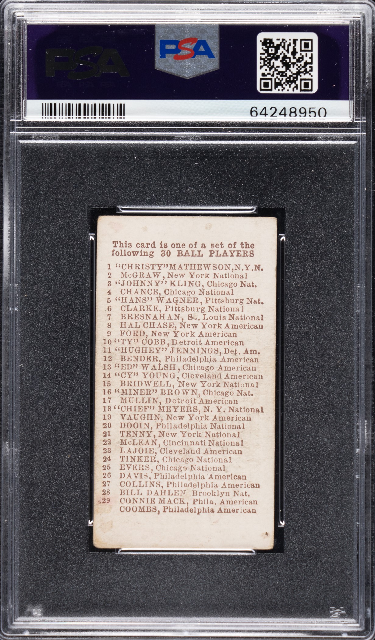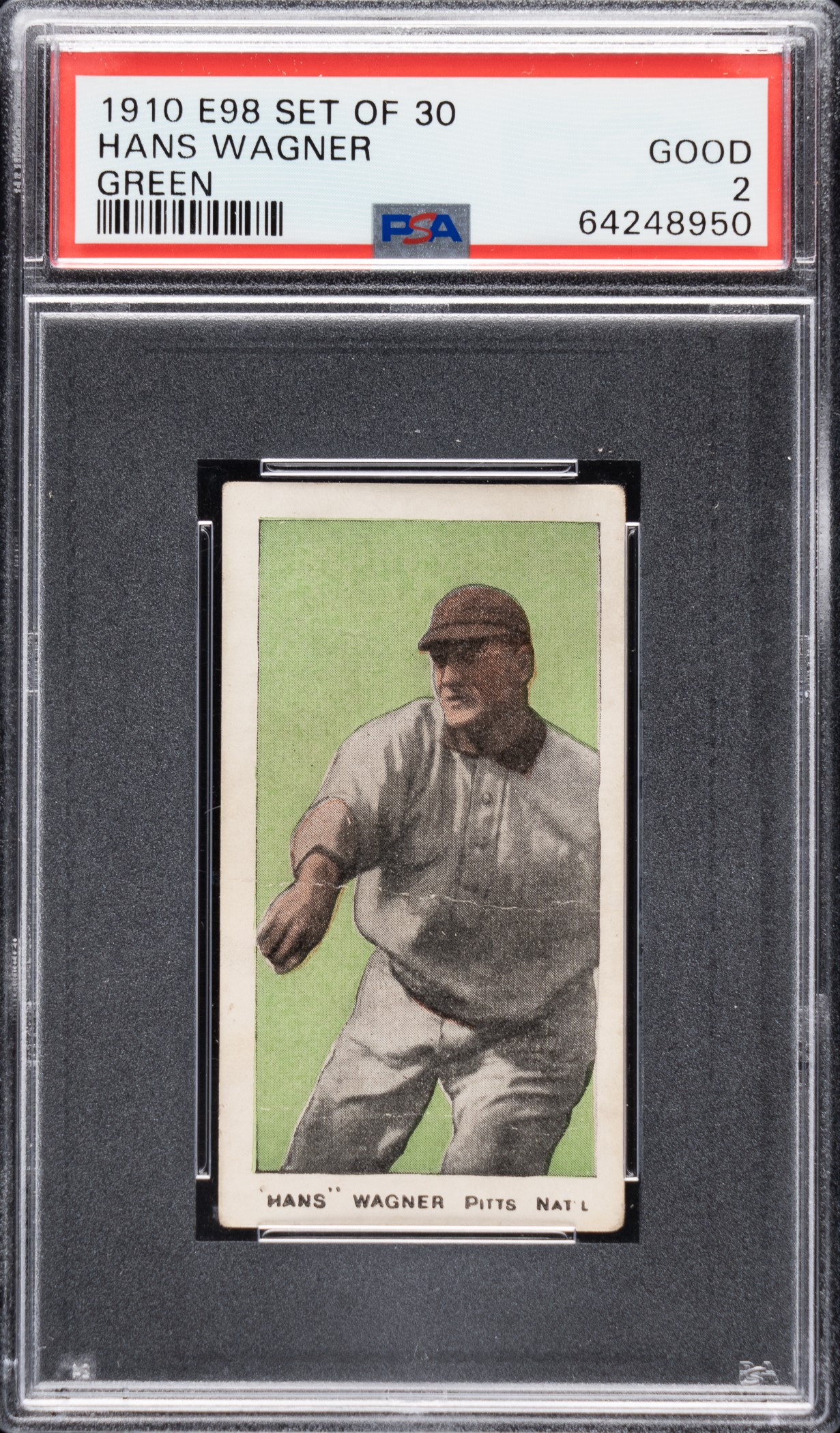 Graded GOOD 2 by PSA. Modestly graded example of Hall of Famer Honus Wagner from the E98 “Set of 30” candy-card issue. The manufacturer of E98 is unknown, and the set might be easily confused with other caramel-card sets of the era (E93 and E94 specifically). This is an entirely different set even though it uses many of the same subjects and poses. For many years, E98s were among the scarcest of the 1910-era caramel cards, but the “Black Swamp Find” changed the population dramatically. E98s have always been very desirable, and their increased availability and noteworthiness due to the find may have actually increased the demand as more collectors have become familiar with the set. The offered card has a brilliant green background, a crisp image, honest corner wear, and centering toward the right. Unobtrusive light creasing and soiling along the checklist reverse factor into the assigned grade. This is a very presentable lower-grade example of key Hall of Famer Honus Wagner from this extremely desirable early twentieth-century candy issue. Opening Bid $500.
