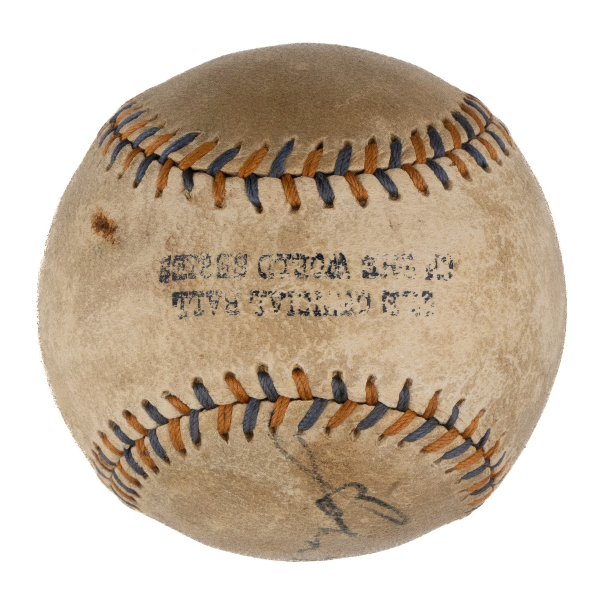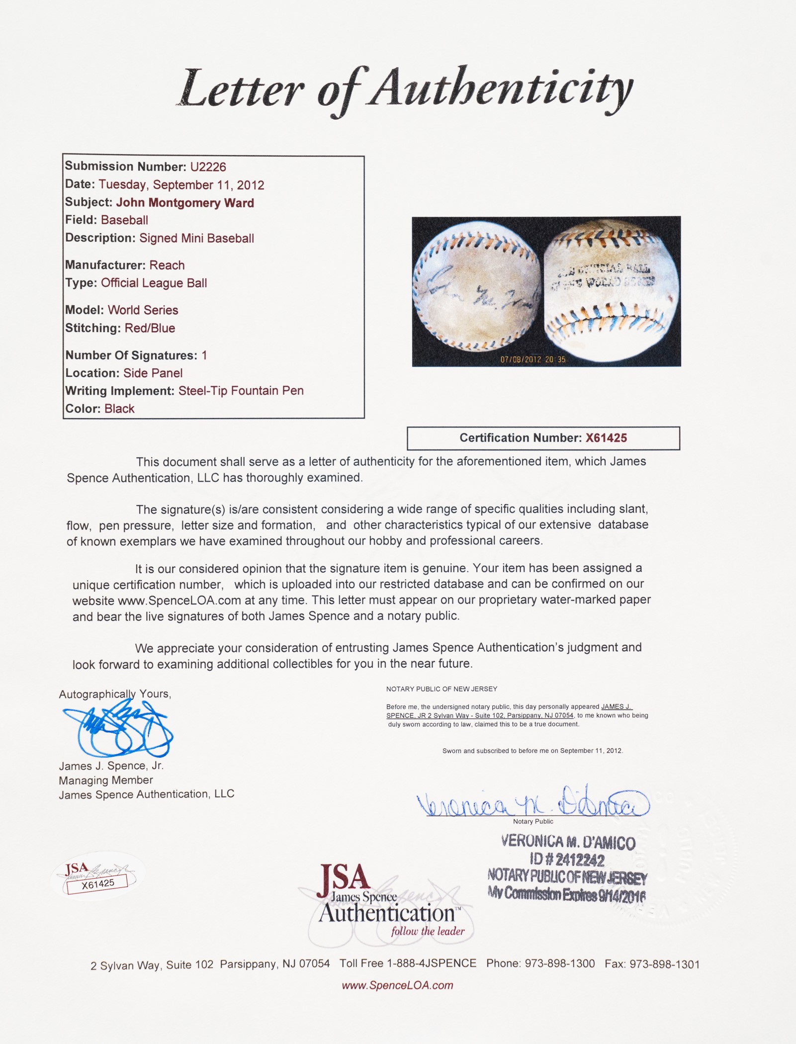 Official American League mini baseball signed by Hall of Famer John Montgomery Ward, who has signed the ball "John M. Ward" in black fountain pen on a side panel. This is, to the best of our knowledge, the only John Ward single-signed ball extant, albeit a mini example. The ball itself was most likely either a salesman's sample or a promotional giveaway, as the opposite sweet spot bears the stamped notation "The Official Ball of the World Series." Though its exact date of manufacture is unknown, the main stampings are consistent with balls produced between the years 1903 and 1925. John Ward is recognized as one of the most important and influential players of the nineteenth century. In addition to being a star pitcher and later a standout shortstop for the New York Giants during the 1880s, he was also one of Major League baseball's few true scholars. Ward was a college graduate (Penn State), and he later earned a law degree from Columbia. In 1890, Ward served as the leader of the short-lived renegade Players' League. Ward retired in 1894 and died in 1925, which was thirty-nine years prior to his induction into the Baseball Hall of Fame. For that reason Ward's signature is exceedingly rare in any form, especially on a baseball. The ball (6.75 inches in circumference) displays moderate wear, including abrasions to two side panels (not the signature panel). In Very Good condition overall. This is a particularly outstanding rarity that even some twenty years ago sold for many thousands of dollars. This mini ball displays beautifully and might well be the only single-signed John Ward baseball we will ever see. Full LOA from James Spence/JSA. Opening Bid $5,000.