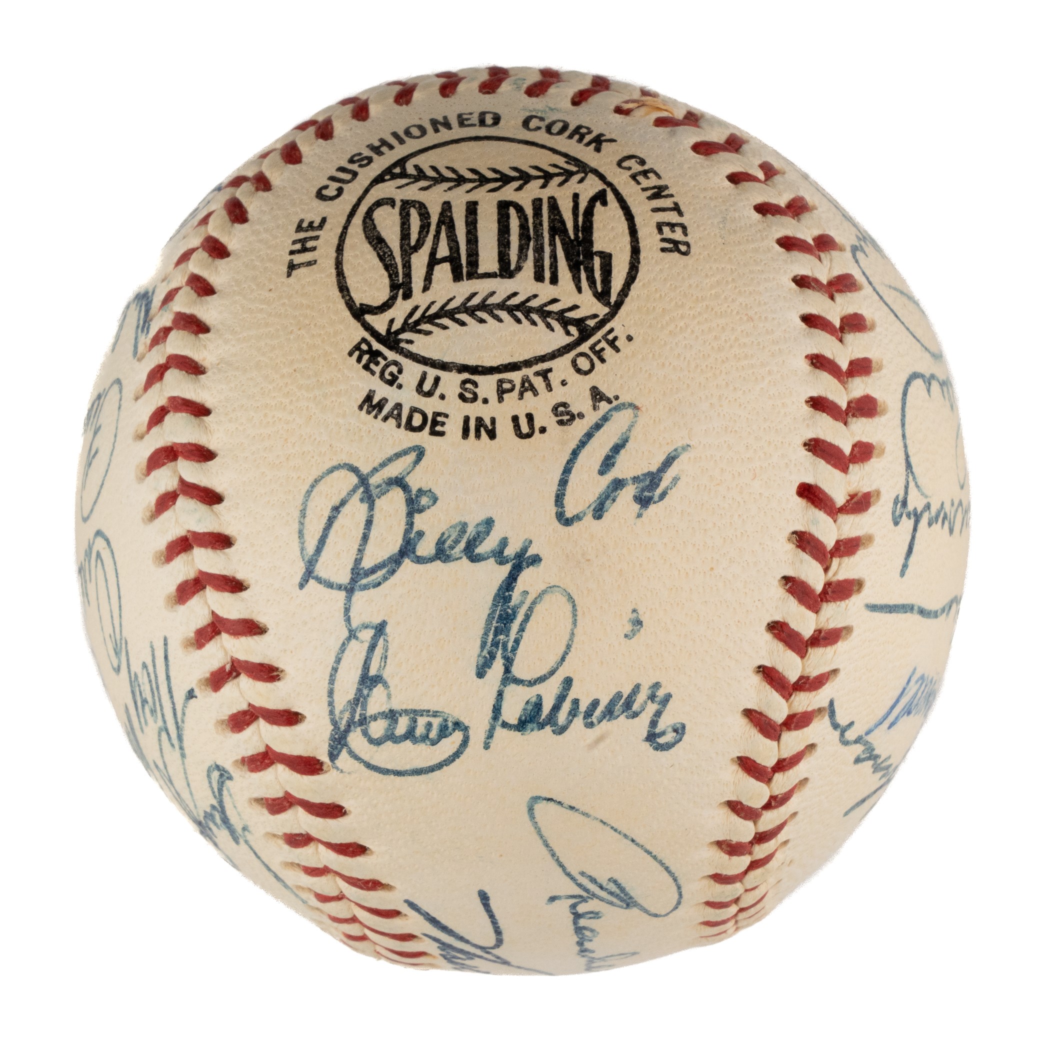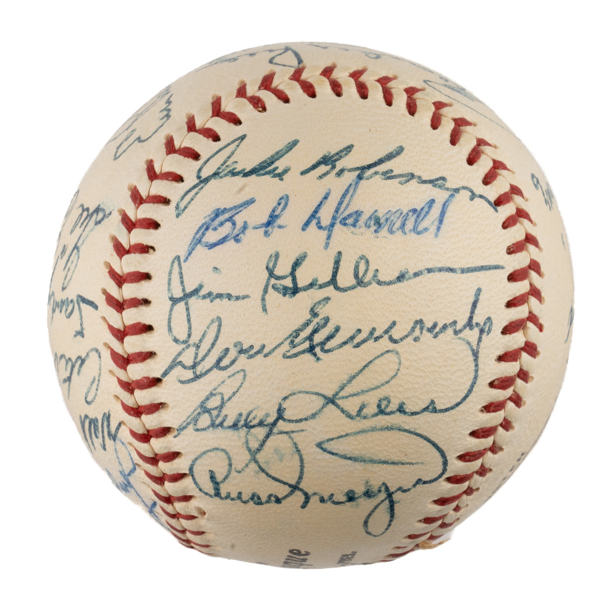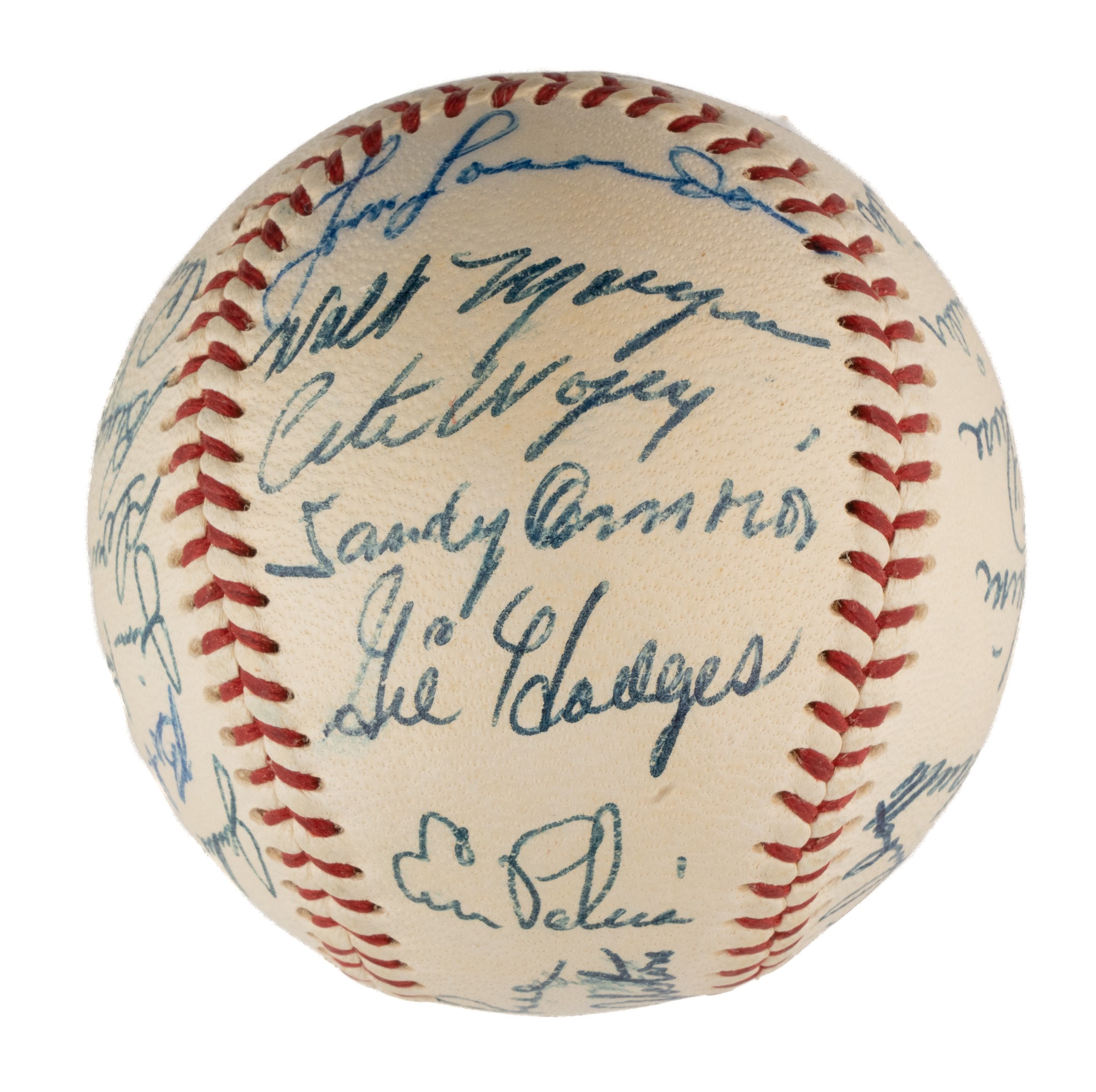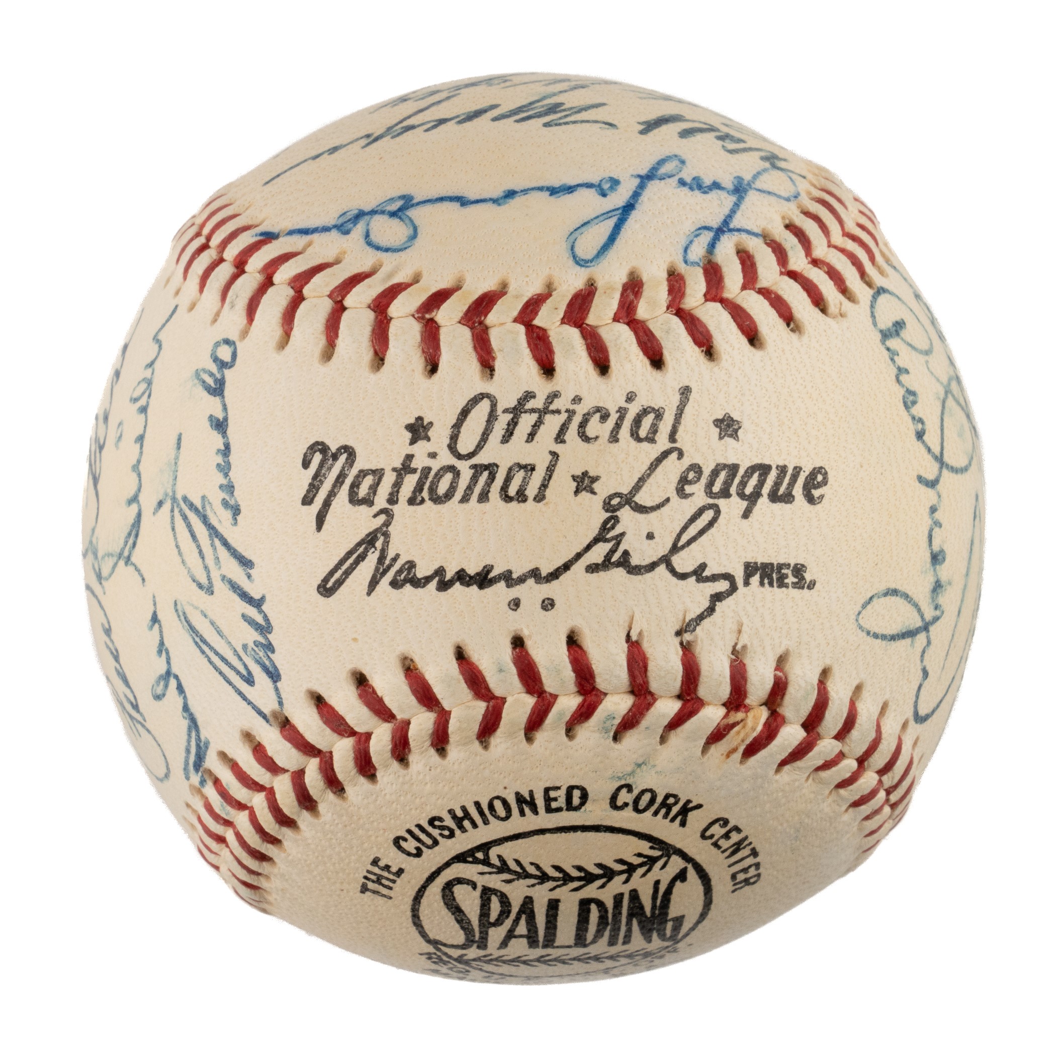 Official National League baseball (Giles) signed in blue ink by twenty-two members of the 1954 Brooklyn Dodgers. The twenty-two signatures are those of Robinson, Campanella, Hodges, Alston (Mgr., sweet spot), Lasorda (rookie year), Cox, Labine, Moryn, Wojey, Amoros, Palica, Shuba, Erskine, Gilliam, Newcombe, and Darnell. (The signatures of Duke Snider, Pee Wee Reese, Carl Furillo, Billy Loes, Russ Meyer, and Preacher Roe have been deemed clubhouse versions by JSA.) The ball is in Near Mint condition overall. Auction LOA from James Spence/JSA. Opening Bid $300.