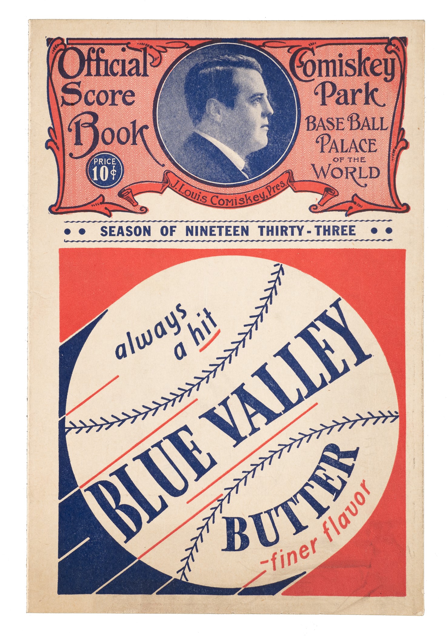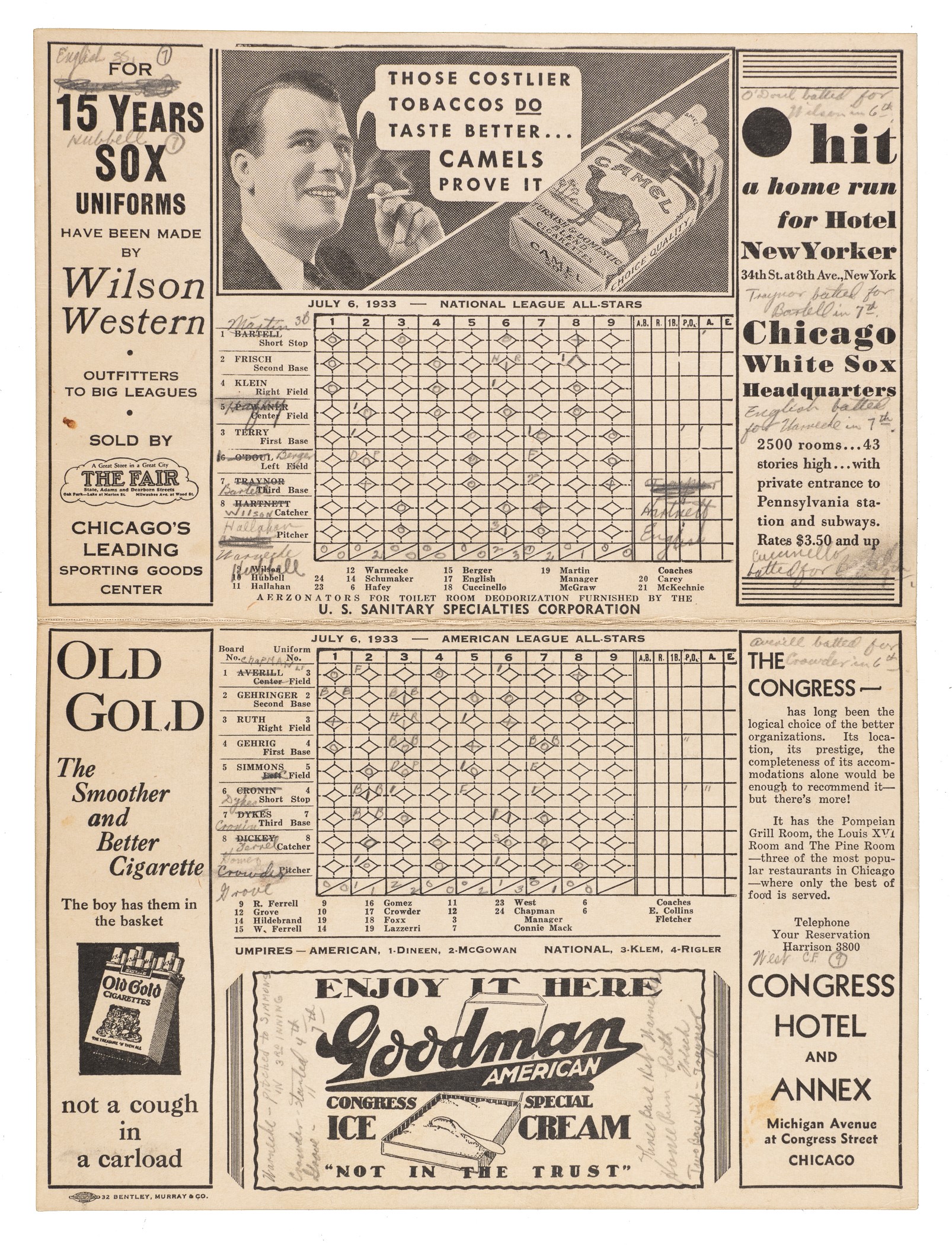 Official program from the first Major League All-Star Game, held on July 6, 1933, at Comiskey Park in Chicago, The fold-over scorecard pictures White Sox President J. Louis Comiskey on the cover, and the preprinted scorecard on the interior includes the starting lineups for both teams, including Ruth and Gehrig for the American League and Paul Waner and Bill Terry for the National League. The 1933 All-Star Game featured what many consider to have been the greatest assembly of baseball talent to ever take the field in a single game. Seventeen future Hall of Famers made appearances in the game, including Babe Ruth, Lou Gehrig, Frank Frisch, Chuck Klein, Chick Hafey, Bill Terry, Paul Waner, Pie Traynor, Gabby Hartnett, and Carl Hubbell. Connie Mack and John McGraw served as managers for their respective leagues. Fittingly, Ruth hit the first homer in All-Star Game history. Frisch led the NL offense with a two-run homer in the sixth inning, but the combined talents of Lefty Gomez and Ruth allowed the American League to win 4-2. Neatly scored in pencil. The program (6 x 9 inches) has light creases and normal handling wear. In Very Good to Excellent condition overall. Opening Bid $300.