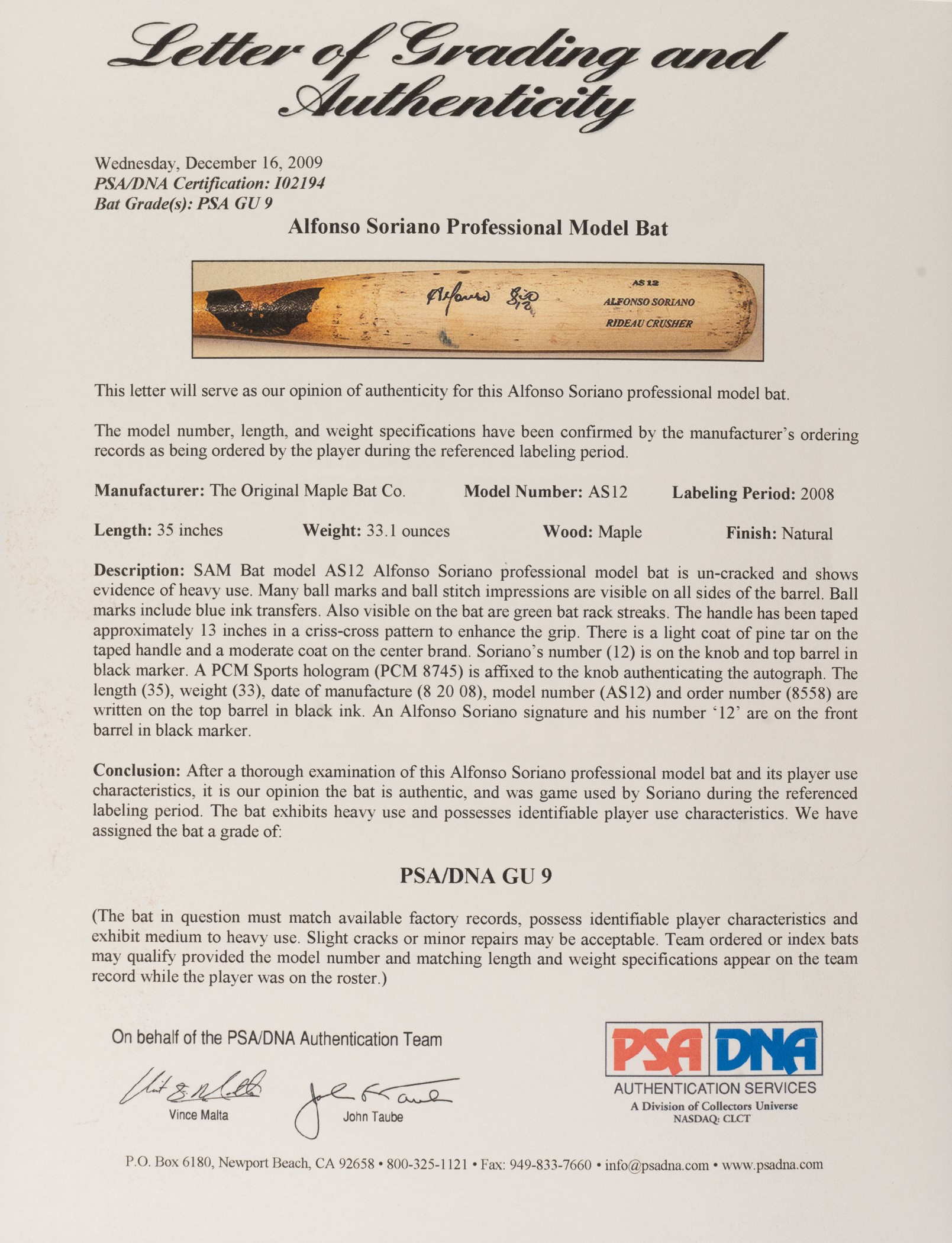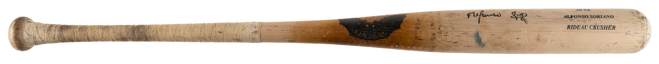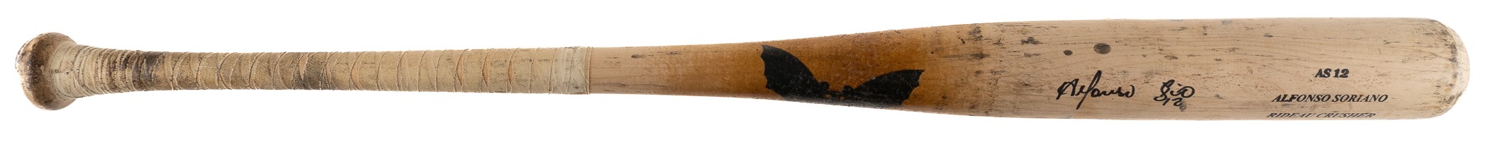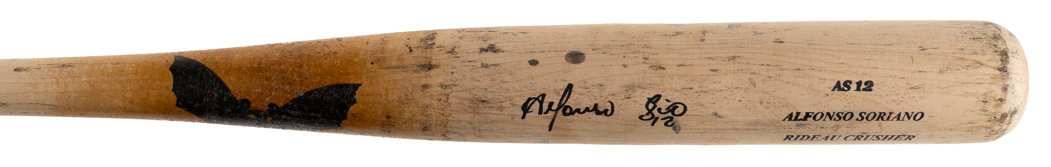 Presented is an uncracked Original Maple Bat Co. (SAM) model "AS12" bat used by Alfonso Soriano during the 2008 season. Graded GU 9 by PSA/DNA. The bat displays evidence of heavy use, including numerous ball marks and stitch impressions on all sides of the barrel (ball marks include blue-ink transfers), green rack marks, and a moderate coat of pine tar. According to the PSA/DNA letter "the handle has been taped in a criss-cross pattern to enhance the grip." Soriano's uniform number ("12") is written on both the knob and barrel end in black marker. The notations "35 - 33 - 8 20 08 - AS12 - 8558" are written on the barrel end in black marker. The notations represent bat length, weight, date of manufacture, model number, and order number, respectively. Soriano has signed the bat and added his uniform number "12" in black marker on the barrel. Soriano enjoyed another tremendous season in 2008, finishing the year with 29 home runs, 75 RBI, and .280 average. He was also named to the All-Star team. Length: 35 inches. Weight: 33.1 ounces. Full LOA from John Taube of PSA/DNA (for the bat, corresponding sticker affixed to the knob). Auction LOA from James Spence/JSA (for the signature). The size/weight of this item requires that there will be an additional shipping charge for this lot. Opening Bid $200.