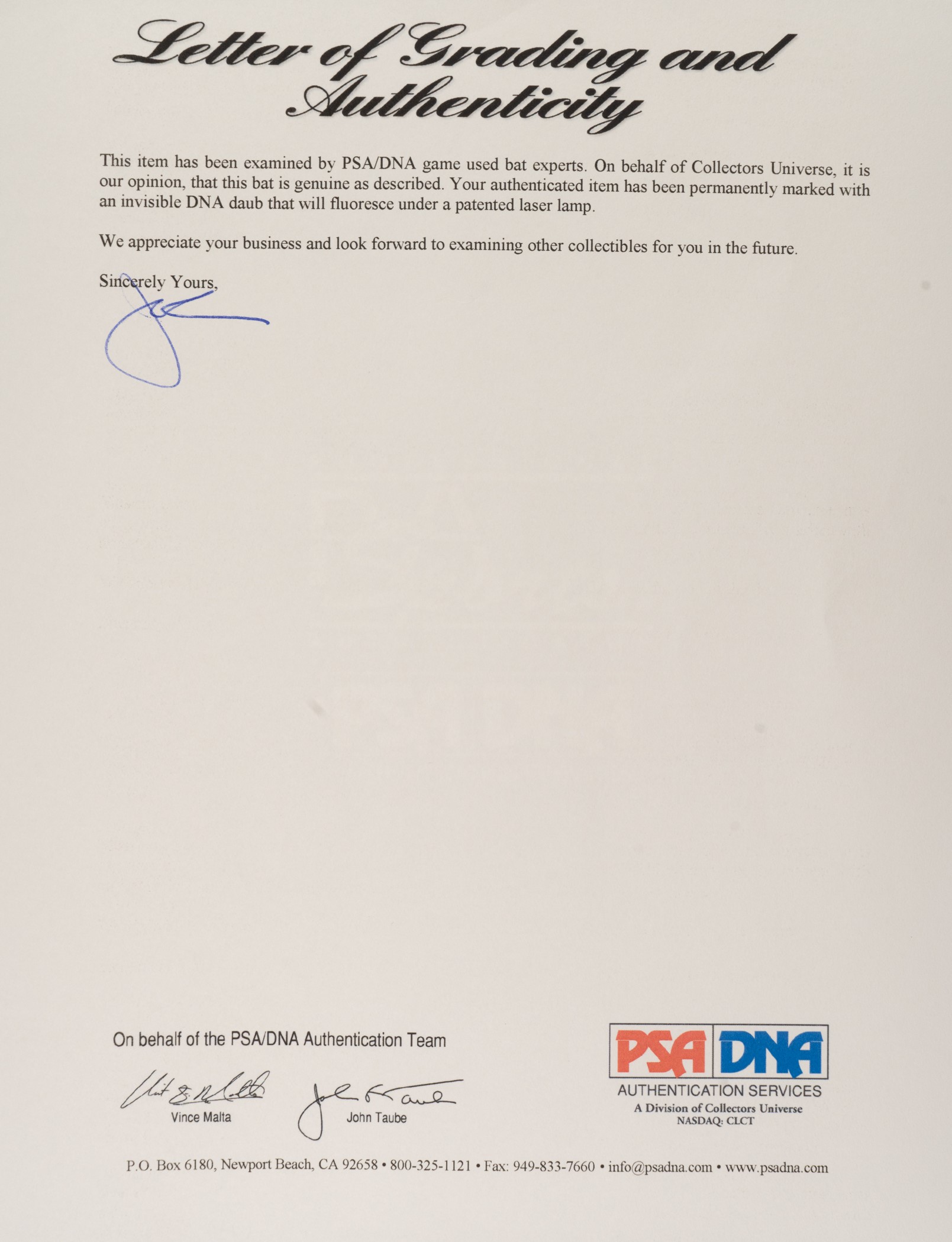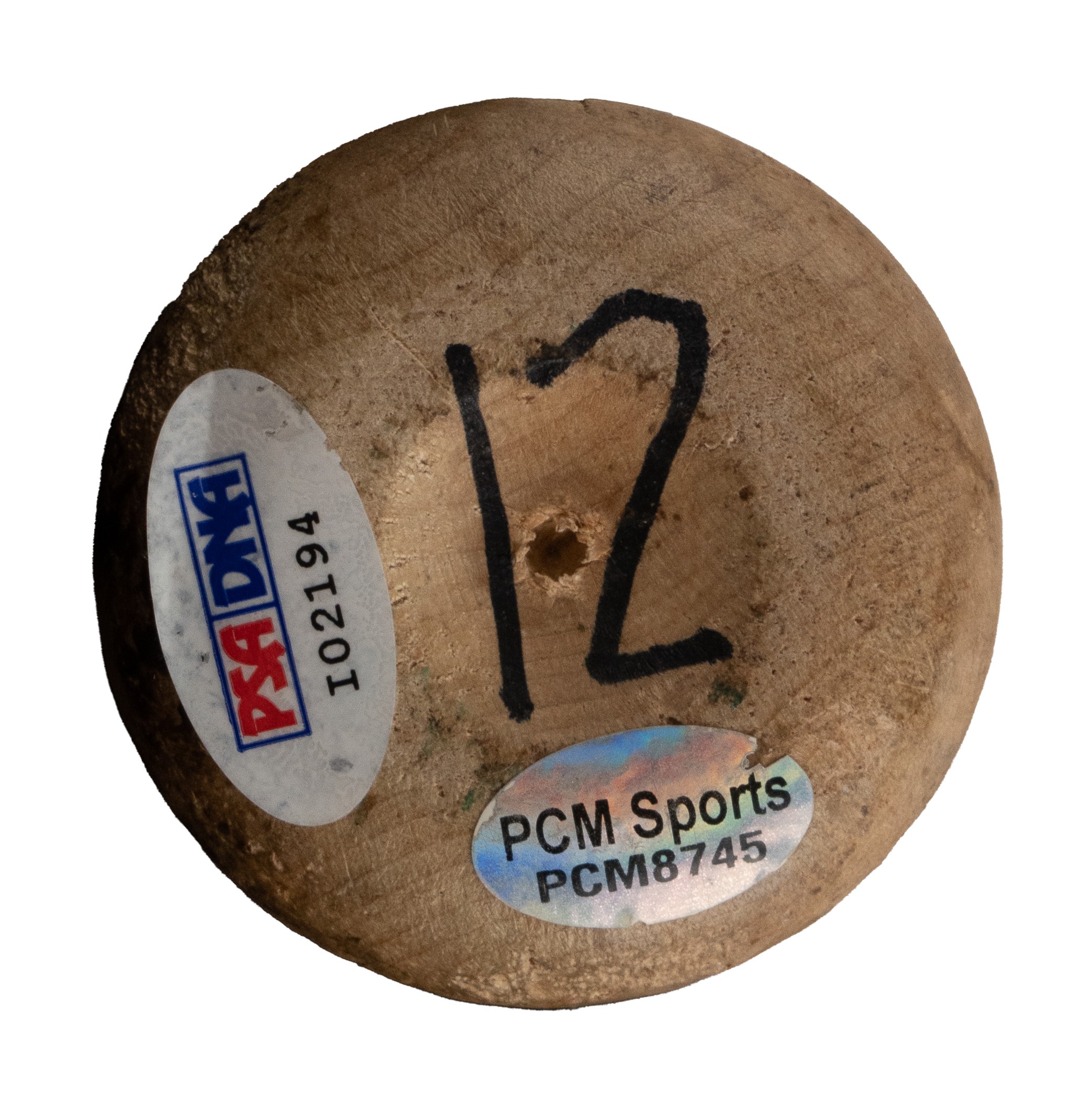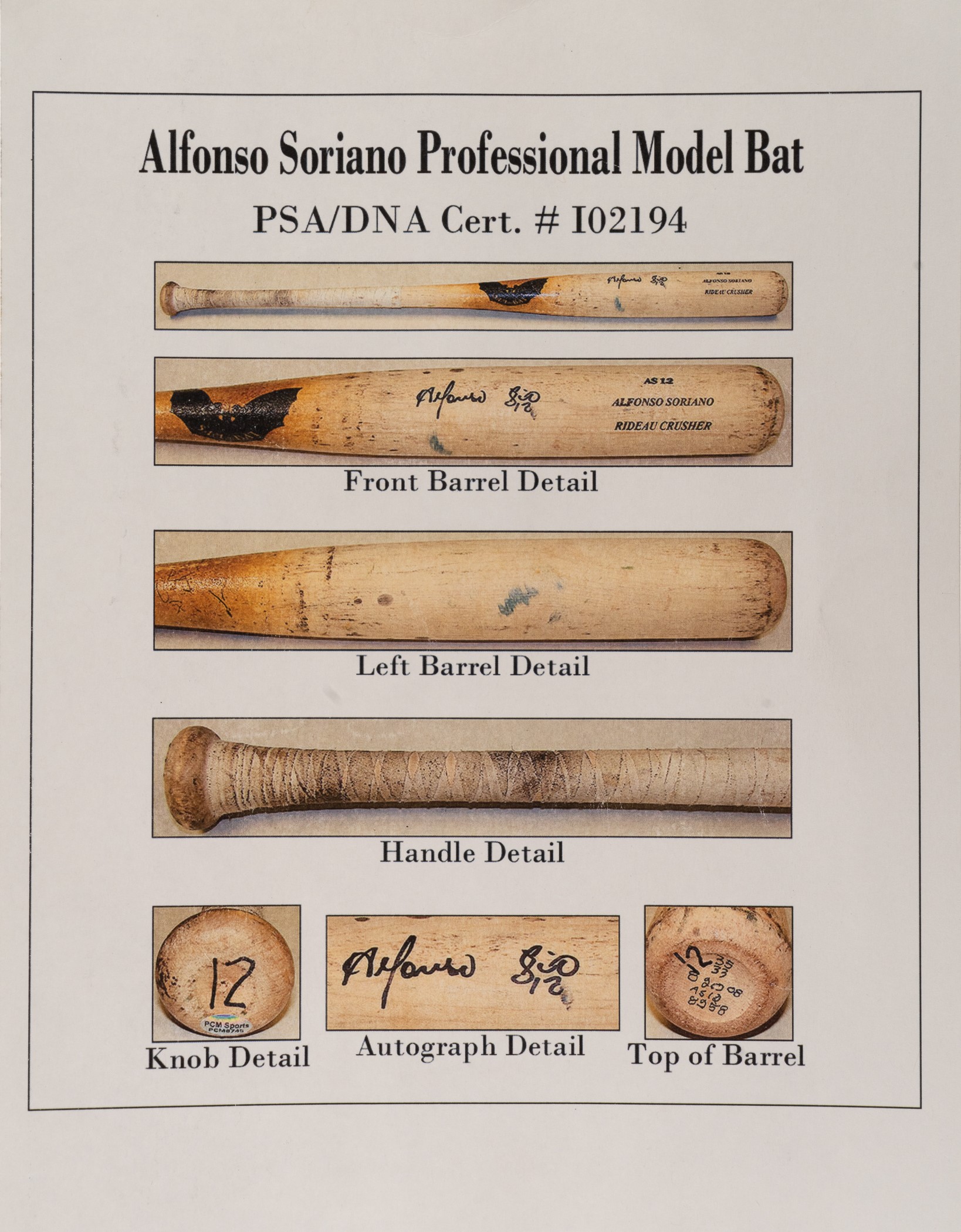 Presented is an uncracked Original Maple Bat Co. (SAM) model "AS12" bat used by Alfonso Soriano during the 2008 season. Graded GU 9 by PSA/DNA. The bat displays evidence of heavy use, including numerous ball marks and stitch impressions on all sides of the barrel (ball marks include blue-ink transfers), green rack marks, and a moderate coat of pine tar. According to the PSA/DNA letter "the handle has been taped in a criss-cross pattern to enhance the grip." Soriano's uniform number ("12") is written on both the knob and barrel end in black marker. The notations "35 - 33 - 8 20 08 - AS12 - 8558" are written on the barrel end in black marker. The notations represent bat length, weight, date of manufacture, model number, and order number, respectively. Soriano has signed the bat and added his uniform number "12" in black marker on the barrel. Soriano enjoyed another tremendous season in 2008, finishing the year with 29 home runs, 75 RBI, and .280 average. He was also named to the All-Star team. Length: 35 inches. Weight: 33.1 ounces. Full LOA from John Taube of PSA/DNA (for the bat, corresponding sticker affixed to the knob). Auction LOA from James Spence/JSA (for the signature). The size/weight of this item requires that there will be an additional shipping charge for this lot. Opening Bid $200.