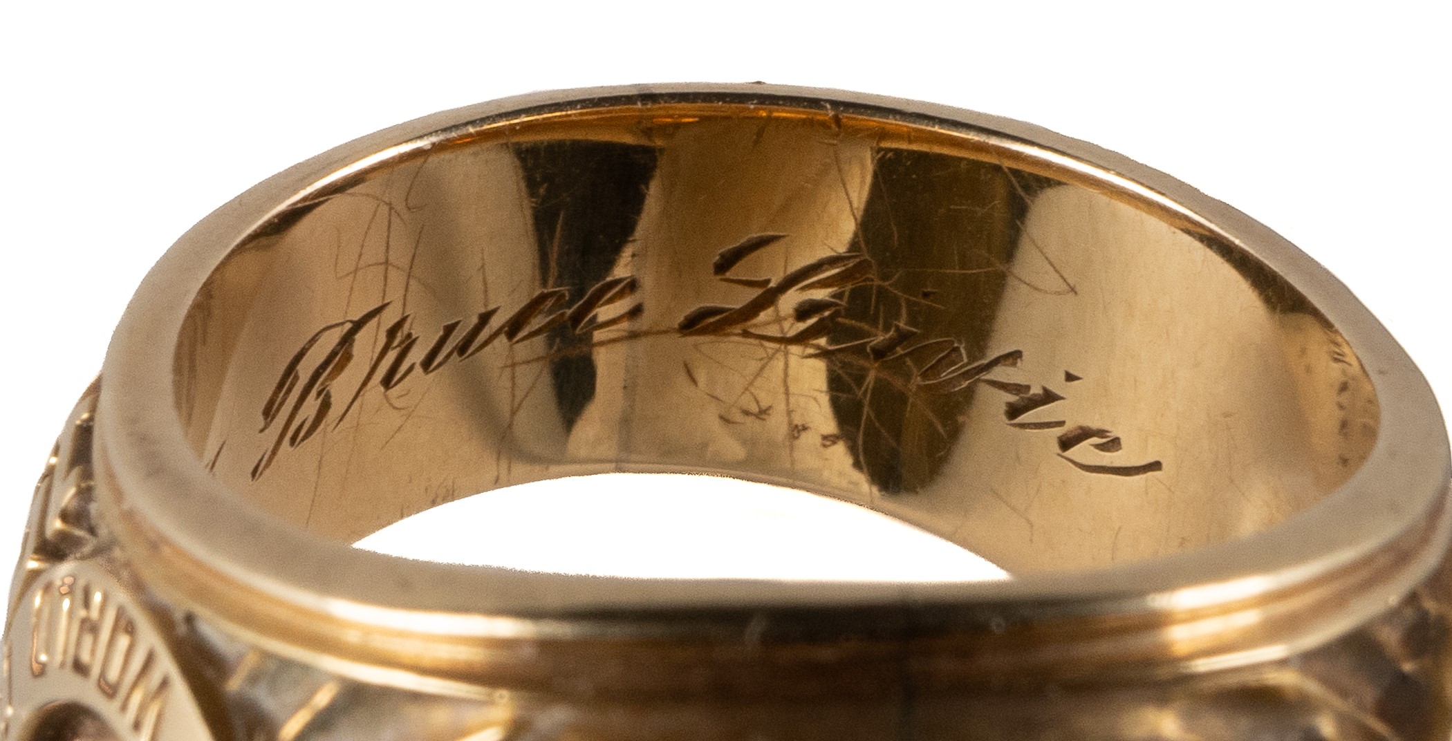 Presented is an extraordinary 1958 Baltimore Colts NFL Championship 14K-gold ring issued to team executive R. Bruce Livie. The front features a single inlaid diamond with two blue sapphires on either side. The lettering around the bezel reads "Baltimore Colts World Champions." Both shanks have the year ("1958") and the Colts logo, with one shank lettered "World Champions" and the opposite shank displaying the score "Colts 23 Giants 17." The engraving "LGB 14K" appears on the interior band, along with the executive's name ("R. Bruce Livie"). The 1958 NFL Championship between the New York Giants and Baltimore Colts is certainly deserving of the title "The Greatest Game Ever Played" as it was the first championship game to go into sudden-death overtime. The game ended in dramatic fashion when Colts running back Alan Ameche scored from the 1-yard line with 6:45 remaining. The ring has normal light wear commensurate with its age and use. In Excellent to Mint condition overall. Size: approximately 10. Weight: 33 grams. Opening Bid $10,000.