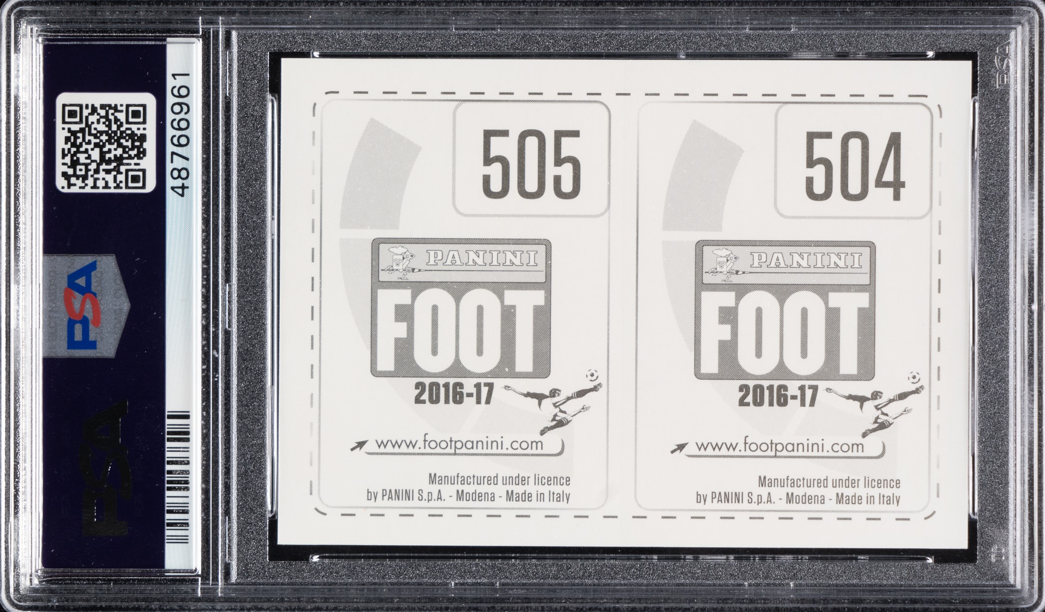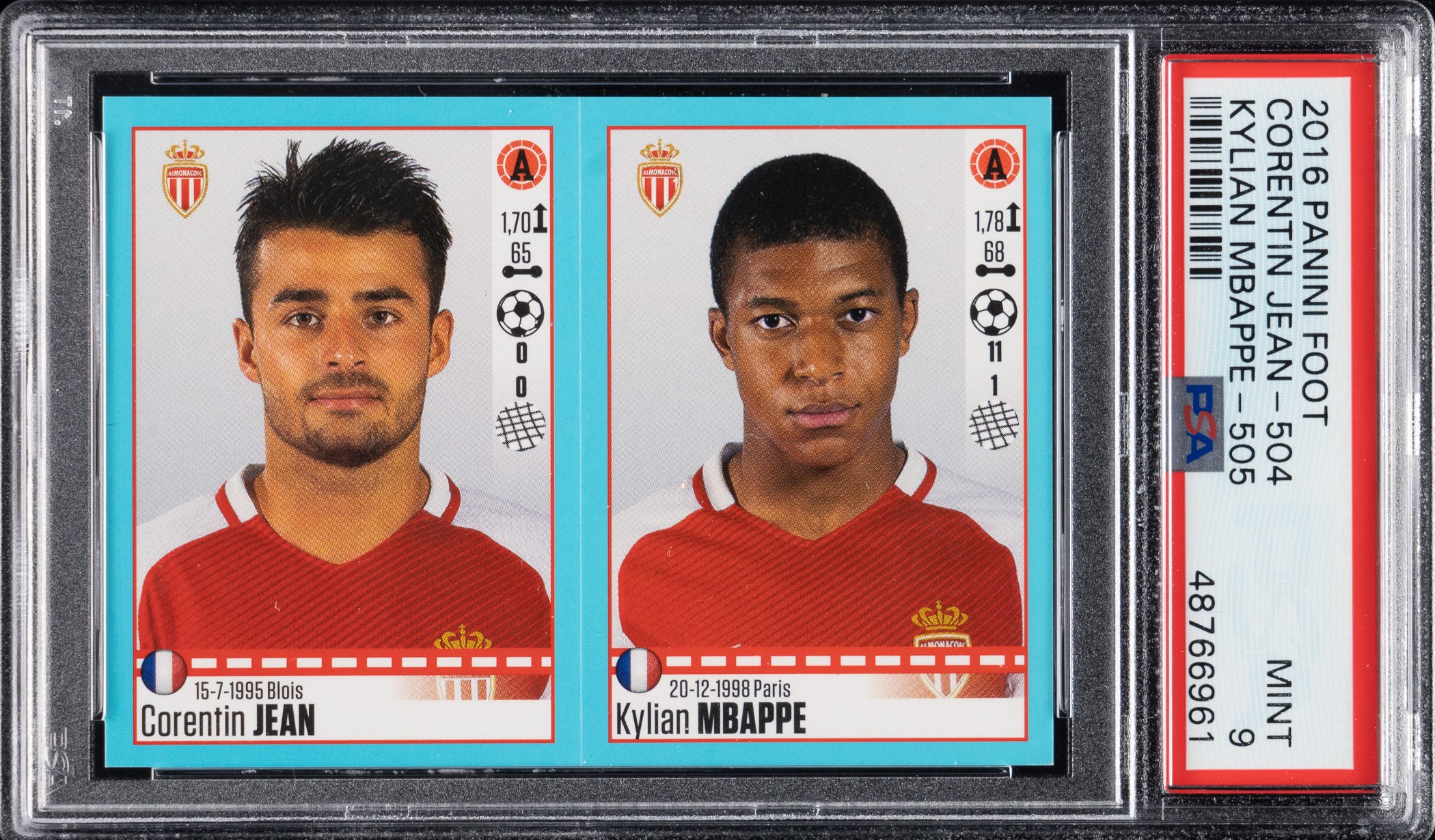 Graded MINT 9 by PSA. Superb example of Kylian Mbappe's rookie card from the 2016 Panini Foot Soccer series. This is Mbappe's first card and is acknowledged by most collectors as being his true rookie card. The offered card has superb image quality, sharp corners, and centering toward the bottom. A example of this global superstar. Opening Bid $200.