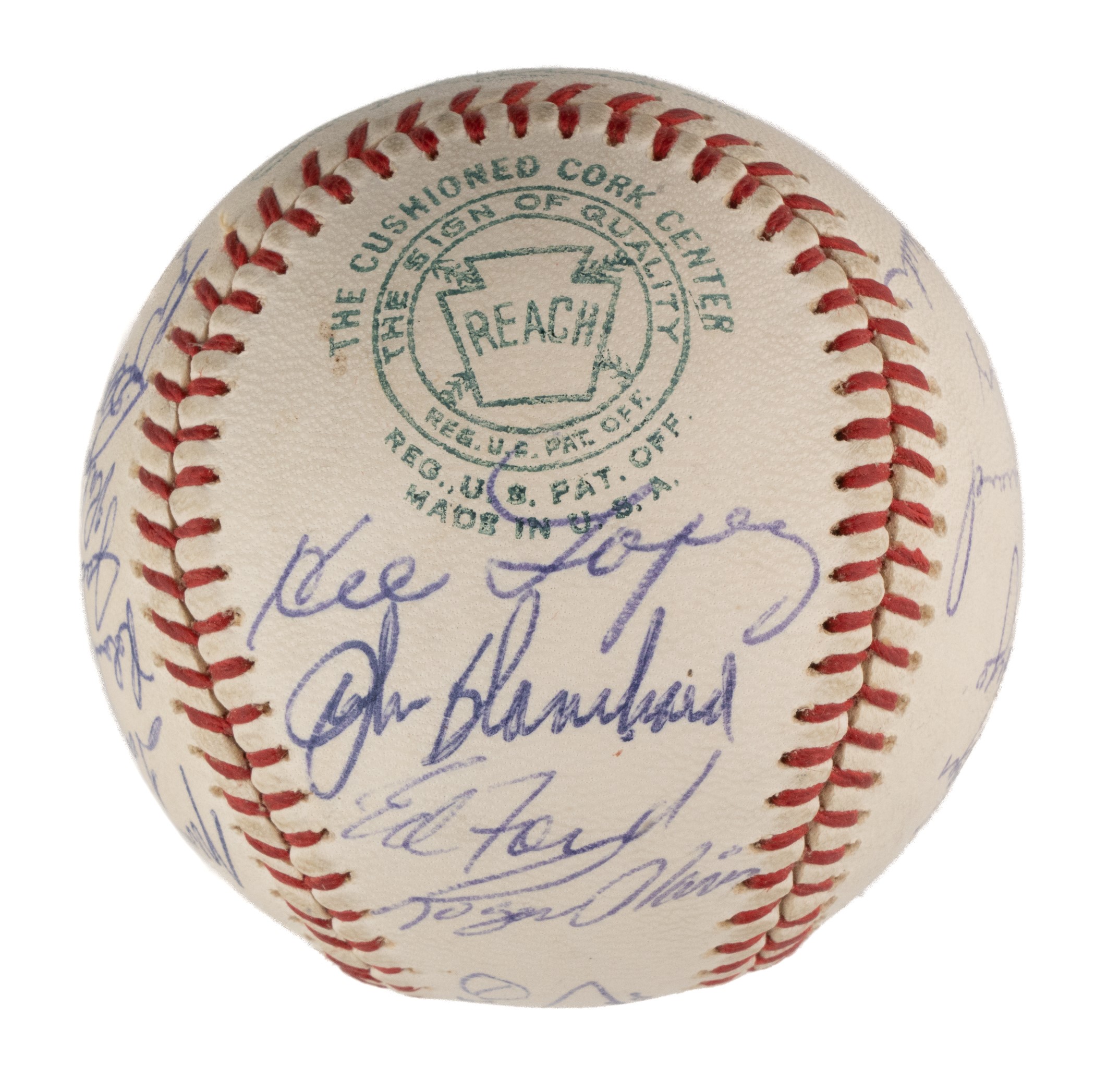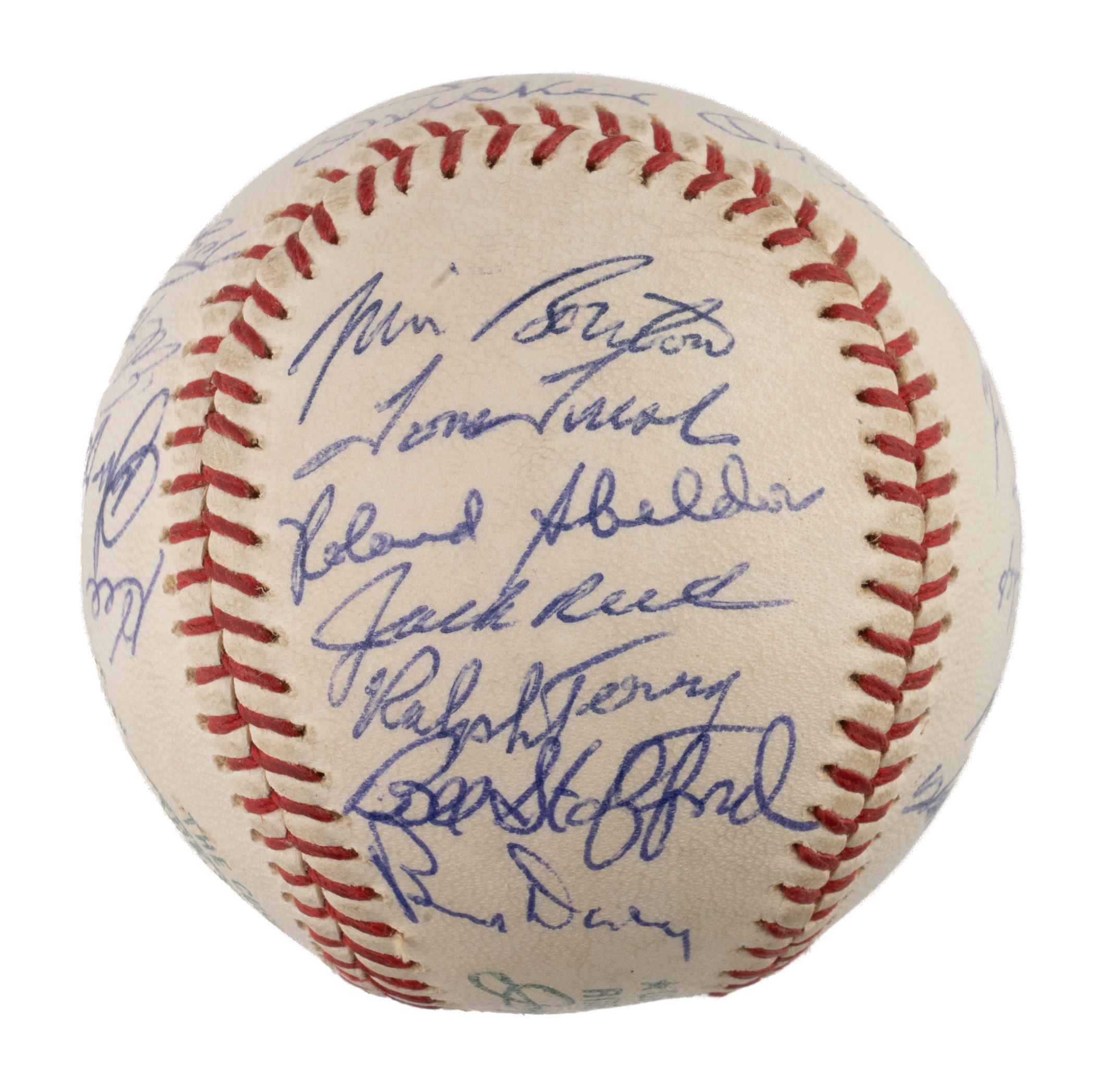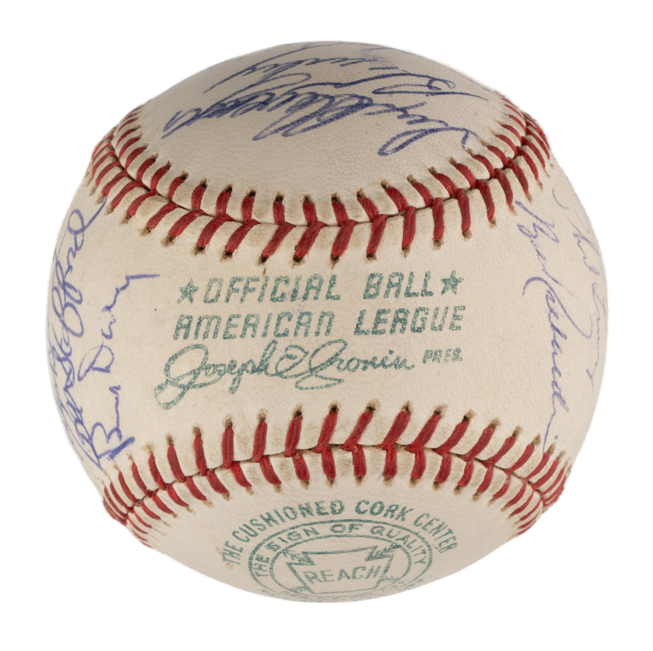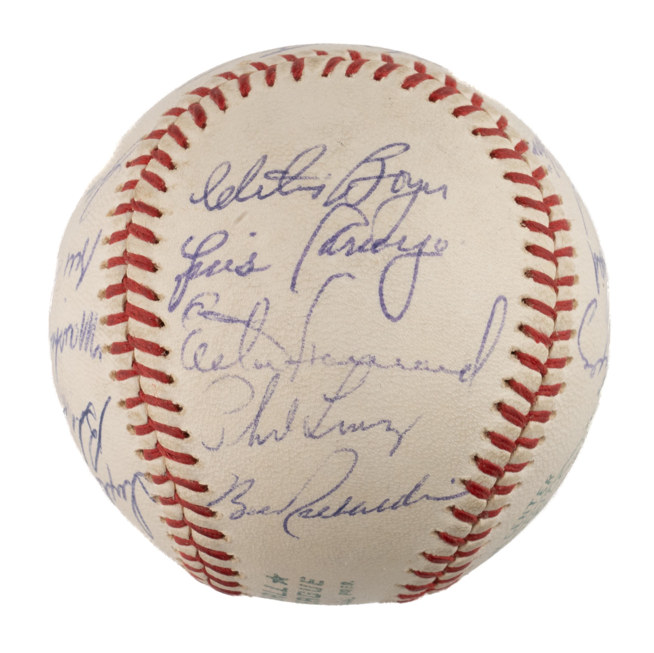 Official American League baseball (Cronin) signed in blue ink by twenty-three members of the 1962 World Champion New York Yankees. The signatures are those of Berra (sweet spot), Ford, Lopez, Blanchard, Clevenger, Turley, Bridges, Skowron, Coates, Boyer, Arroyo, Howard, Linz, Richardson, Bouton, Tresh, Sheldon, Reed, Terry, Daley, and Stafford. (The signatures of Mickey Mantle and Roger Maris have been deemed clubhouse versions by JSA.) This ball represents the end of an era for the Yankees, as 1962 marked the club's final World Championship of the decade. It would not be until 1977 that a championship banner was once again raised at Yankee Stadium. The ball is in Near Mint condition overall. Auction LOA from James Spence/JSA. Opening Bid $100.