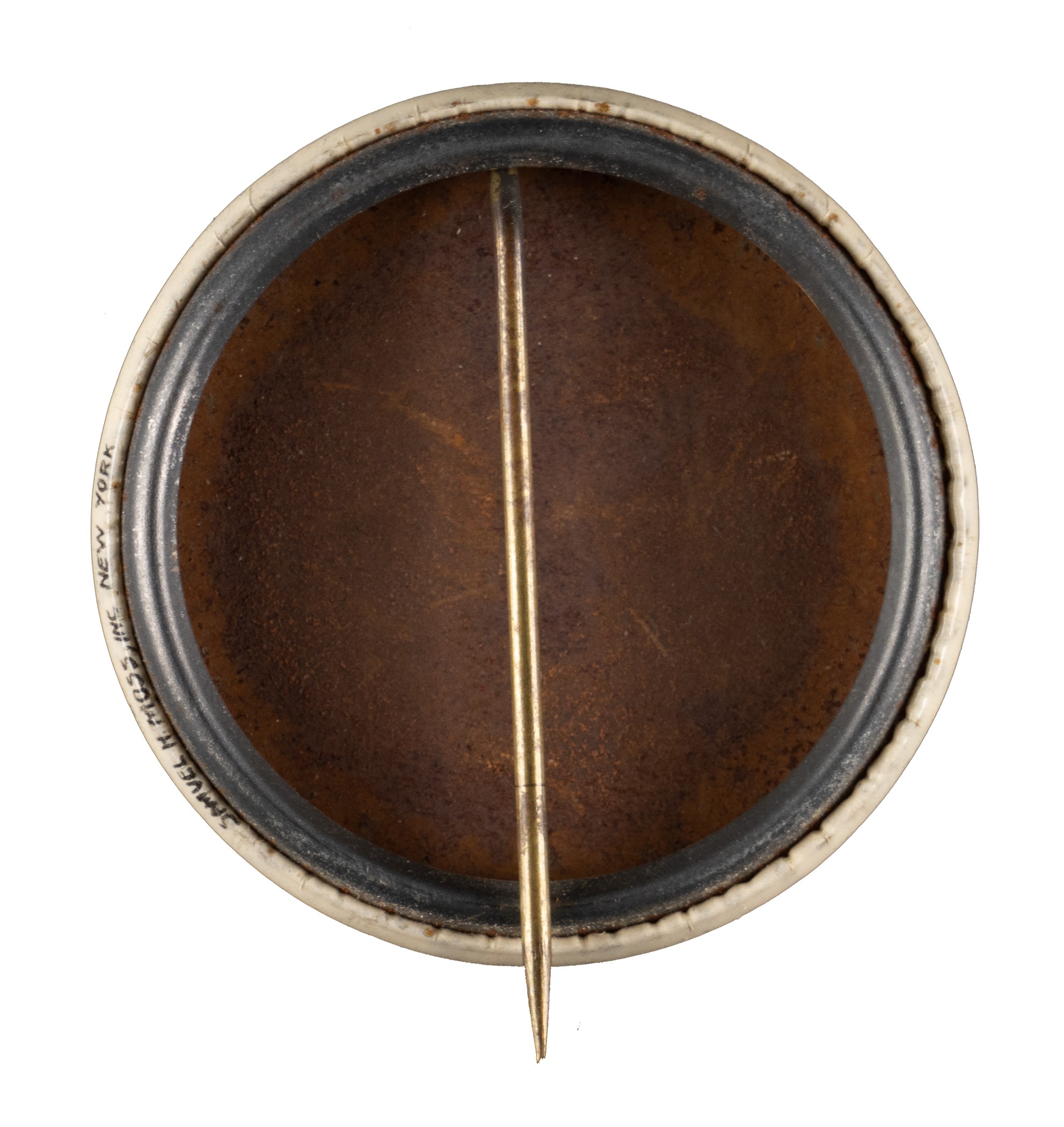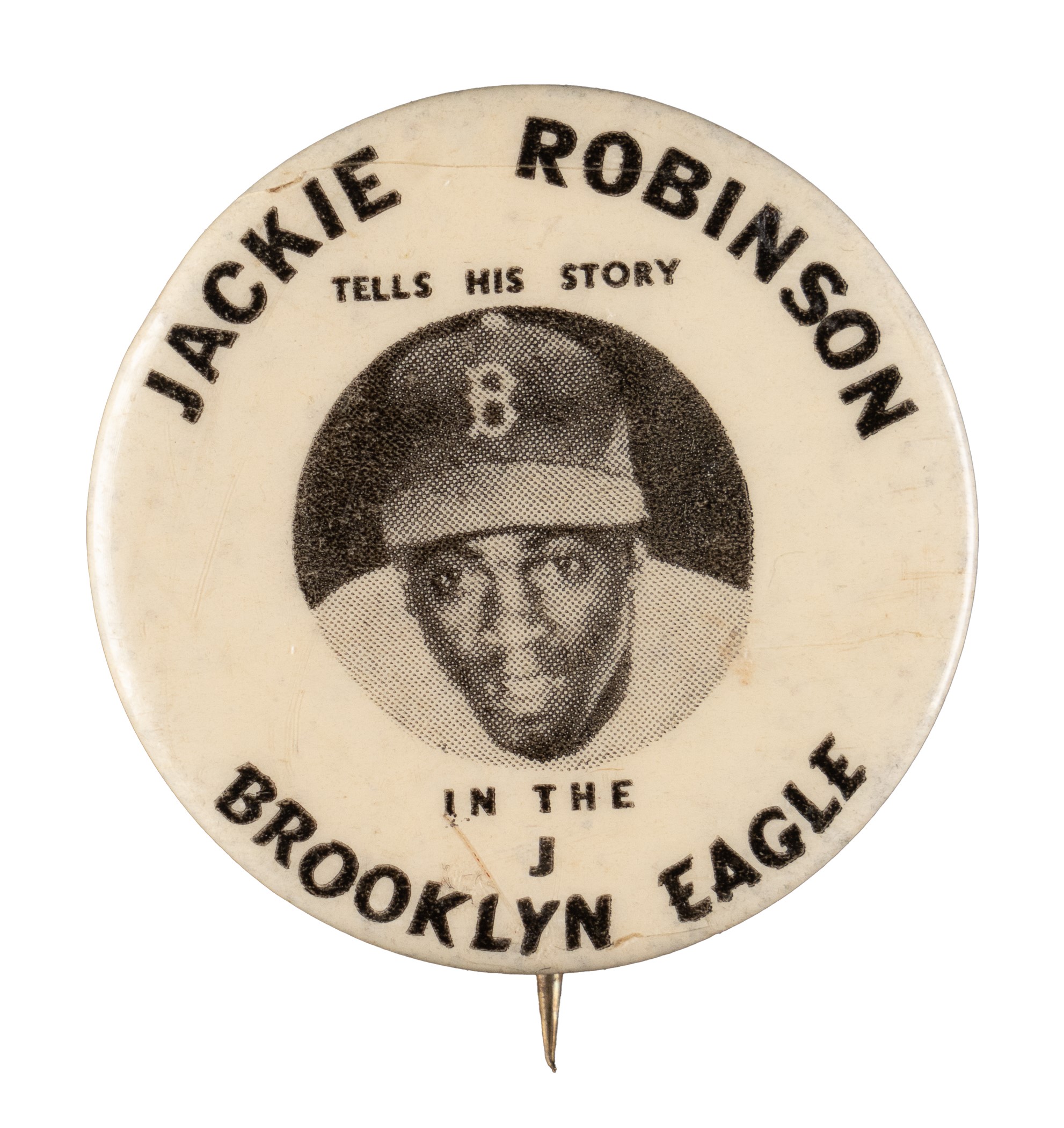 Presented is one of the rarest and most sought-after of all baseball pinbacks: the 1949 Jackie Robinson Brooklyn Eagle advertising pin. This is only the sixth example we have offered the past 20 years! In addition to being a remarkable rarity, it is the most desirable of all Jackie Robinson pins (a very popular area of baseball pinback collecting). It is also very unusual among Jackie Robinson pins as it is an advertising pinback, as opposed to being a souvenir stadium pin. This pin dates to the late 1940s, shortly after Robinson's historic 1947 Major League debut. The Brooklyn Eagle was a very prominent Brooklyn newspaper, and Robinson's story (which naturally was of great interest in Brooklyn) was featured in a series of articles. The pin features a portrait image of Robinson as a member of the Brooklyn Dodgers, with the black lettering along the top and bottom reading, respectively, "Jackie Robinson Tells His Story - In the Brooklyn Eagle." Produced by Samuel H. Moss of New York, as noted on the underside of the curl. The letter "J" appears below Robinson's image, and this letter was related to another promotional aspect of the pin. Pins were distributed with different letters in Robinson's name, and eventually kids could collect a set that would spell out Jackie Robinson. This is an extraordinary pin on many counts and is among the best of all baseball advertising celluloids from any era. This example has some condition issues, with a few surface cracks and a number of minor scratches, but displays beautifully. Diameter: 1.5 inches. Opening Bid $300.