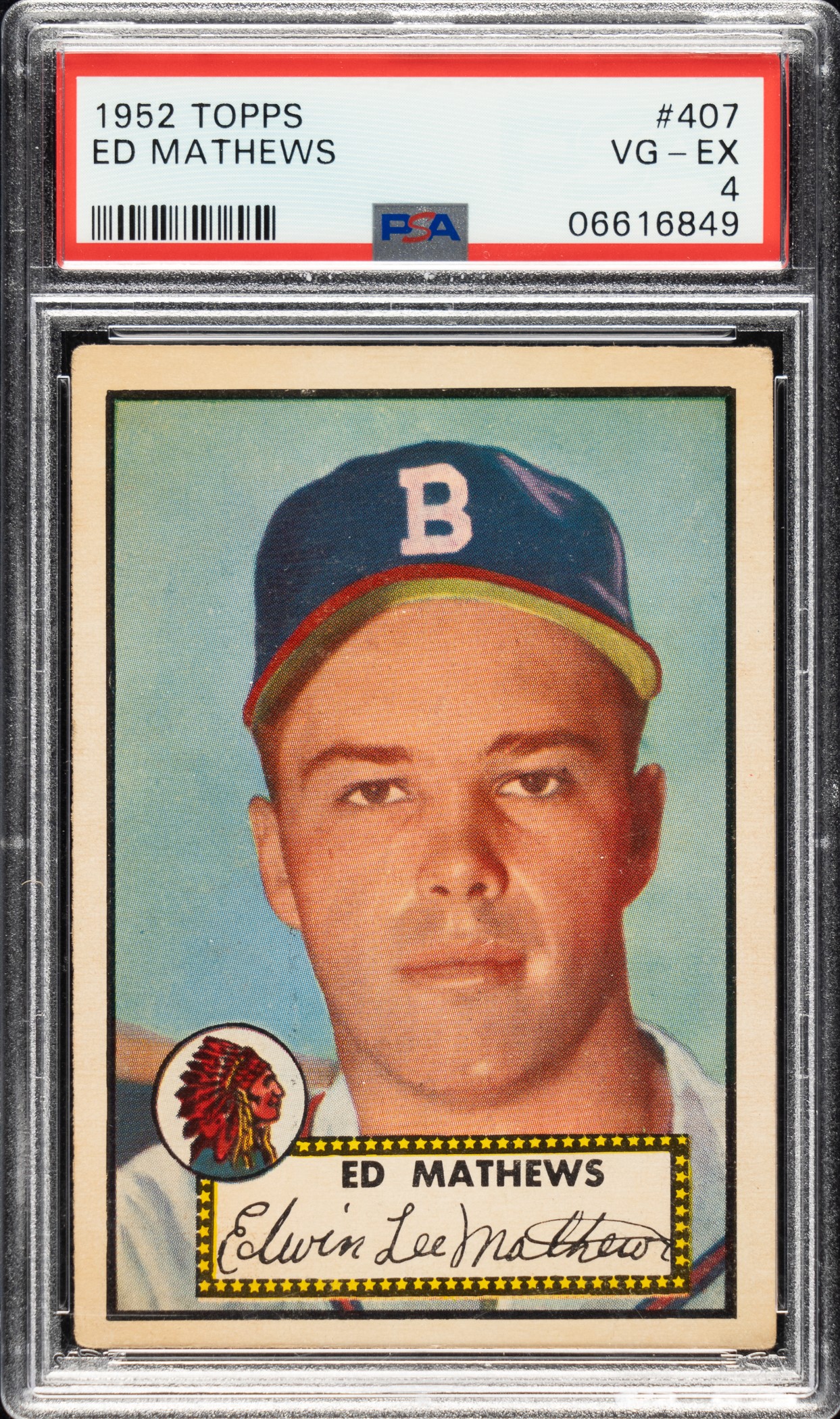 Graded VG-EX 4 by PSA. Outstanding mid-grade example of Eddie Mathews’ (Boston Braves) rookie card. In addition to being his rookie card, 1952 Topps card #407 Eddie Mathews is also one of only a few key Hall of Famers in the rare high-number series, and as the last card in the set, is also a condition rarity. Just as card #1 Pafko was subject to wear due to gravitating to the top of the pile, #407 Mathews was also subject to excessive wear at the bottom of the pile. In anything even resembling high grade, this has always been a very difficult card for anyone putting together a quality 1952 Topps set. The image on the front of this example is exceptionally well centered (far better than normally seen as this card is frequently encountered with centering issues) with original gloss, brilliant colors, and honest corner wear. The reverse of the card is clean with bold print. This is an extremely attractive mid-grade example of this important condition rarity that would be worthy of any high-quality 1952 Topps set or Hall of Fame rookie-card collection. Opening Bid $1,500.