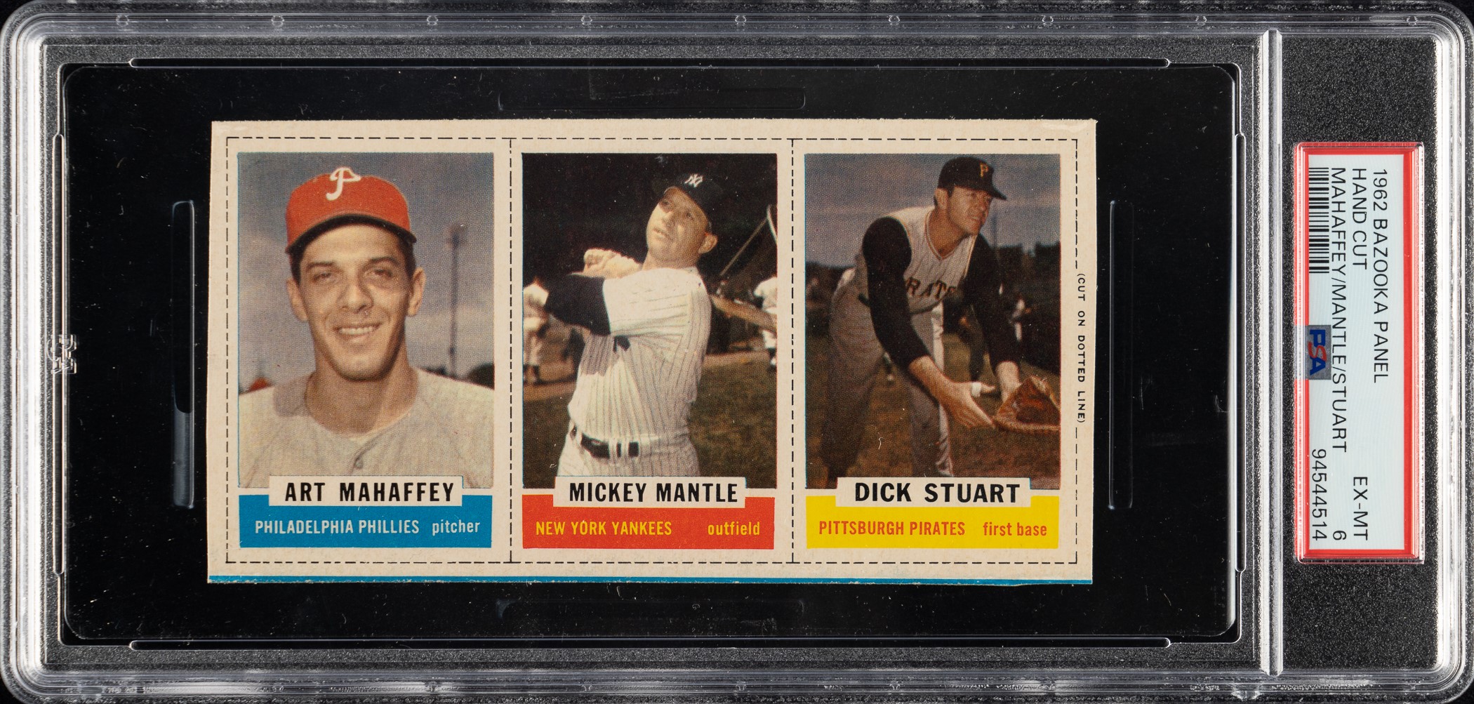 Graded EX-MT 6 by PSA (submitted by REA). Extremely attractive full panel featuring Mickey Mantle, Art Mahaffey, and Dick Stuart from the 1962 Bazooka set. This is an extremely impressive complete panel from this unusual, scarce, and underrated Bazooka Bubble Gum package-design set. Bazooka panels rarely receive numerical grades because they are hand-cut (issued one three-card panel per Bazooka gum box) and the cut must be precise and include the dotted lines to qualify, as seen on the offered example. This Mantle panel is undoubtedly the key panel to this series, and the offered example is superb. Bright and crisp with bold colors, strong corners, and a clean cut all around. The blank back is clean. A very attractive example of the key panel featuring Mickey Mantle from this popular 1960s package-design set. Opening Bid $300.
