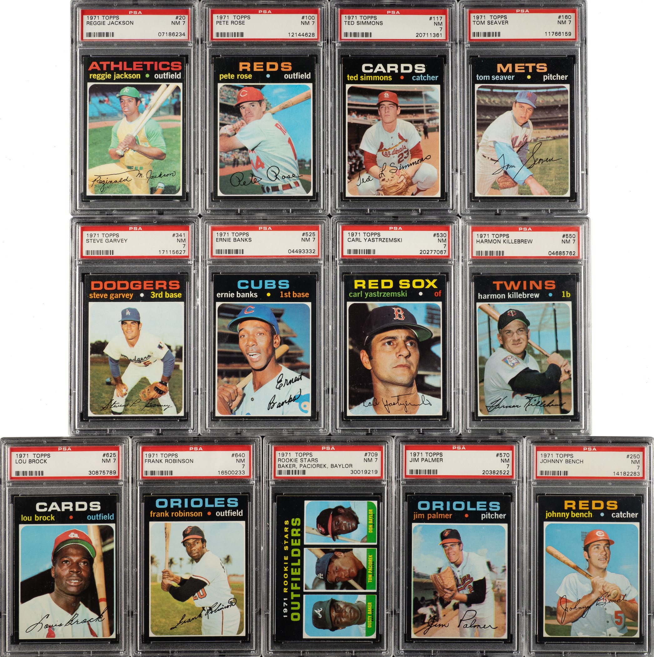 Presented is a high-grade complete set of 1971 Topps consisting of 752 different cards plus all nine variations (#42, 123, 206, 265, 306, two 369, and two 619) required for a complete master set, entirely graded and encapsulated by PSA. The black, flush-to-the-border design makes this issue particularly challenging to collect in extremely high grade. This set consists of thirty NM-MT 8s, thirty-one NM+ 7.5s, and 700 NM 7s. PSA Grading Composite: NM-MT 8 (30 cards): 16, 59, 80, 105, 120, 132, 163, 168, 206, 218, 227, 240, 244, 261, 282, 306, 313, 317, 326, 366, 369, 375, 439, 464, 474, 475, 486, 502, 517, and 629. NM+ 7.5 (31 cards): 23, 29, 86, 111, 149, 151, 166, 187, 193, 209, 260, 289, 308, 309, 332, 338, 343, 392, 398, 418, 442, 470, 473, 548, 590, 608, 621, 666, 684, 739, and 742. NM 7 (700 cards): Including #5 Munson, 20 Jackson, 26 Blyleven RC, 100 Rose, 117 Simmons RC, 160 Seaver, 250 Bench, 341 Garvey RC, 400 Aaron, 513 Ryan, 525 Banks, 530 Yastrzemski, 550 Killebrew, 570 Palmer, 600 Mays, 625 Brock, 630 Clemente, 640 F. Robinson, and 709 Baylor/Baker RC. This is an extraordinary complete set of one of the most condition-sensitive of all card sets from any era. The grading fees alone to encapsulate 761 cards would literally be thousands of dollars! A tremendous opportunity to acquire a high-grade complete master set of this classic 1971 Topps baseball set, entirely graded by PSA. The total SMR value for the assigned grades is $13,839. Total: 761 cards (complete set of 752 plus nine variations). The size/weight of this item requires that there will be an additional shipping charge for this lot. Opening Bid $2,500.