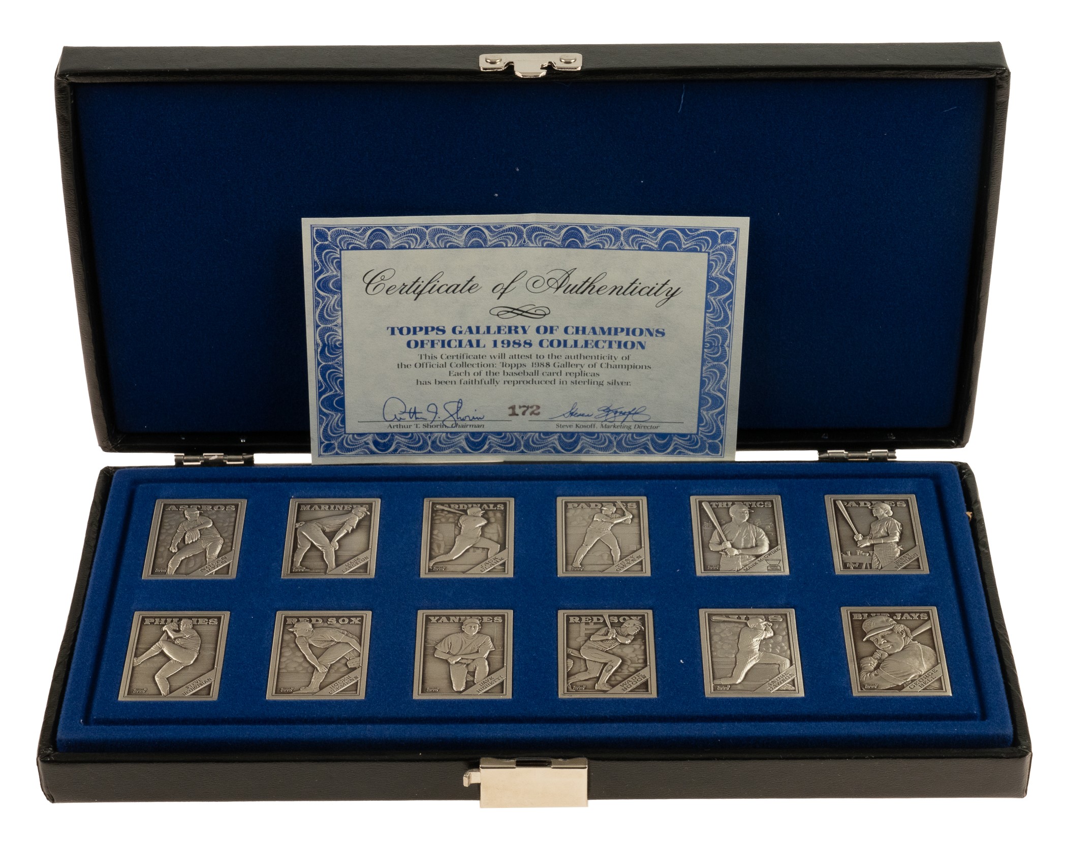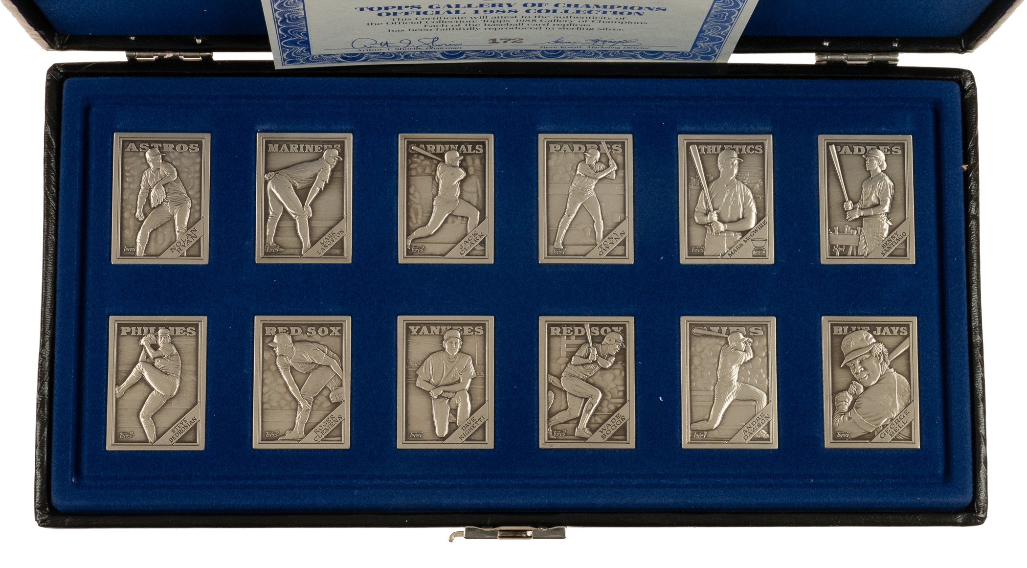 Complete 1988 Topps "Gallery of Champions" set. From 1984 to 1991, Topps issued a limited number of metallic baseball cards that reproduced the regular-issue card of a particular player from the respective year. The cards in this particular set are designed with materials of sterling silver and measure approximately 1-1/4 by 1-3/4 inches. Numerous stars and Hall of Famers, including Nolan Ryan, Tony Gwynn, Mark McGwire, Wade Boggs, and Andre Dawson, are featured within this 12-card set. The metallic cards are in overall Nr/Mt-Mt condition and are housed in the original custom case as issued. Opening Bid $200.