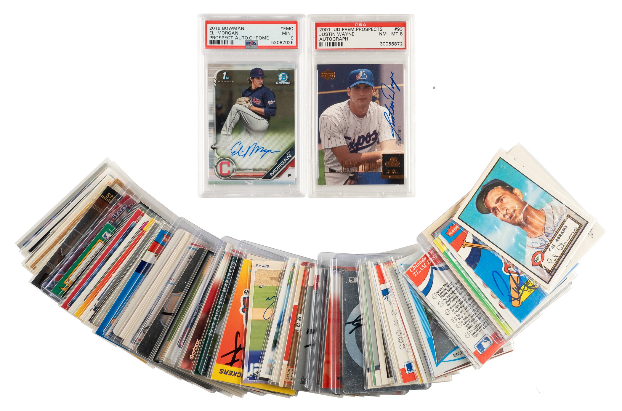 Autograph collection featuring the signatures of 91 former Jewish MLB players. The items in this collection are trade cards and team sticker inserts. Among the players represented here are Ron Blomberg, Joe Ginsberg, Shawn Green, Joe Horlen, Al Rosen, Art Shamsky, Don Taussig, and Steve Yeager. Signatures, penned in a variety of inks appear on the front. The items range from Ex to Nr/Mt-Mt condition (with a few lesser). The complete list of signed items is as follows: Cal Abrams (deceased), Lloyd Allena, Ruben Amaro, Brad Ausmus, Dylan Axelrod, Ross Baumgarten, Jose Bautista, Brian Bark, Braden Bishop, Jeremy Bleich, Richard Bleier, Cy Block (deceased), Ron Blomberg, Ralph Branca (deceased), Ryan Braun, Harry Danning (deceased), Harry Eisenstat (deceased), Matt Ford, Tony Fossas, Nate Freiman, Sam Fuld, Joe Ginsberg (deceased), Keith Glauber, Greg Goossen (deceased), Shawn Green, Adam Greenberg, Jason Hirsch, Ken Holtzman (deceased), Joel Horlen, Brian Horwitz, Skip Jutze, Ryan Kalish, Gabe Kapler, Ryan Karp, Tyler Kelly, Ian Kinsler, Jason Kipnis, Mike Koplove, Brian Kowitz, Mike LaCross, Ryan Lavernway, Al Levine, Jesse Levis, Lou Limmer, Andrew Lorraine, Elliott Maddox, Jason Marquis, Ed Mayer (deceased), Bob Melvin, Mike Michin, Norm Miller, Eli Morgan (2019 Bowman Prospect PSA MINT 9), Joe Moscot, David Newhan, Jeff Newman, Jon Perlman, Aaron Poreda, Scott Radinsky, Jerry Reinsdorf, Al Richter (deceased), Al Rosen (deceased), Steve Rosenberg, Wayne Rosenthal, Marv Rotblatt (deceased), Larry Rothschild, Ryan Sadowski, Mike Saipe, Josh Satin, Roger Samuels, Moe Savransky (deceased), Scott Schoeneweis, Richie Sheinblum (deceased), Michael Schwimer, Art Shamsky, Mark Shapiro, two Larry Sherry (deceased), Norm Sherry (deceased), Adam Stern, Robert Stock, Steve Stone, Don Taussig, Bob Tufts, Danny Valencia, Steve Wapnick, Justin Wayne (2001 UD Premium Prospects #93 PSA NM-MT 8), Dan Warthen, Josh Whitesell, Steve Yeager, Kevin Youkilis, and Ed Zosky. Total: 91 signed items. Auction LOA from James Spence/JSA. Opening Bid $200.
