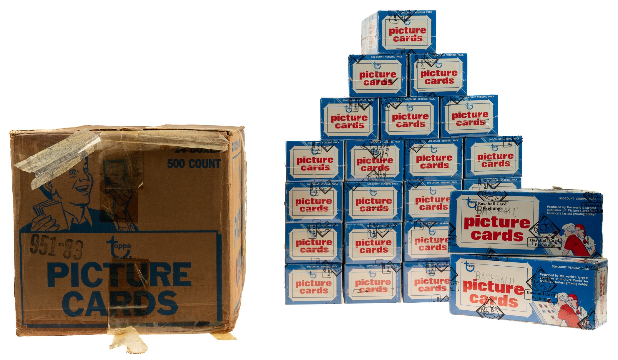 Original vending box case of 1983 Topps baseball (factory seals broken), featuring twenty-four unopened boxes, each containing approximately 500 cards for a total of 12,000 cards. These twenty-four boxes represent a complete original case. The 1983 Topps set, which is one of the most popular sets of the 1980s, includes rookie cards of Hall of Famers Wade Boggs, Tony Gwynn, and Ryne Sandberg, as well as numerous other stars and Hall of Famers, including Nolan Ryan, Pete Rose, and Cal Ripken. Each box comes shrink-wrapped by Baseball Card Exchange (owned by Steve Hart, the foremost expert on unopened material) and is noted to have originated from a sealed case (FASC designation on label). A tremendous opportunity to acquire this extraordinary group of unopened vending boxes, representing a complete case from the popular 1983 Topps baseball issue! Total: 24 unopened boxes plus original outer case. The size/weight of this item requires that there will be an additional shipping charge for this lot. Opening Bid $2,500.
