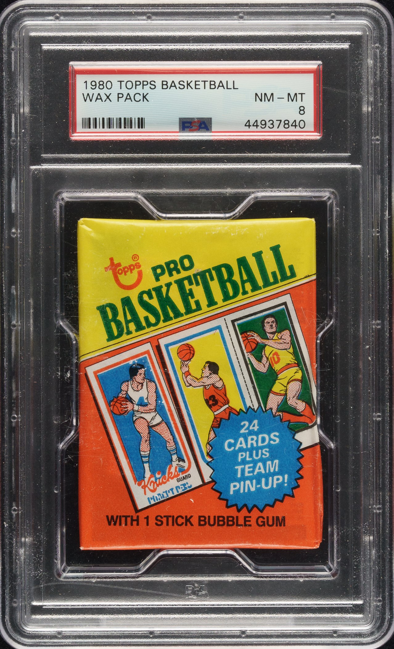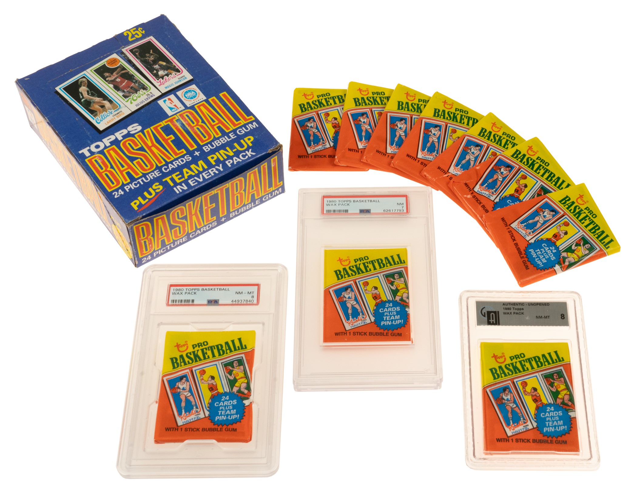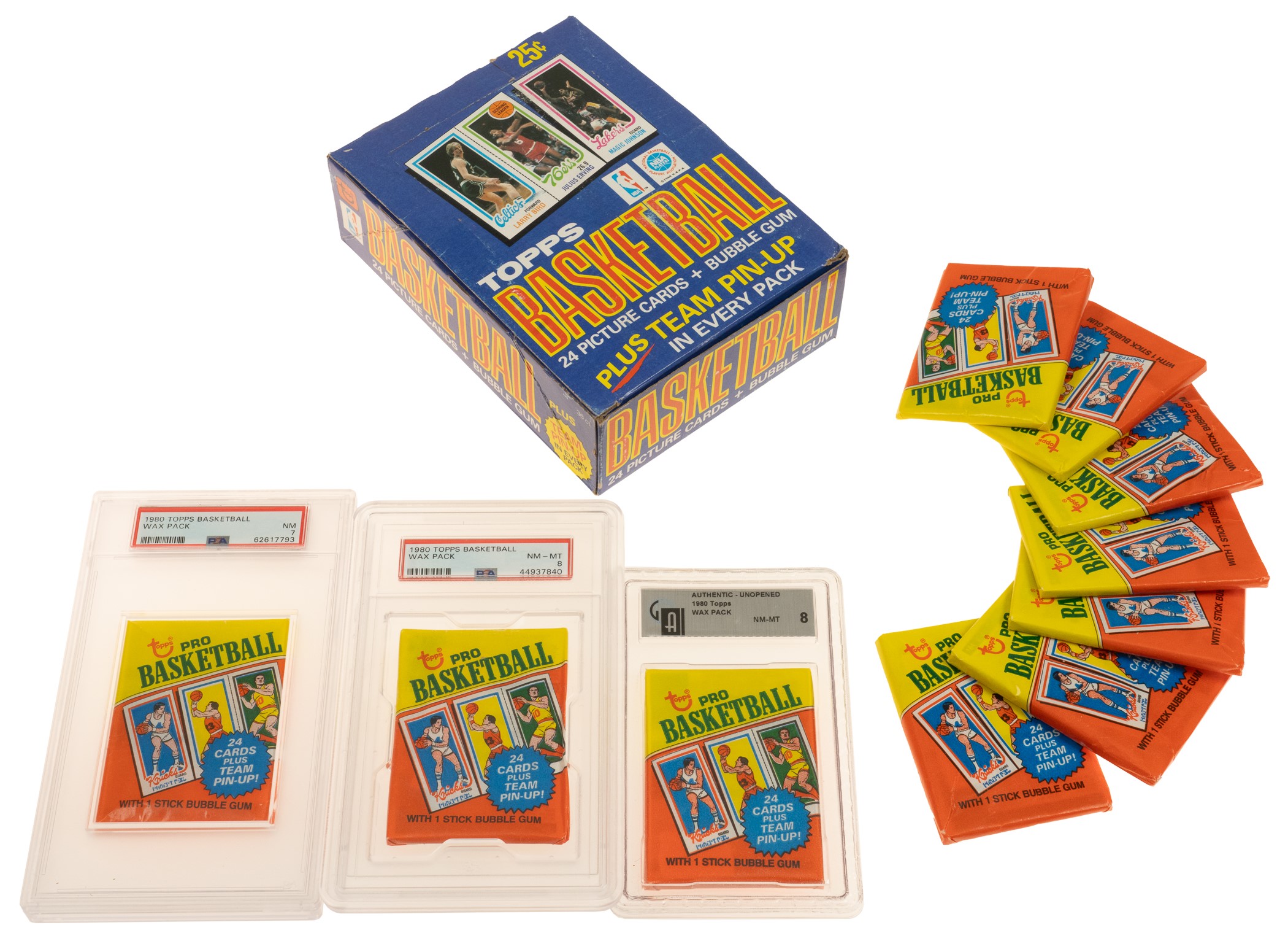 Collection of ten original unopened wax packs from the 1980-1981 Topps basketball set accompanied by the original display box. Three packs have been individually graded and encapsulated by PSA (NM-MT 8 and NM 7) and GAI (NM-MT 8). The 1980-1981 Topps basketball set features the rookie cards of Hall of Famers Larry Bird, Magic Johnson, Maurice Cheeks, Sidney Moncrief, and many other Hall of Famers, including Julius Erving, Kareem Abdul-Jabbar, George Gervin, and Jack Sikma. Steve Hart of the Baseball Card Exchange (the leading authority on unopened material) has personally reviewed these packs, and in his opinion, they are original and unopened. Each pack is bright and clean with tight seals. The display box has light-to-moderate shelf wear. Total: 10 packs and display box. Opening Bid $1,000.