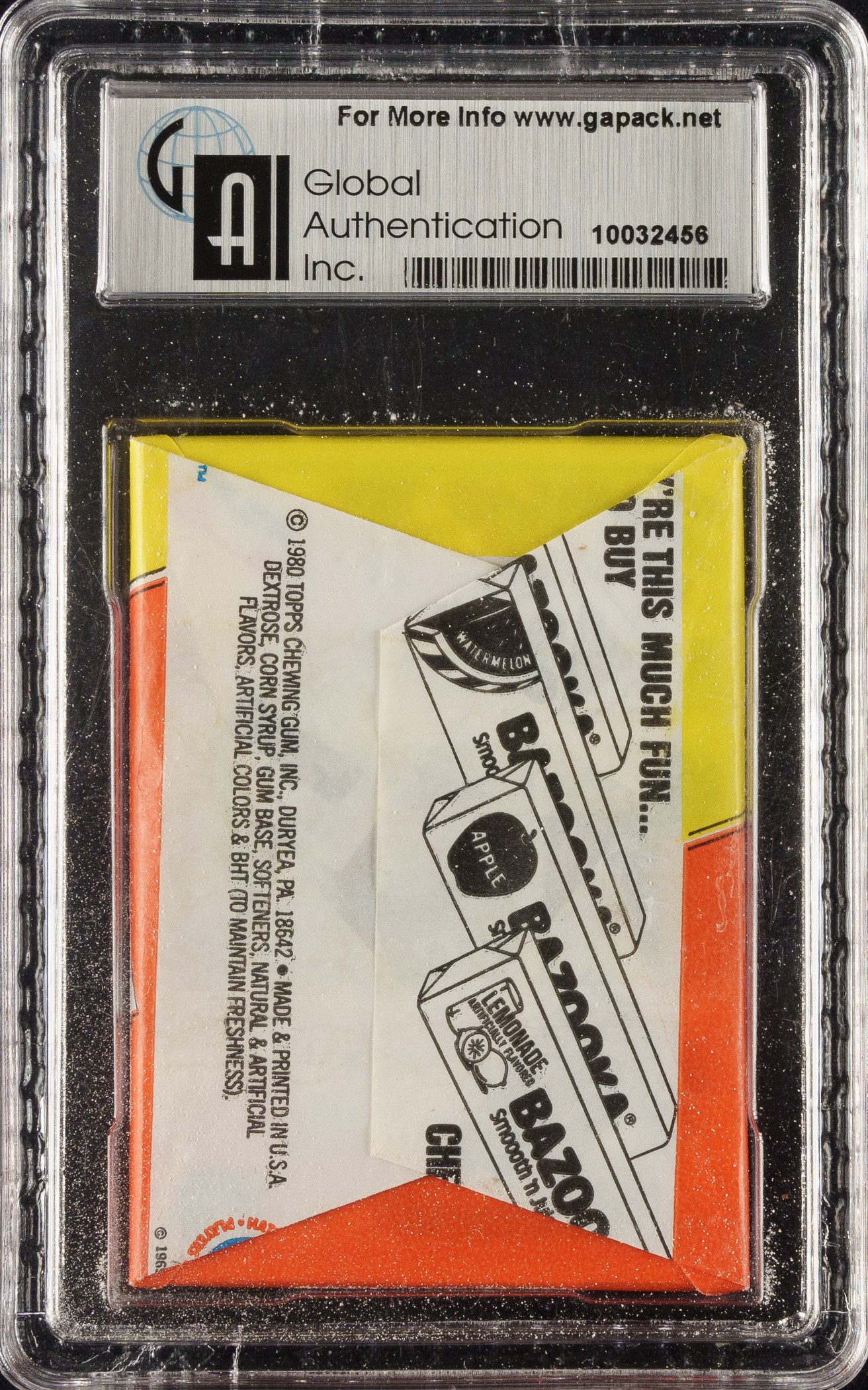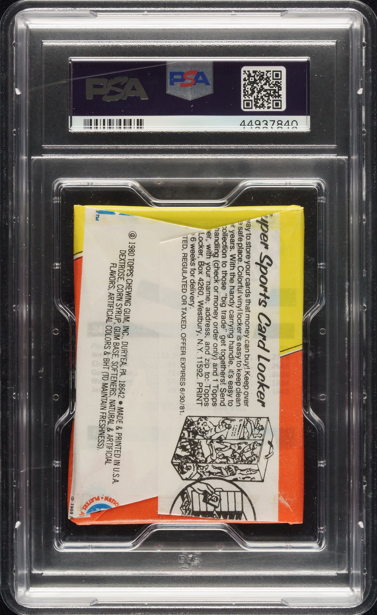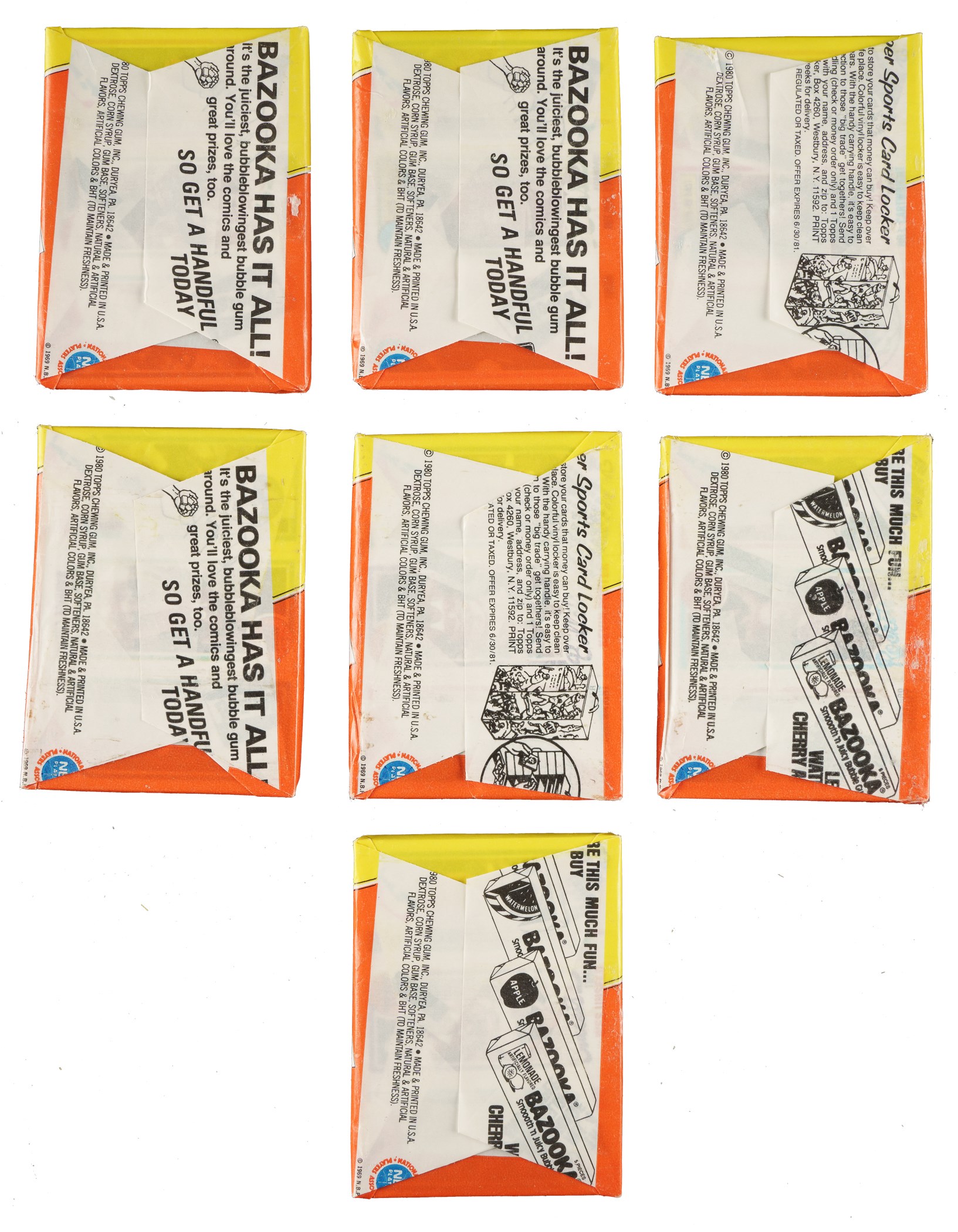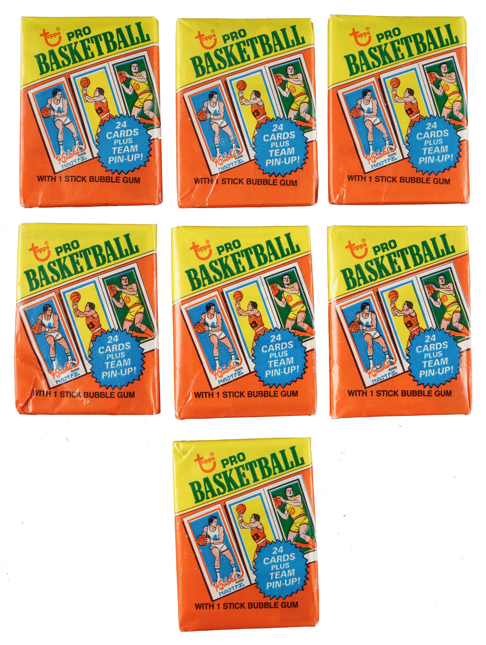 Collection of ten original unopened wax packs from the 1980-1981 Topps basketball set accompanied by the original display box. Three packs have been individually graded and encapsulated by PSA (NM-MT 8 and NM 7) and GAI (NM-MT 8). The 1980-1981 Topps basketball set features the rookie cards of Hall of Famers Larry Bird, Magic Johnson, Maurice Cheeks, Sidney Moncrief, and many other Hall of Famers, including Julius Erving, Kareem Abdul-Jabbar, George Gervin, and Jack Sikma. Steve Hart of the Baseball Card Exchange (the leading authority on unopened material) has personally reviewed these packs, and in his opinion, they are original and unopened. Each pack is bright and clean with tight seals. The display box has light-to-moderate shelf wear. Total: 10 packs and display box. Opening Bid $1,000.