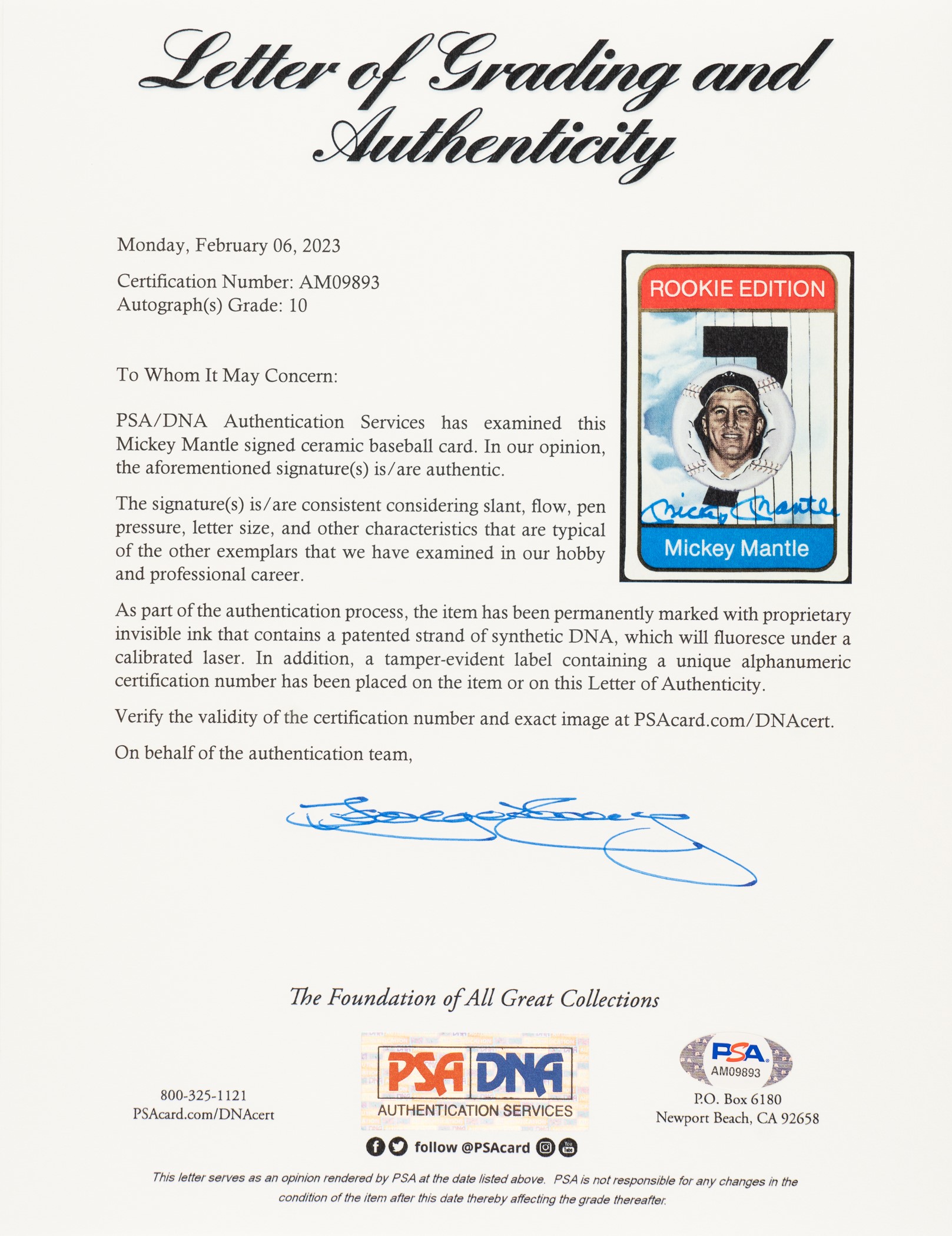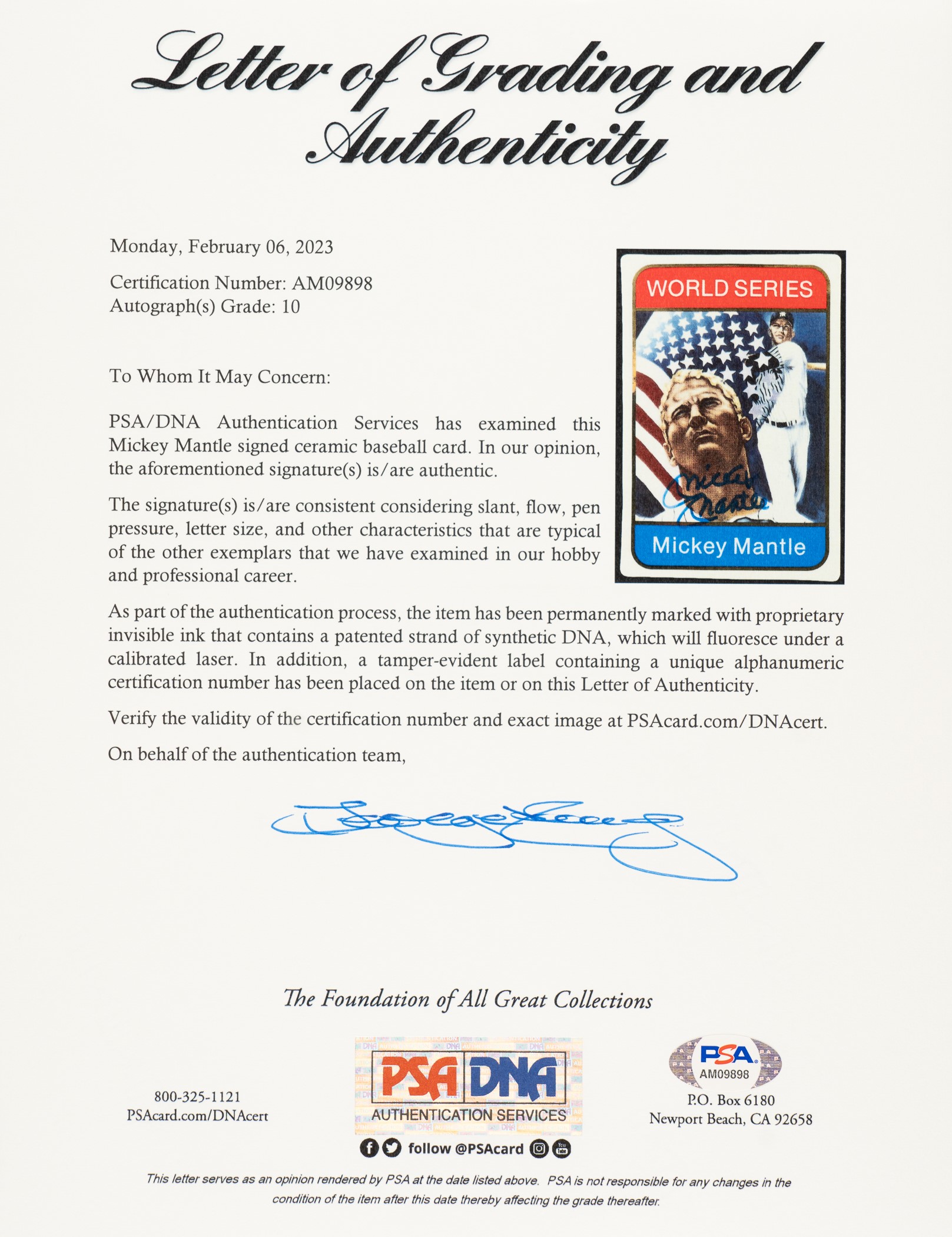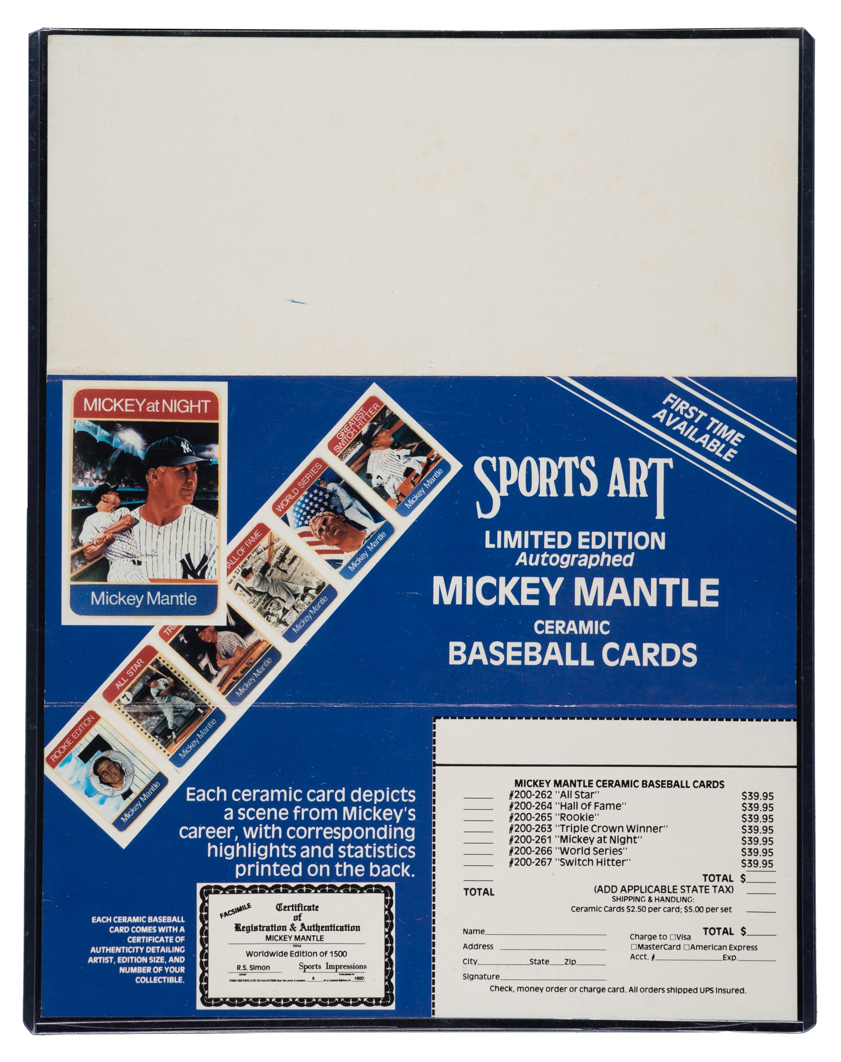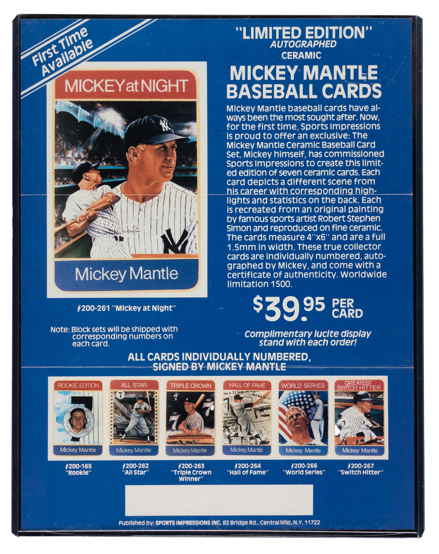 Complete set of seven porcelain cards featuring New York Yankees Hall of Famer Mickey Mantle produced by Sports Impressions from 1986 through 1989. (Please note the contract signed by Mantle for this project is featured as a separate lot in this current auction.) This series was created from the artwork of Robert Stephen Simon. All cards are signed in blue Sharpie and the signatures have been graded GEM MINT 10 by PSA/DNA. The original advertising pamphlet and presentation boxes are included. The cards remain in overall Near Mint condition. Total: 7 cards. Each card comes with a full LOA from PSA/DNA. Opening Bid $1,000.