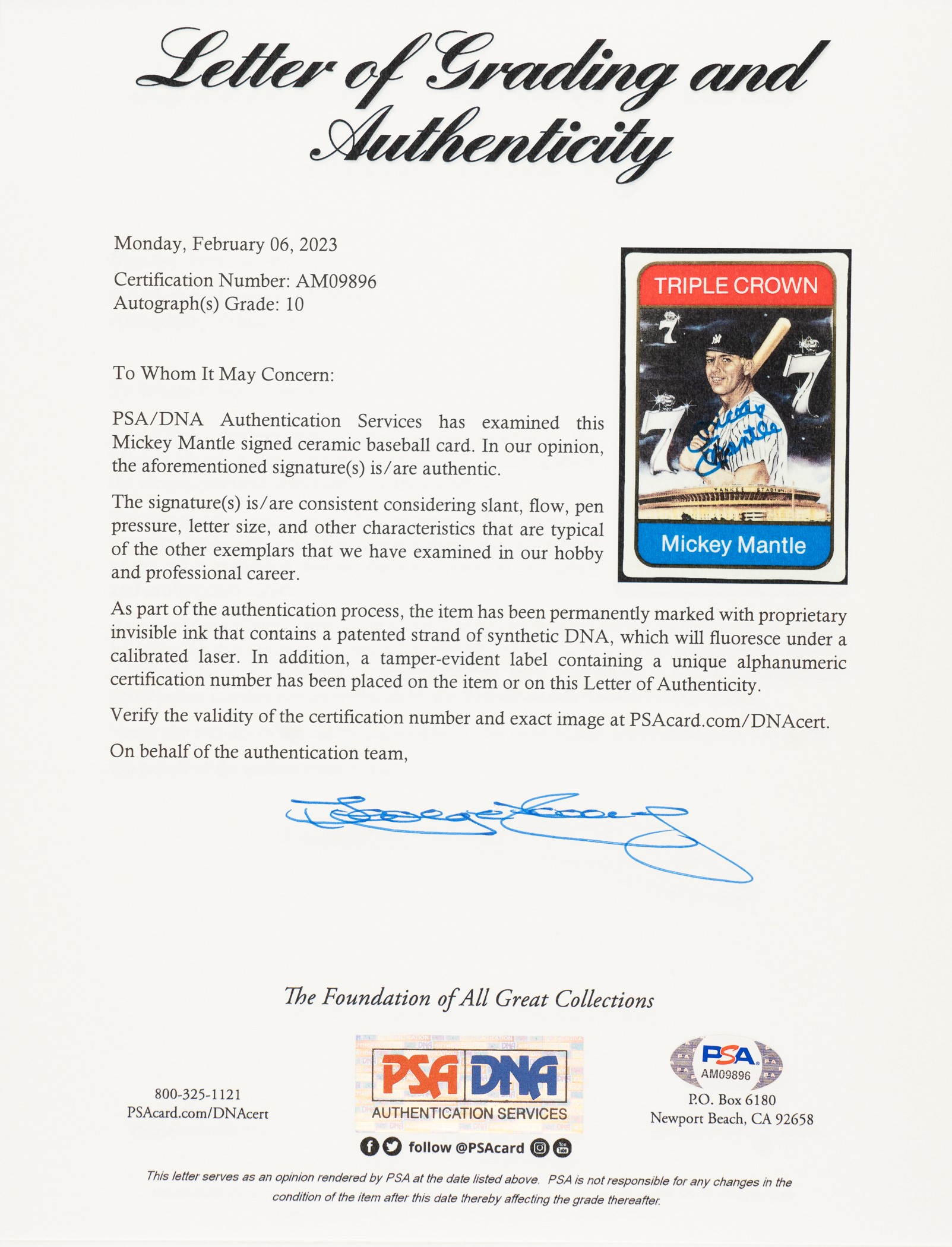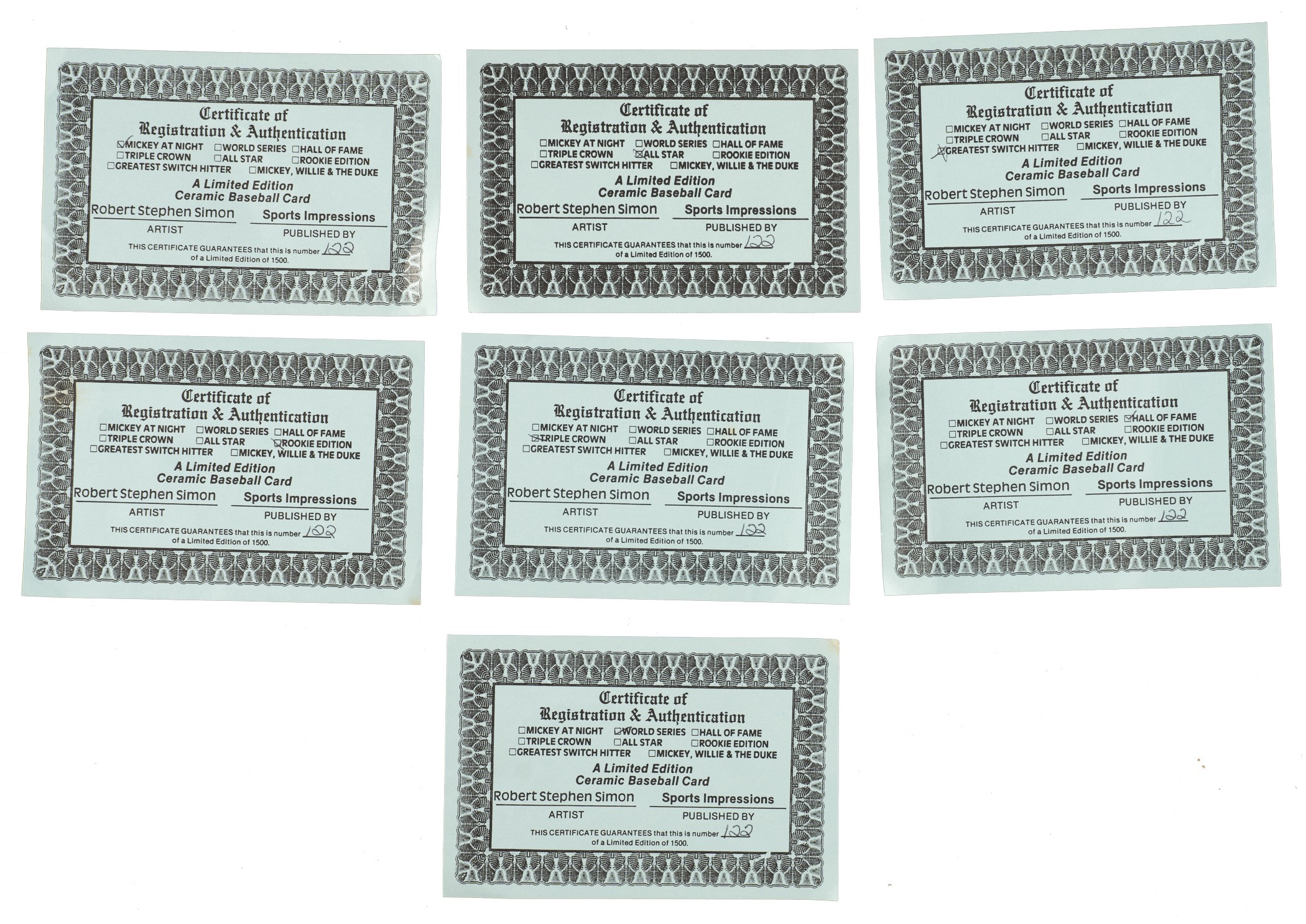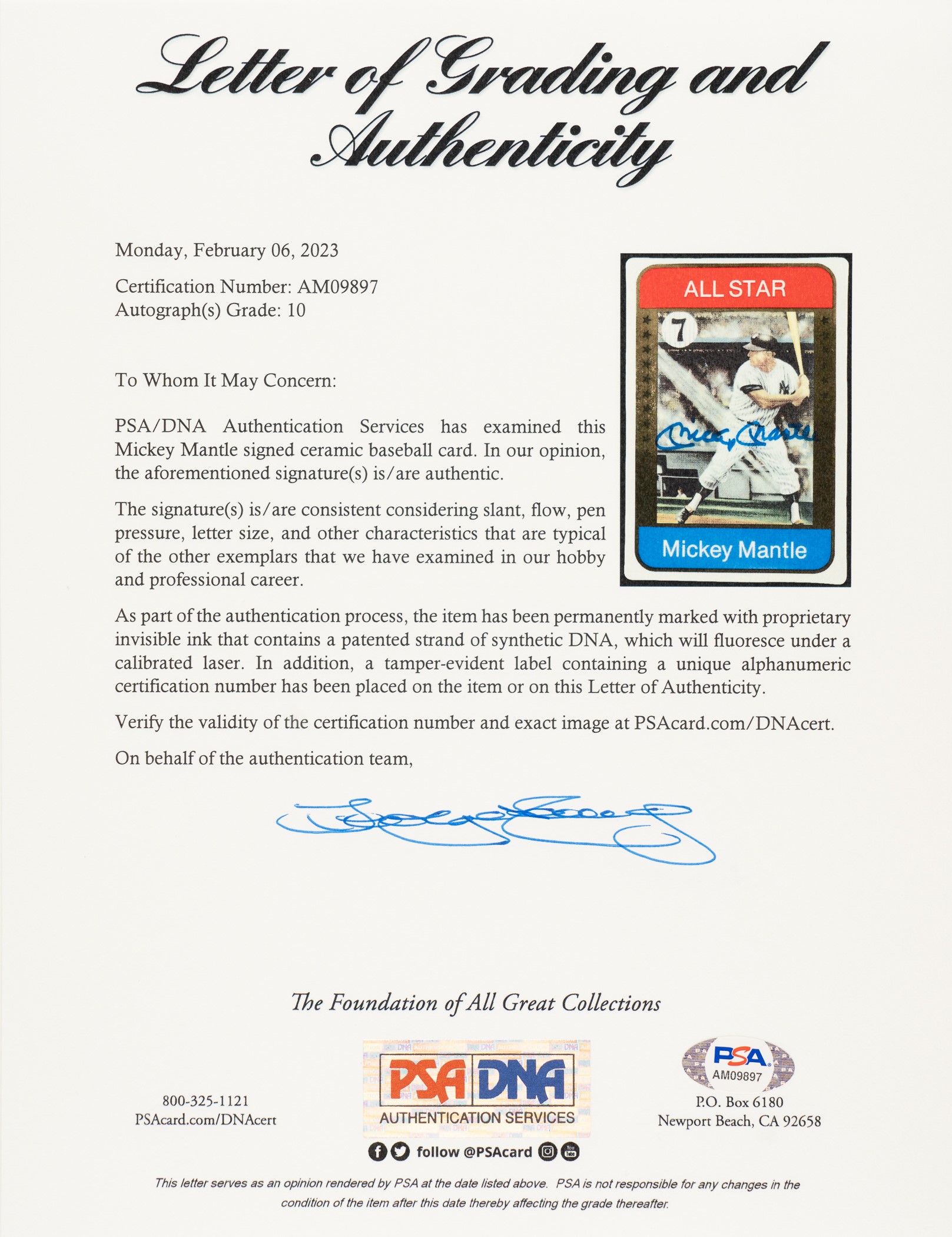 Complete set of seven porcelain cards featuring New York Yankees Hall of Famer Mickey Mantle produced by Sports Impressions from 1986 through 1989. (Please note the contract signed by Mantle for this project is featured as a separate lot in this current auction.) This series was created from the artwork of Robert Stephen Simon. All cards are signed in blue Sharpie and the signatures have been graded GEM MINT 10 by PSA/DNA. The original advertising pamphlet and presentation boxes are included. The cards remain in overall Near Mint condition. Total: 7 cards. Each card comes with a full LOA from PSA/DNA. Opening Bid $1,000.