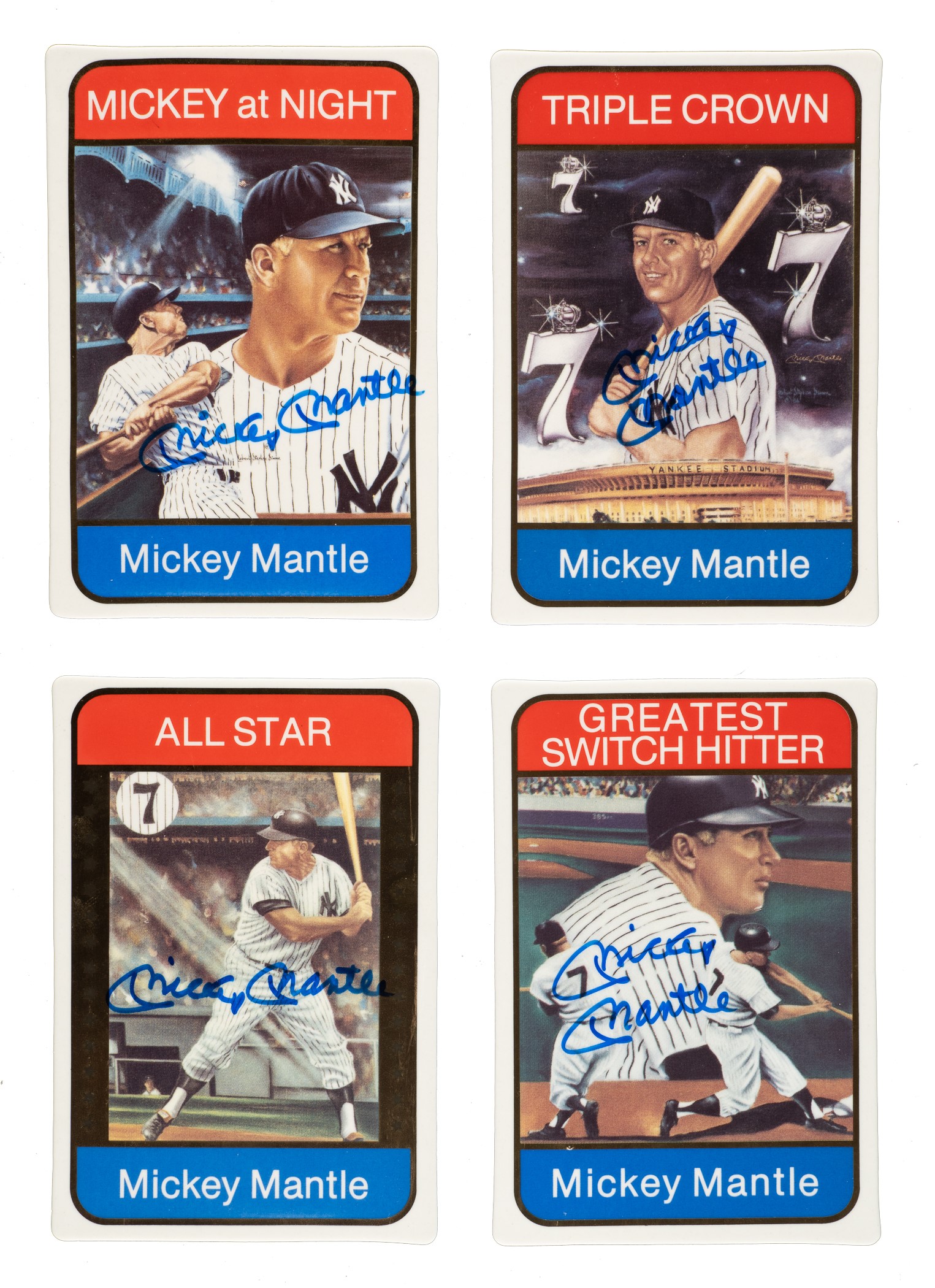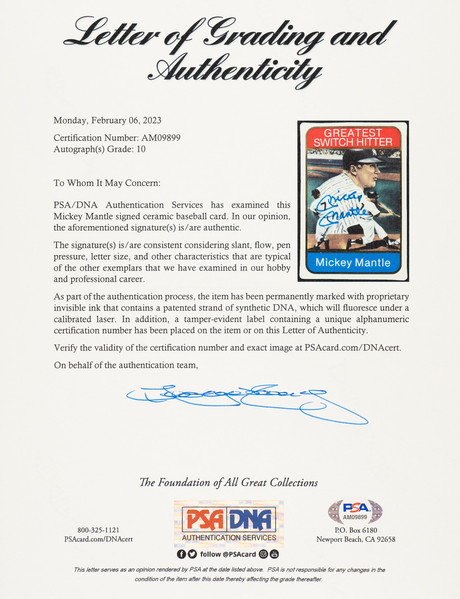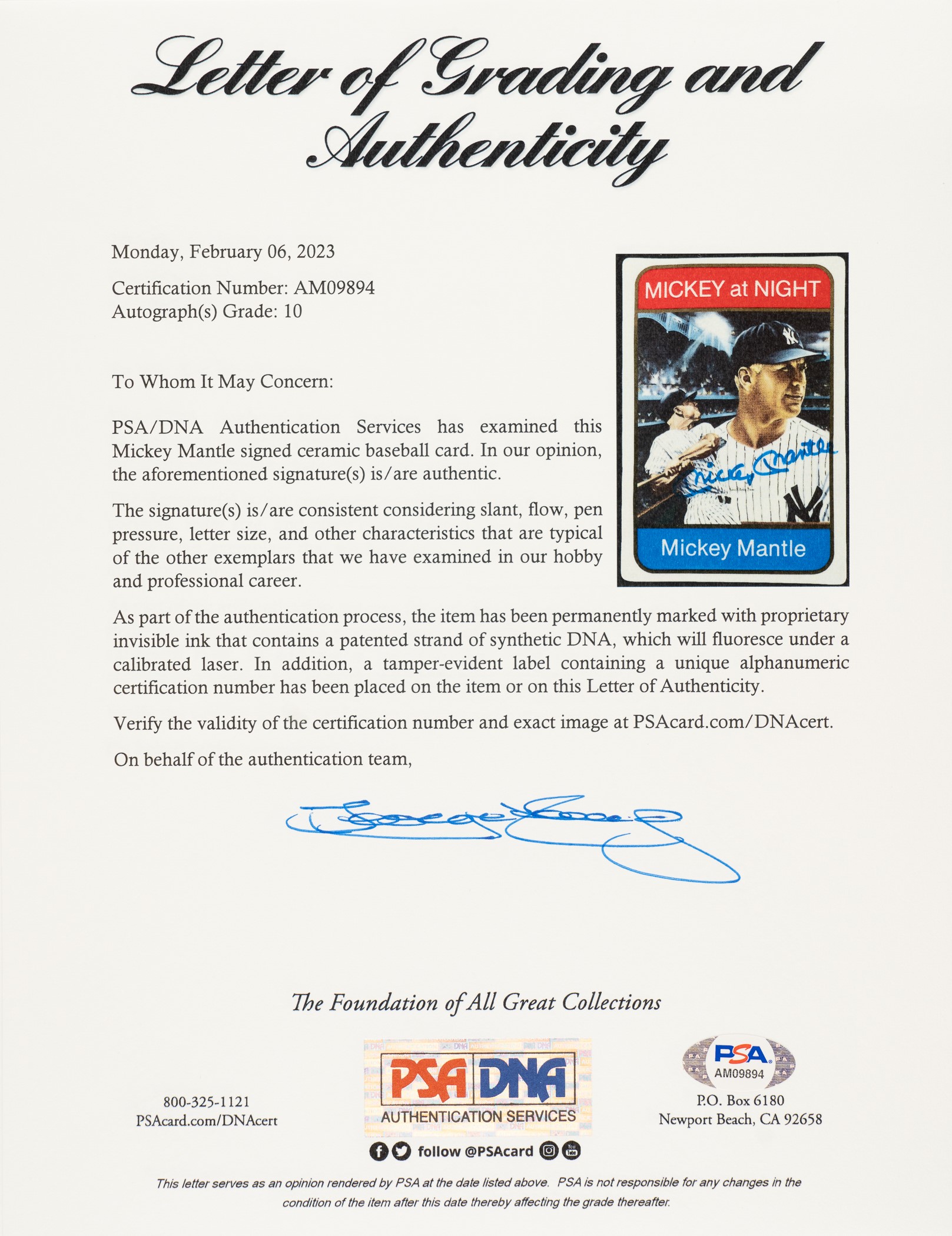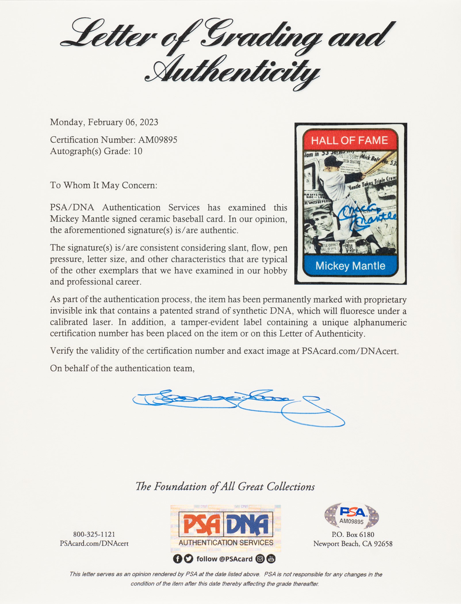 Complete set of seven porcelain cards featuring New York Yankees Hall of Famer Mickey Mantle produced by Sports Impressions from 1986 through 1989. (Please note the contract signed by Mantle for this project is featured as a separate lot in this current auction.) This series was created from the artwork of Robert Stephen Simon. All cards are signed in blue Sharpie and the signatures have been graded GEM MINT 10 by PSA/DNA. The original advertising pamphlet and presentation boxes are included. The cards remain in overall Near Mint condition. Total: 7 cards. Each card comes with a full LOA from PSA/DNA. Opening Bid $1,000.