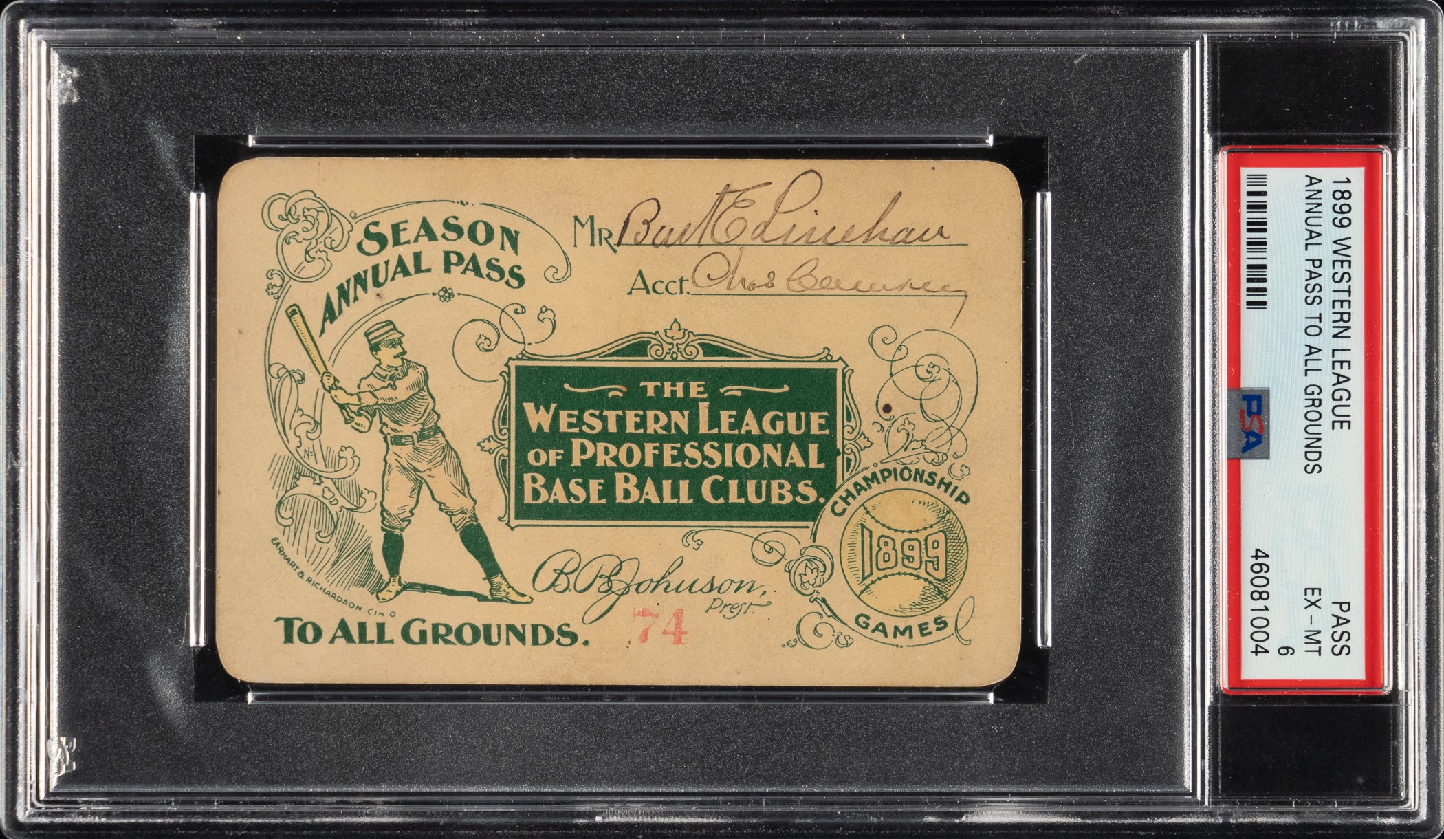 Exceedingly rare Western League "Season Annual Pass To All Grounds" issued for the 1899 season. Graded EX-MT 6 by PSA. The colorful design includes an illustration of a baseball player in a batting pose, with the year of issue (1899) printed in the center of an illustrated baseball located in the lower right corner. The name of the recipient (Burt E. Lineman) is handwritten in black fountain pen in the upper right corner, as is the name of the person on whose account the pass was issued: Chas Comiskey. The facsimile signature of league president Ban Johnson is printed along the base, directly above the pass number ("74"). The eight host cities of Western League clubs in 1899 are listed on the reverse: Kansas City, St. Paul, Milwaukee, Minneapolis, Detroit, Buffalo, Columbus, and Indianapolis. The Western League was the forerunner to the American League. Comiskey was the owner/manager of the St. Paul Apostles in 1899, and the following year he moved his club to Chicago and renamed them the White Sox. In 1893 Ban Johnson took over the duties as president of the Western League, a struggling minor league. Under Johnson's leadership the Western League quickly flourished and by the turn of the century was considered the strongest minor league circuit in the country. Johnson was ambitious however, and in 1900 he changed the name of the league to the American League in anticipation of his next big move: declaring the American League to be a second Major League in 1901. The bold gamble worked. The American League was not only successful in gaining a foothold in major cities but also lured many of the top National League stars to its rosters. As a result, American League attendance topped that of the National League during its first two seasons. In 1903 the National League, realizing that Johnson's upstart league was here to stay, acquiesced and signed a new National Agreement that formally recognized the American League as a second Major League. This is both a rare and significant Western League season pass dating to the league's final season before being renamed the American League. The pass (4 x 2.5 inches), which is printed on heavy paper stock, displays light toning and is otherwise free of any significant flaws. Opening Bid $300.