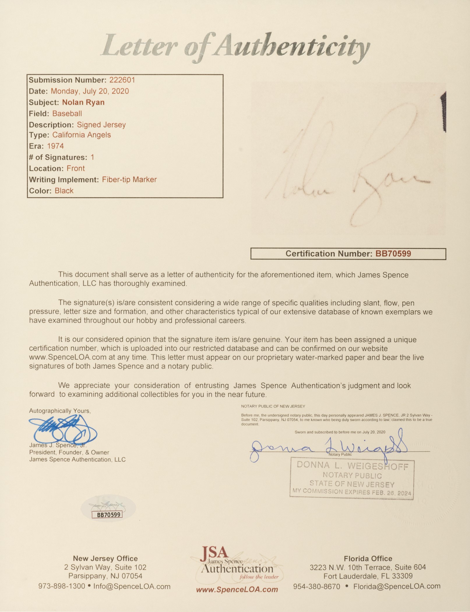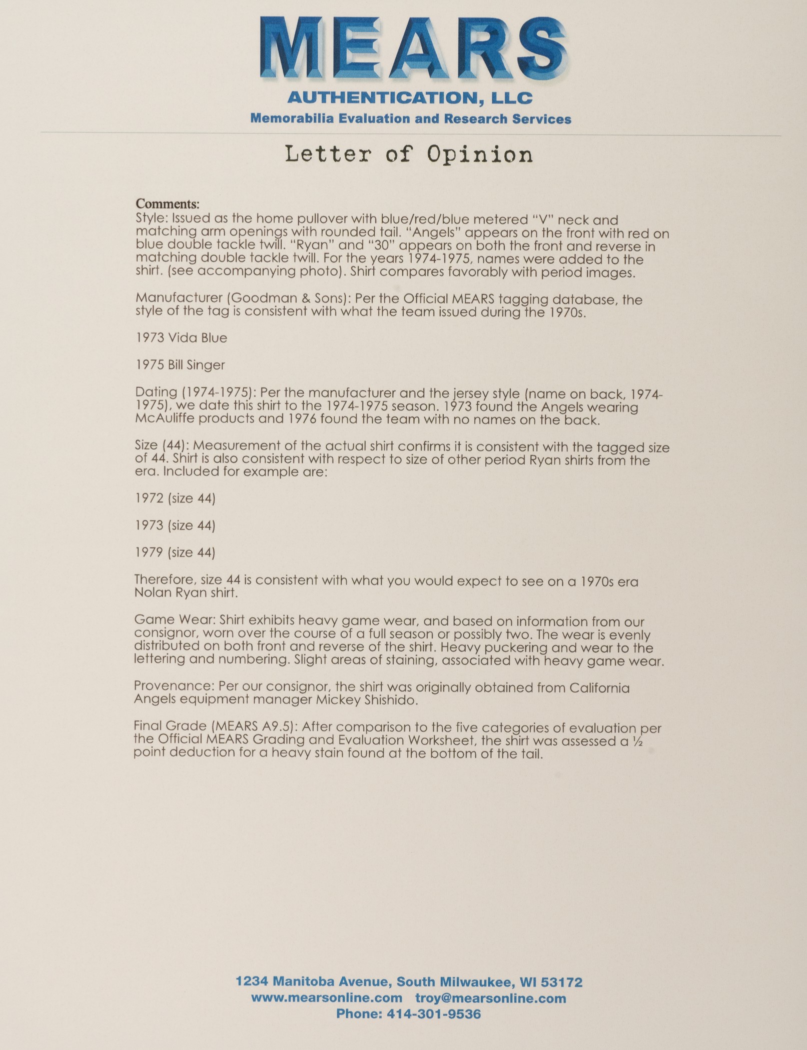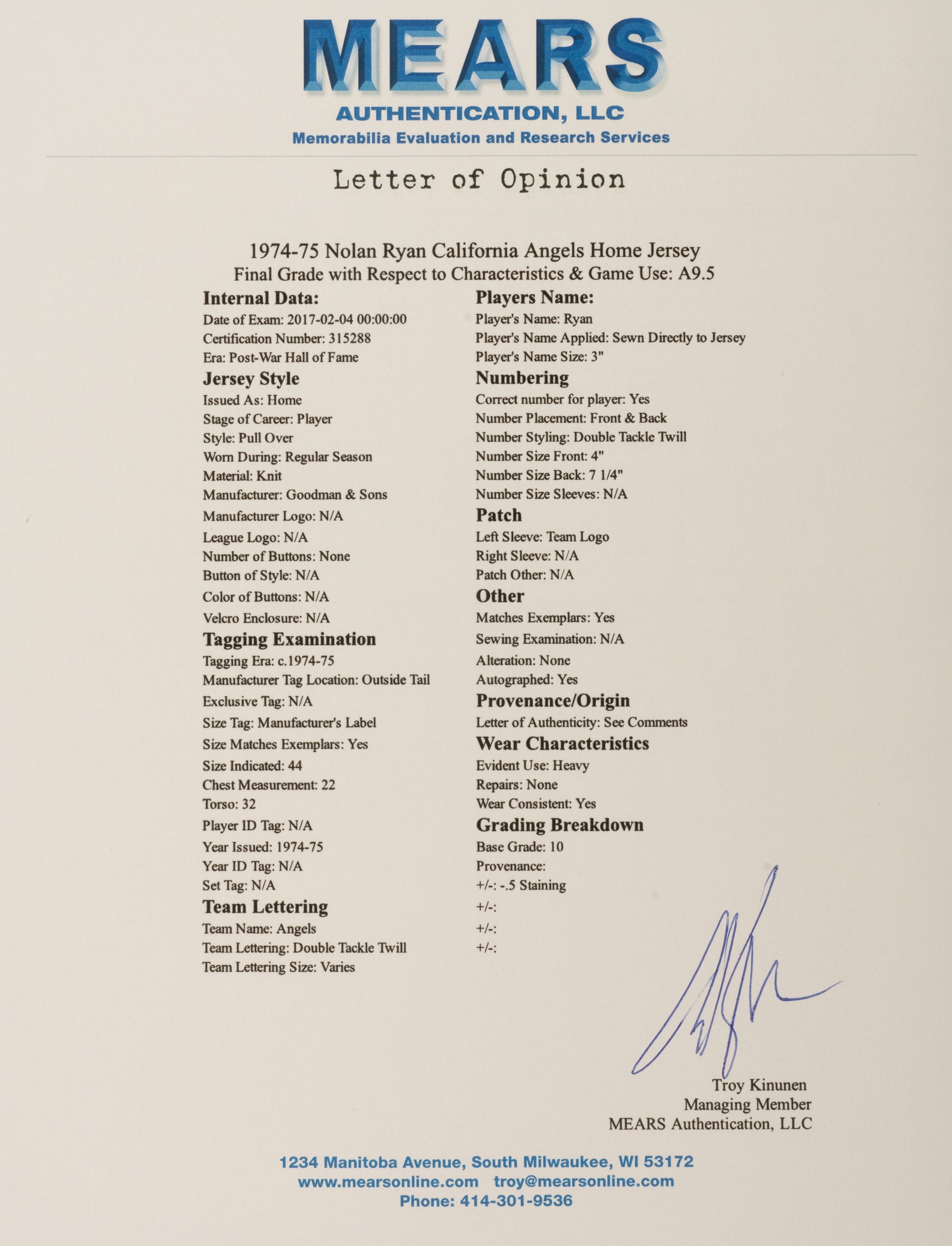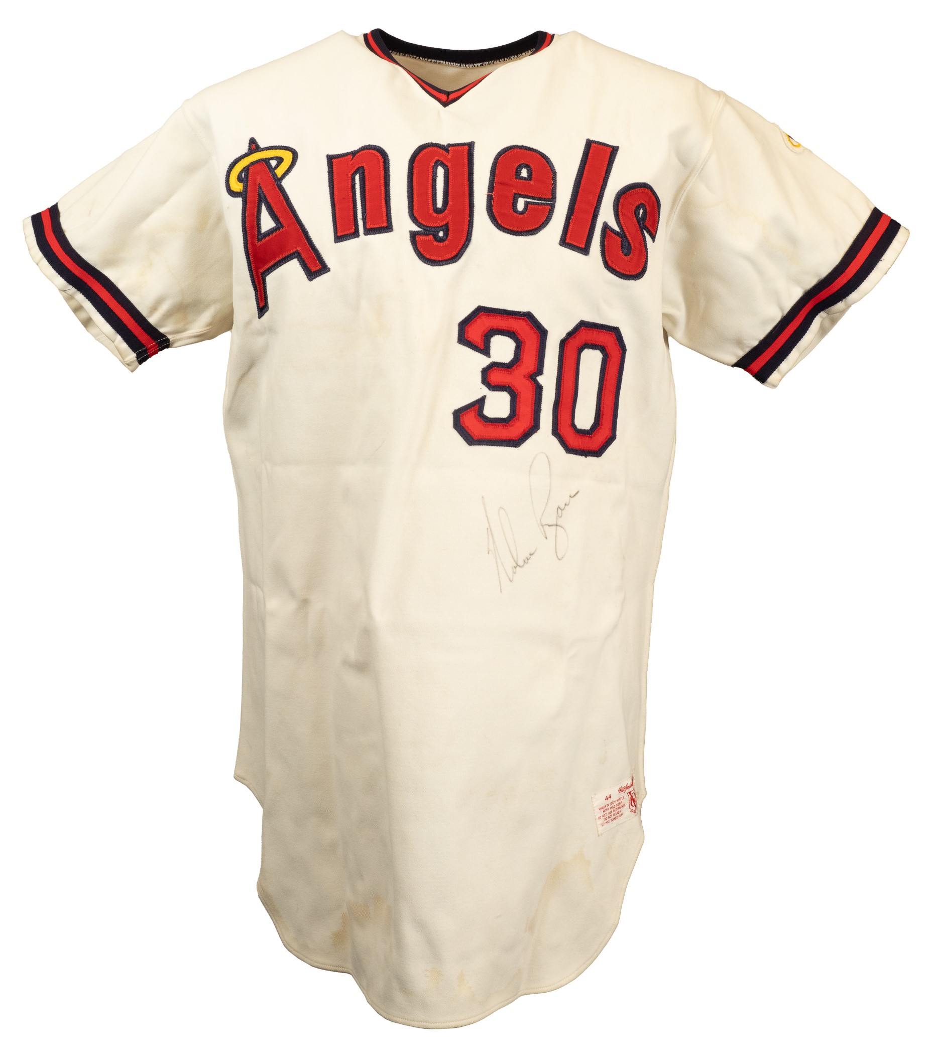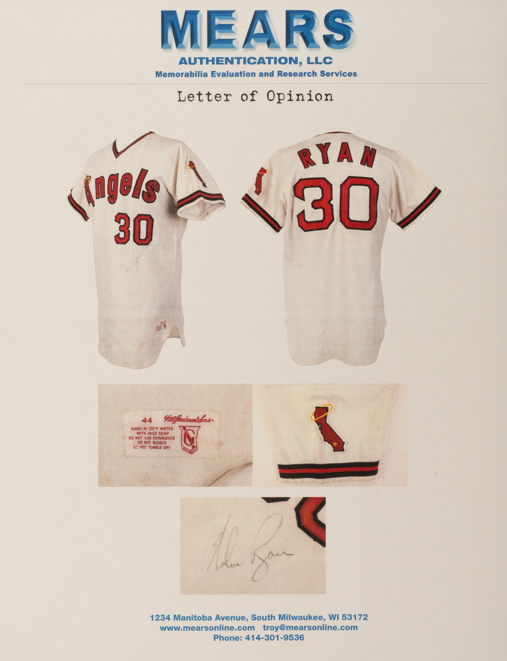 California Angels home jersey worn by Hall of Fame pitcher Nolan Ryan in 1974-1975. Grade A9.5 by MEARS. The white knit jersey is lettered “Angels” across the front and features the number “30” on the left breast and reverse. “Ryan” is lettered on the reverse directly above the number. All letters and numerals are appliquéd in red-on-blue tackle twill. A “W. A. Goodman & Sons 44” label is located on the left front tail. An Angels team patch adorns the left sleeve. Ryan has signed the jersey in black marker on the left breast. The jersey is original as issued, with no alterations, and displays heavy wear, including light staining throughout. In December 1971, in what was one of the most lopsided trades in history, the California Angels acquired Nolan Ryan and three other players from the New York Mets for Jim Fregosi. For the next nine seasons Ryan dominated American League hitters while leading the league in strikeouts every year but one, including a modern-day record of 383 in 1973. In his first season with the Angels, Ryan won 18 games with a league-leading 329 strikeouts, 9 shutouts, and a 2.28 ERA. Ryan won 138 games for the Angels between the years 1972 and 1979 before being traded to the Houston Astros. In addition to throwing a record seven no-hitters, Ryan retired as the all-time leader in strikeouts (5,714) and is one of only 24 pitchers to win 300 games. He was elected to the Hall of Fame in 1999, his first year of eligibility. Graded A9.5 by MEARS (base grade of 10 with a half-point deduction for staining on the jersey). Full LOA from MEARS. (for the jersey only). Full LOA from James Spence/JSA. (for the signature only). Opening Bid $5,000.