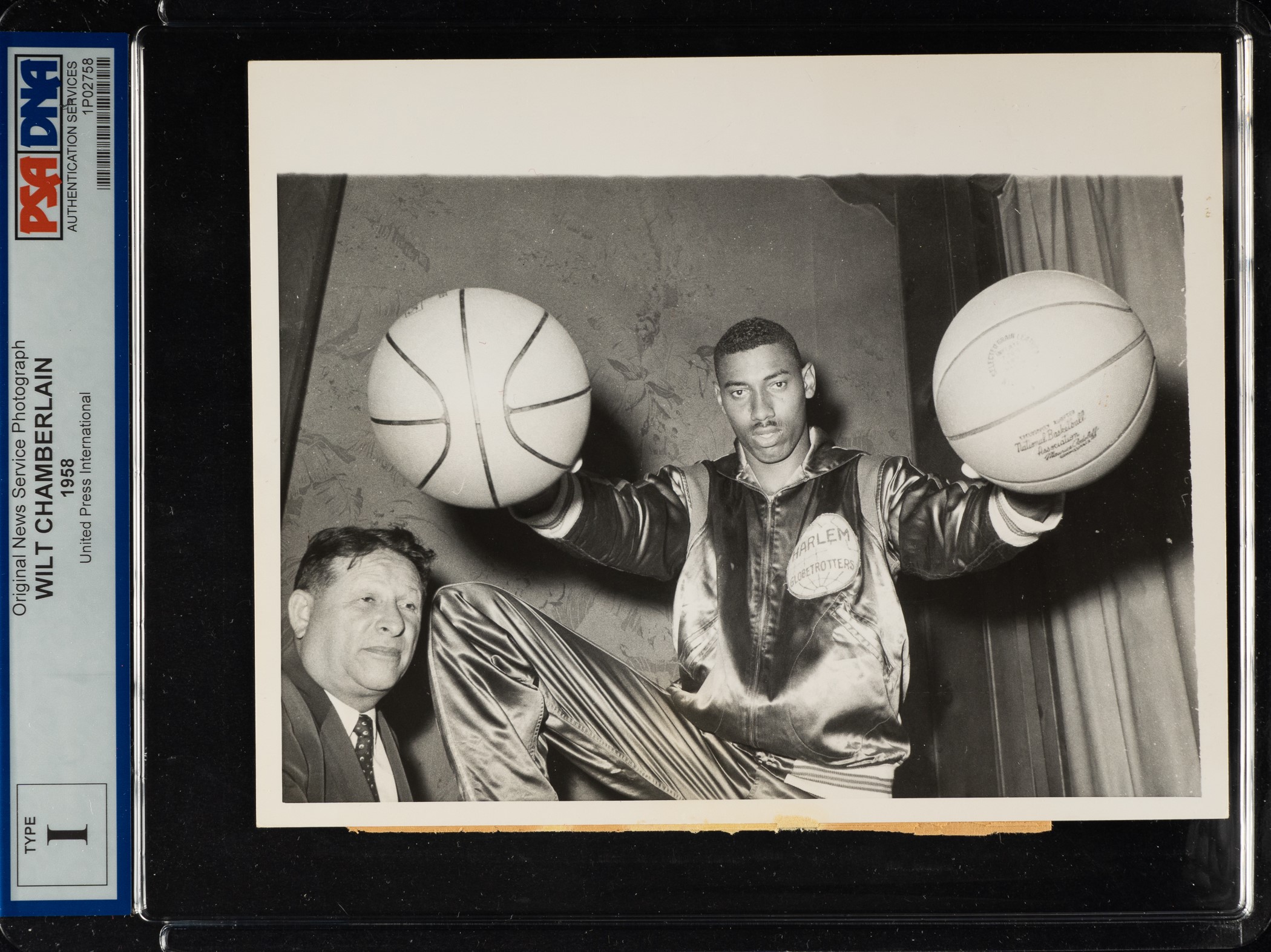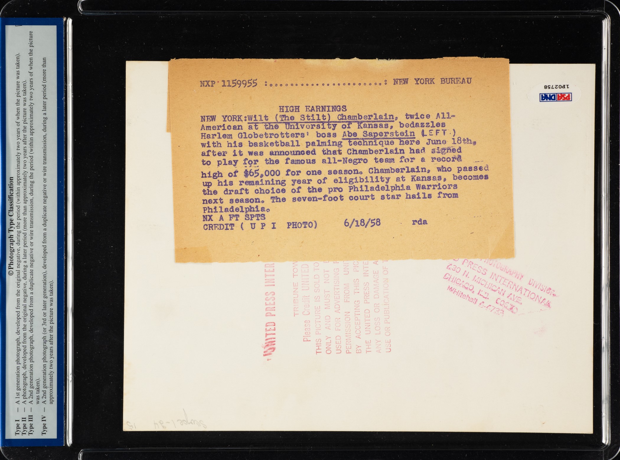 Original news photo capturing Wilt Chamberlain as a member of the famed Harlem Globetrotters in 1958. Encapsulated and certified as an original Type I photograph by PSA/DNA. Chamberlain is pictured palming a pair of basketballs next to Abe Saperstein, who founded the Globetrotters. Chamberlain played with the Globetrotters for one season (1958-1959) before entering the NBA. The reverse features the original paper news caption, dated "6/18/58" along with a pair of "United Press International" credit stamps. A PSA/DNA certification sticker and editorial notation are also visible on the reverse. The photo (9 x 7 inches) is in Excellent condition overall. Opening Bid $200.