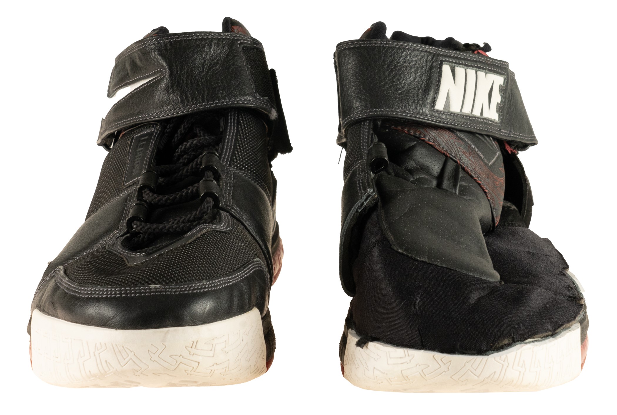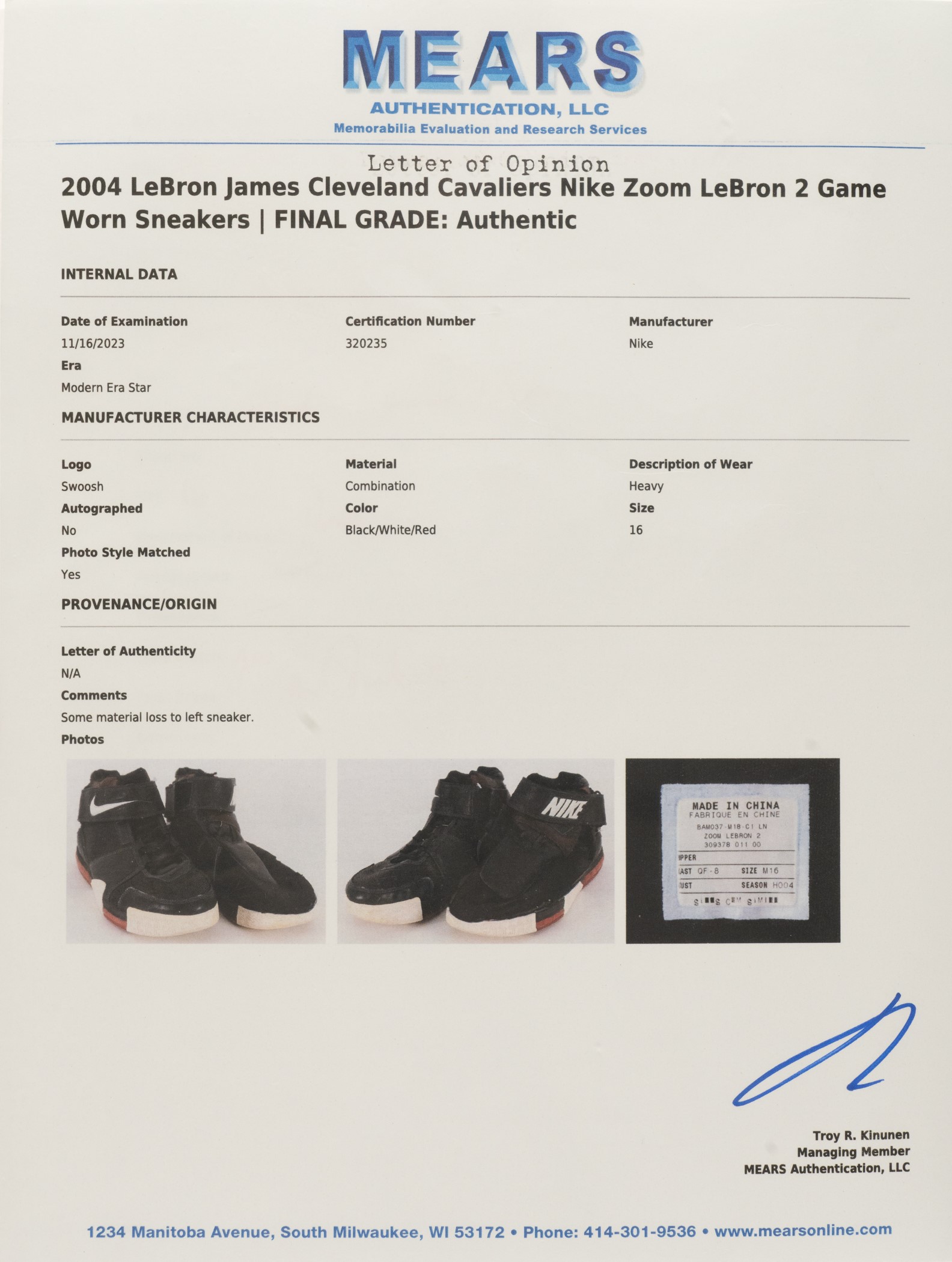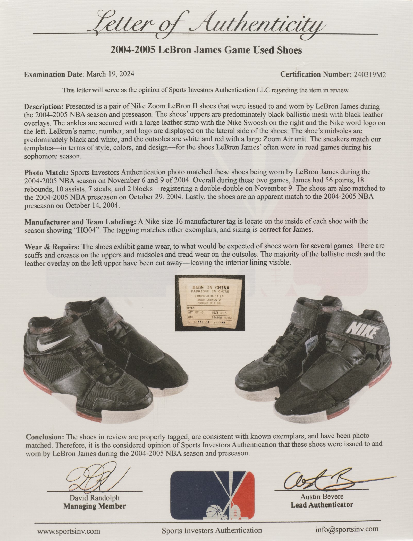 Offered is a pair of Nike Zoom LeBron II sneakers worn by LeBron James as a member of the Cleveland Cavaliers during the 2004-2005 NBA season, his second in the league. Accompanied by individual LOAs from Mears and Sports Investors, the latter of whom has conclusively matched the sneakers to a pair worn by James during two regular-season games and one pre-season game. Each black sneaker (size 16) features James' name, number, and logo along the outer-back portion. The shoes display heavy overall use, with scuff marks and creasing visible along the exterior, and tread wear on the outsoles. Please note the majority of the ballistic mesh and leather on the upper portion of the left sneaker has been cut away, leaving the interior lining visible. After a historic rookie season that culminated with James being awarded the Rookie of the Year award, James continued his ascension toward superstardom during the 2004-2005 season. According to Sports Investors Authentication, James wore this particular pair of sneakers during a November 6, 2004, regular-season game against the Milwaukee Bucks and a November 9, 2004, regular-season game against the Atlanta Hawks. James finished with 31 points, eight rebounds, and six assists in a loss against the Bucks and 25 points, 10 rebounds, and four assists in a win against the Hawks. The shoes are also photo-matched to a October 29, 2004, pre-season game and are an apparent match to an October 14, 2004, pre-season game. This is an outstanding pair of game-used sneakers dating from early in Lebron James' legendary career. The size/weight of this item requires that there will be an additional shipping charge for this lot. Opening Bid $25,000.