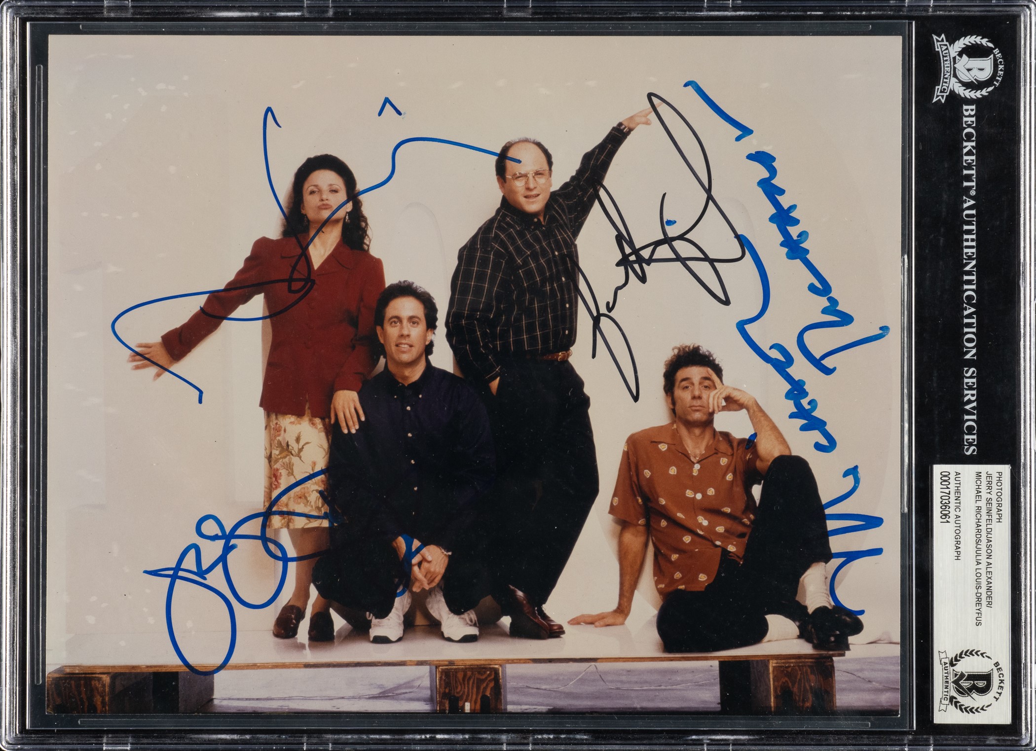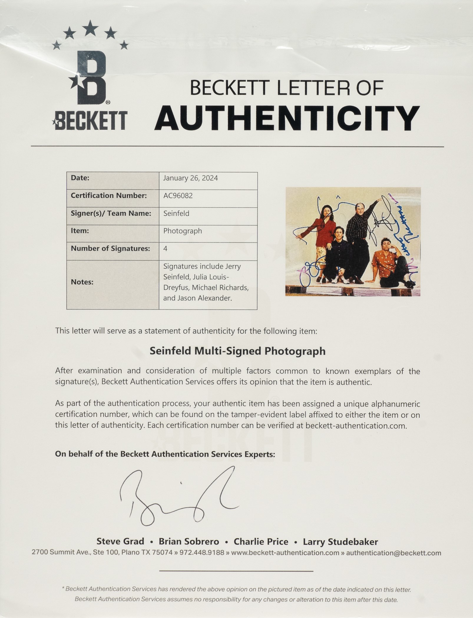 Color photo picturing the four main characters of the Seinfeld television show, signed in both black and blue ink by each respective actor: Jerry Seinfeld, Jason Alexander, Julia Louis-Dreyfus, and Michael Richards. All of the signatures have been boldly scripted. Encapsulated by Beckett, with the signatures certified as "Authentic." The photo (10 x 8 inches) is in apparent Excellent to Mint condition. Full LOA from Steve Grad and Brian Sobrero/Beckett Authentication Services. Opening Bid $300.