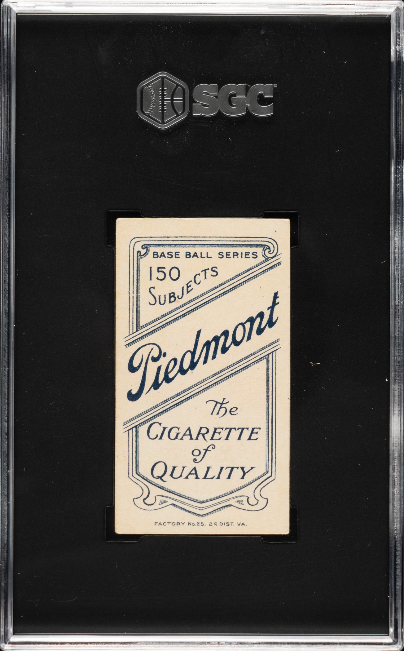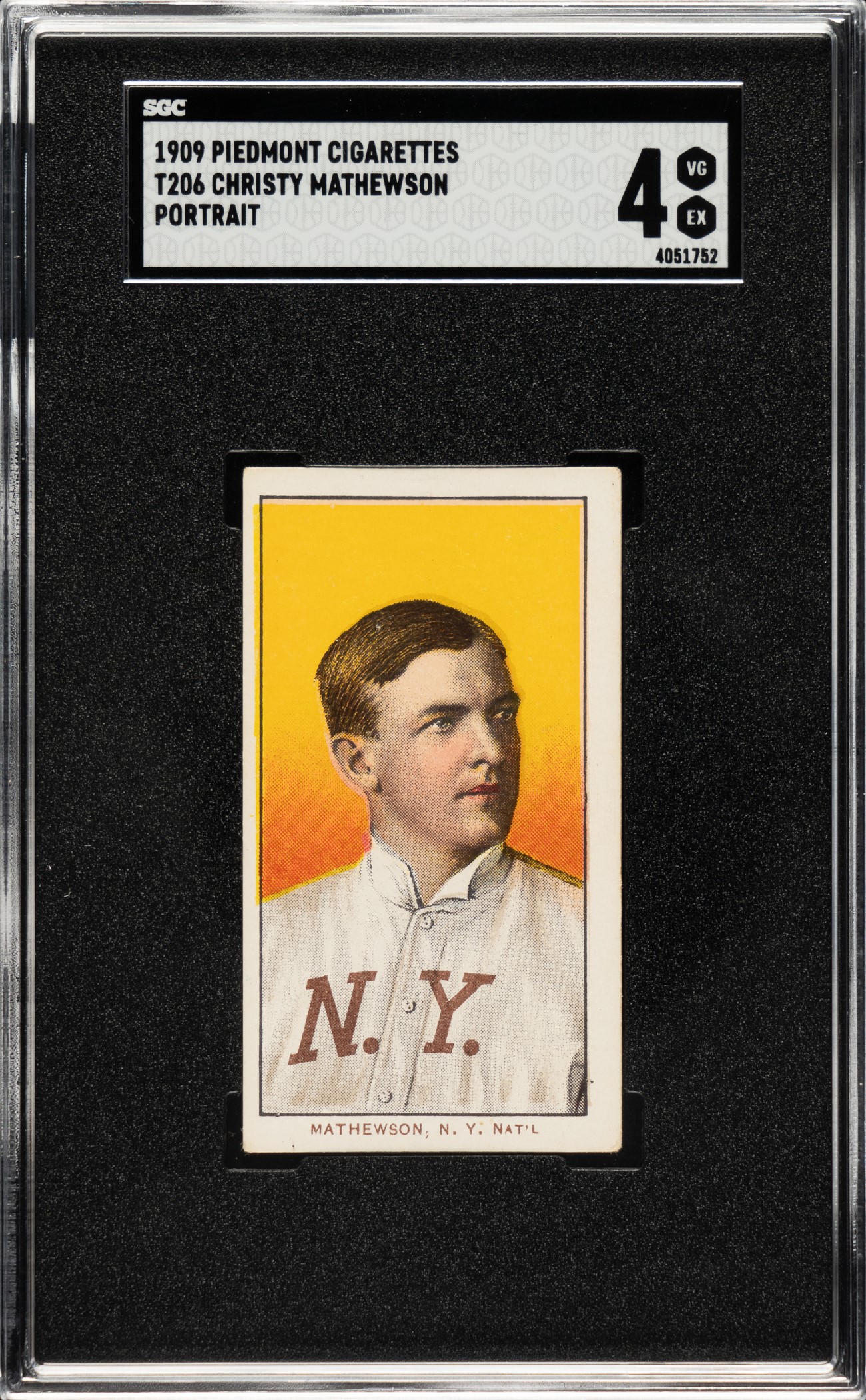Graded VG/EX 4 by SGC. Fantastic mid-grade example of one of the three classic poses of New York Giants Hall of Famer Christy Mathewson from the T206 White Borders series. This portrait pose is one of the most popular of all T206s and all Mathewson cards. This example has beautiful colors, outstanding registration, and light corner wear. Boldly printed Piedmont 150 advertising reverse. Opening Bid $500.
