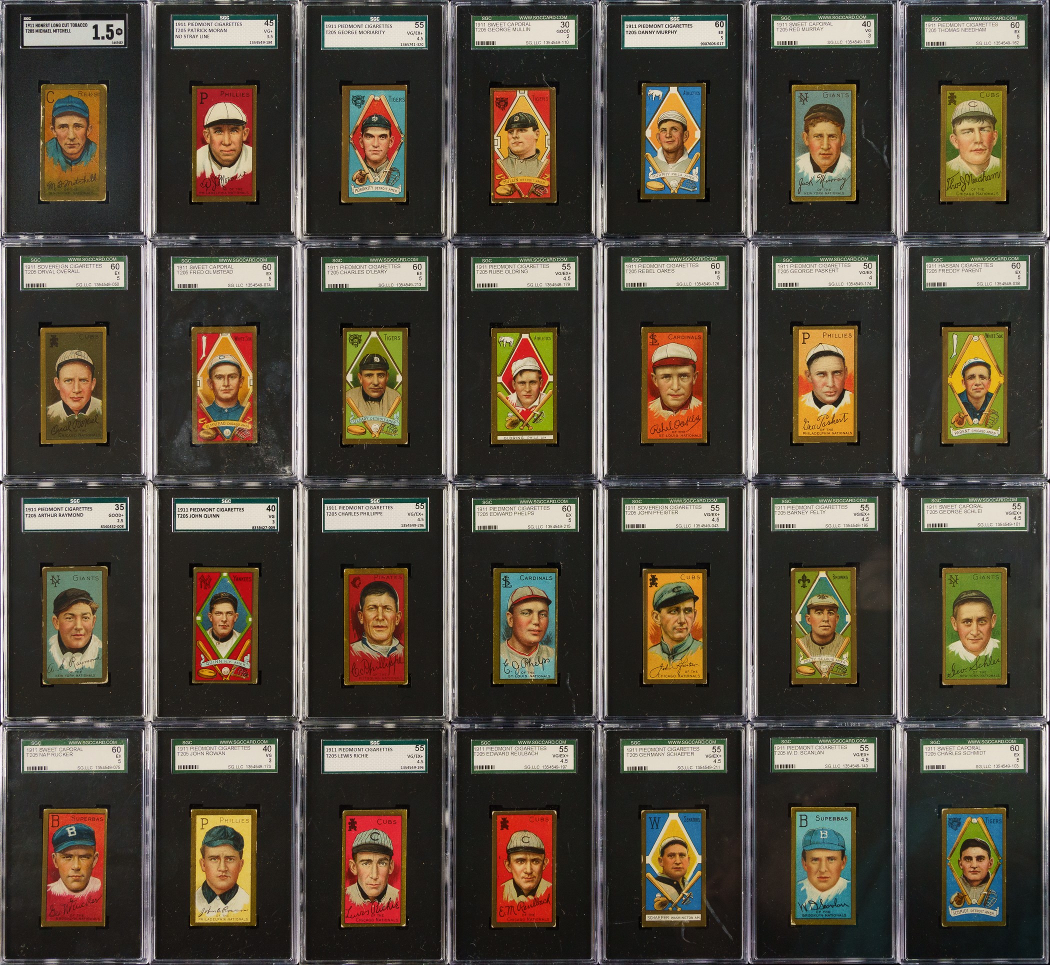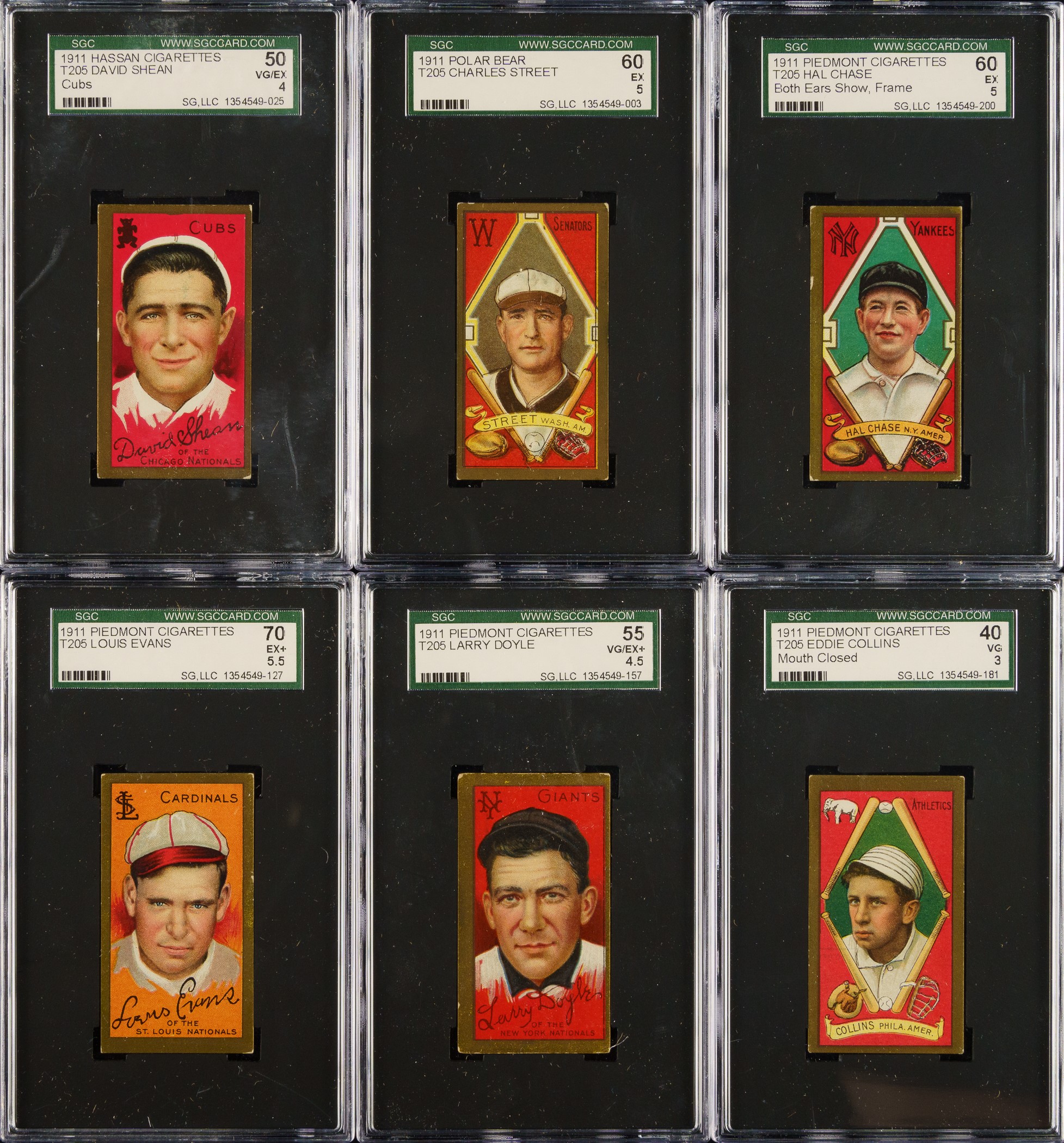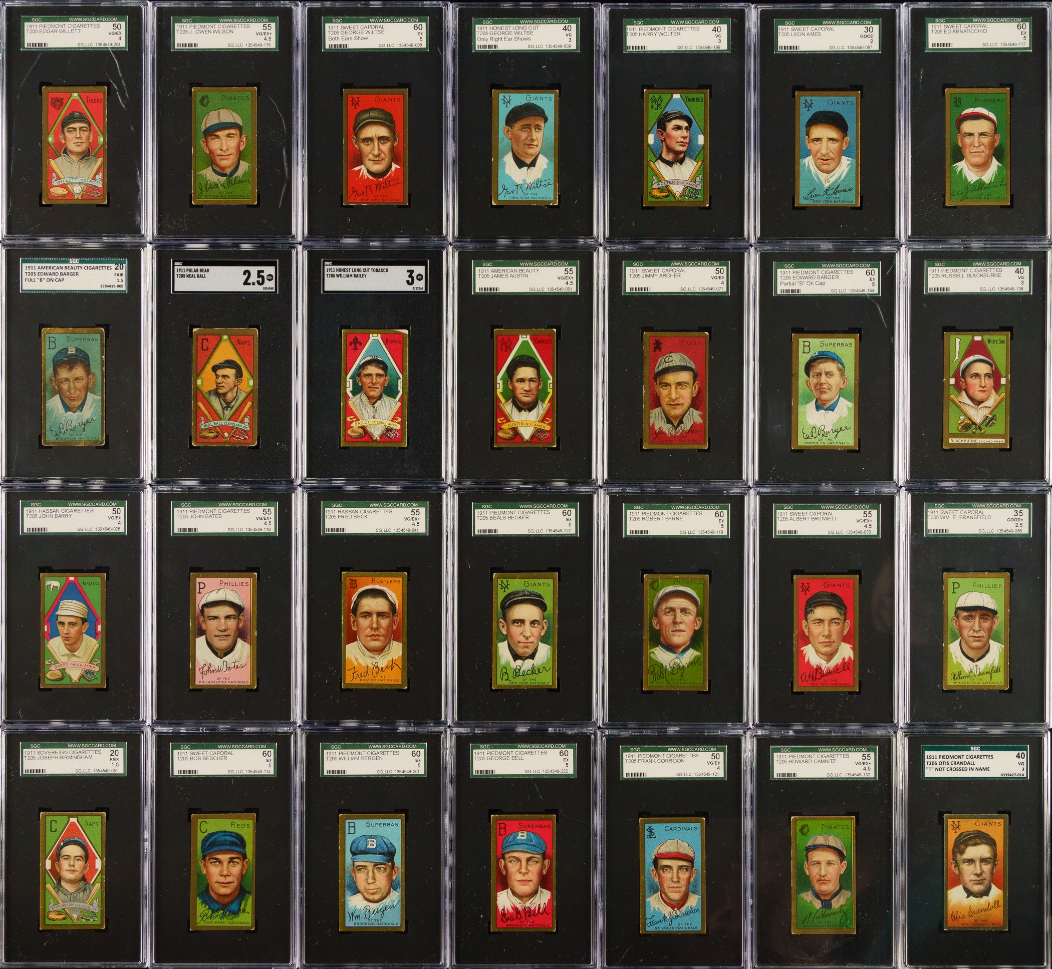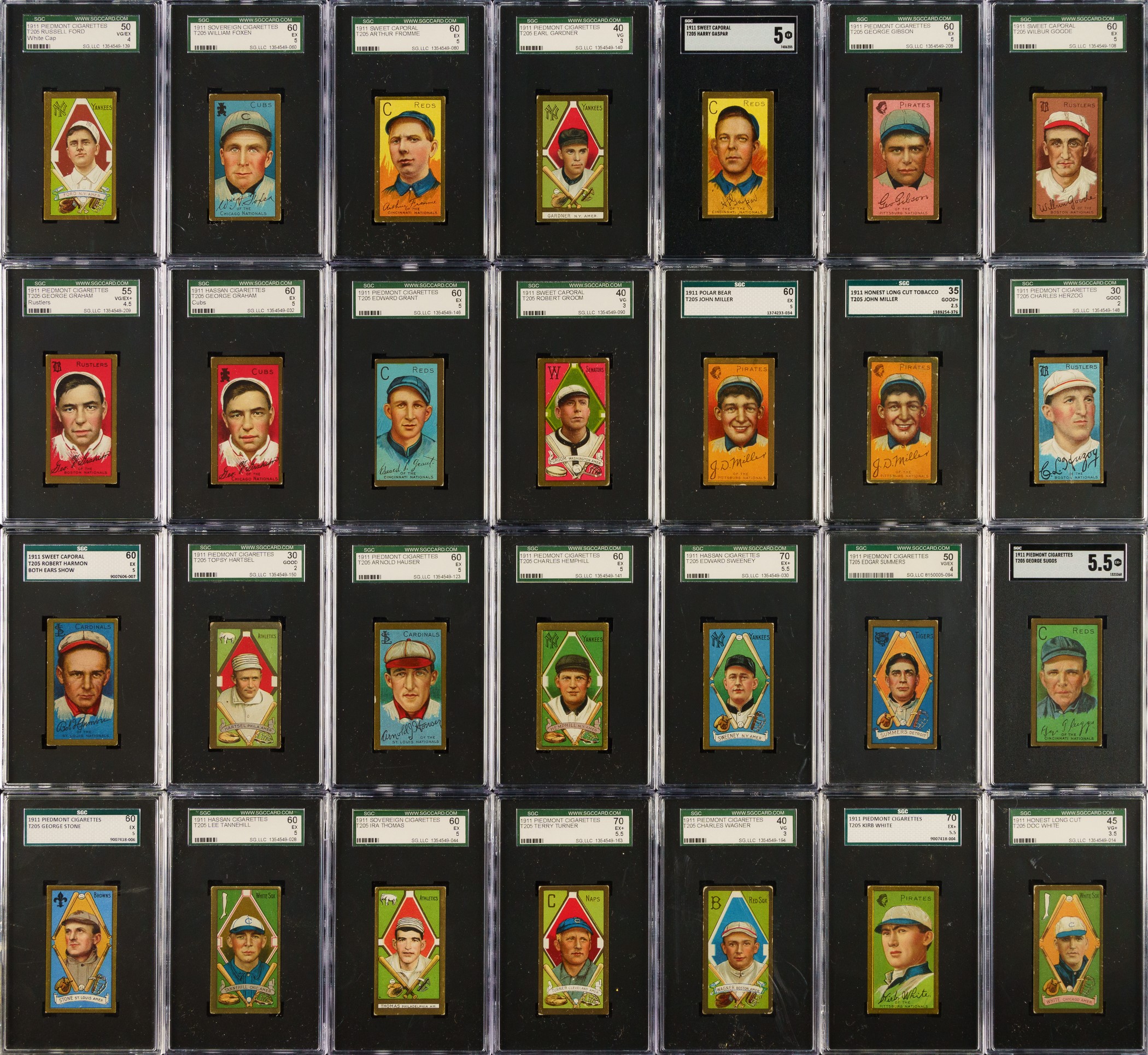 Presented is a mid-grade near-complete master set of T205 Gold Borders consisting of 174 different (of 221) cards, entirely graded and encapsulated by SGC. The T205 Gold Borders set is a classic issue that includes the great stars of the era and many rarities, which make it one of the most challenging and difficult-to-complete of all tobacco-card sets. Overall, this is a very attractive and consistent T205 near-complete set. This set includes the following advertising backs: Sovereign (14), American Beauty (3), and Polar Bear (7). SGC Grading Composite: EX+ 5.5 (12 cards): Including Batch (minor leaguer), Donohue, Lee (minor leaguer), Suggs, Sweeney, Turner, and K. White. EX 5 (54 cards): Including Adkins (minor leaguer), Barger/part "B", Chase/frame ends, Fisher, Graham/Cubs, Grant, Hanford (minor leaguer), Karger, Leifield/"A. P." on front (Polar Bear back), and Miller (Polar Bear back). VG/EX+ 4.5 (38 cards): Including Kleinow, McAllister (minor leaguer), Merritt (minor leaguer), and Scanlan. VG/EX 4 (14 cards): Including Cady (minor leaguer), Ford/white, Frick (minor leaguer), Latham/W. A. Latham on back, Phelan (minor leaguer), and Shean/Cubs. VG+ 3.5 (9 cards): Including Dougherty/red sock and Hoblitzell/"Cin." after 1908 stat. VG 3 (23 cards): Including Chase/gold frame extends (American Beauty back), Collins/mouth closed, Crandall/"t" not crossed, Hoblitzell/name incorrect, Rowan, Wagner, and Wiltse/right ear. GOOD+ 2.5 (7 cards): Including Leifield/"A" on front and Raymond. GOOD 2 (8 cards): Including Dougherty/white sock (Sovereign back). FAIR 1.5 (9 cards): Including Crandall/"t" crossed and Hoblitzell/name correct. Missing the following forty-seven cards for completion of 221-card master set: Baker, Bender, Bresnahan/mouth closed, Bresnahan/mouth open, Brown, Carrigan, Chance, Chase/left ear, Cicotte, Clarke, Cobb, Collins/mouth open, J. Collins, Dahlen, Duffy, Dunn, Evers, Gray/no stats on back, Gray/stats on back, Griffith, Harmon/left ear, Hoblitzell/no stats on back, Huggins, Jennings, Johnson, Joss, Lush, Marquard, Mathewson, Mathewson/1 loss, McGraw, Moran/stray line of type, Nee, Payne, Speaker, Stovall, Tinker, Titus, Vaughan, Wallace/with cap, Wallace/no cap, one line of 1910 stats, Wallace/no cap - two lines of 1910 stats, Walsh, Wheat, Wilhelm/"suffered" in bio, Wilhelm/"suffe ed" in bio, and Young. This is an outstanding offering and is far more complete than usually seen. Total: 174 cards. The size/weight of this item requires that there will be an additional shipping charge for this lot. Opening Bid $2,500.