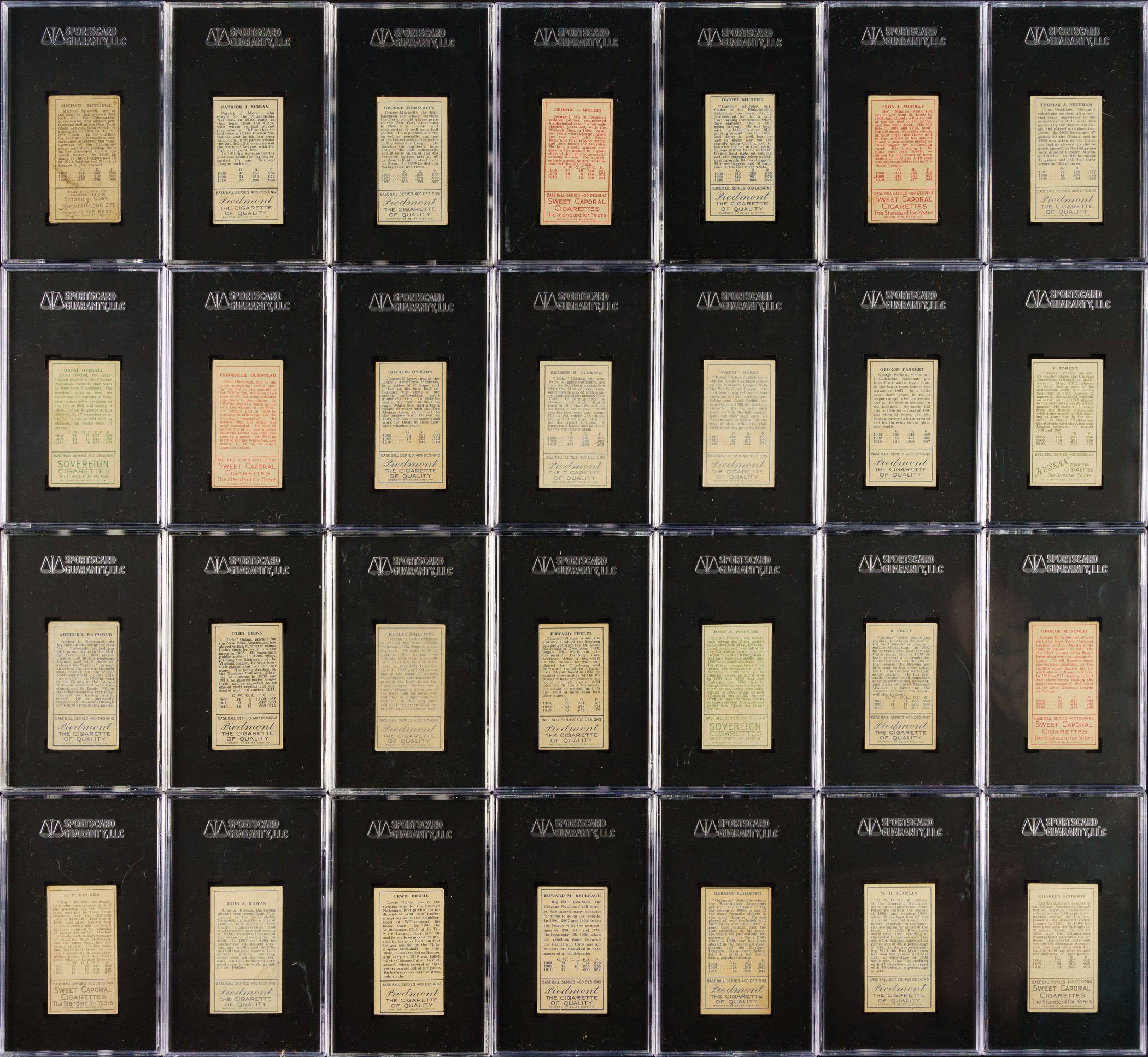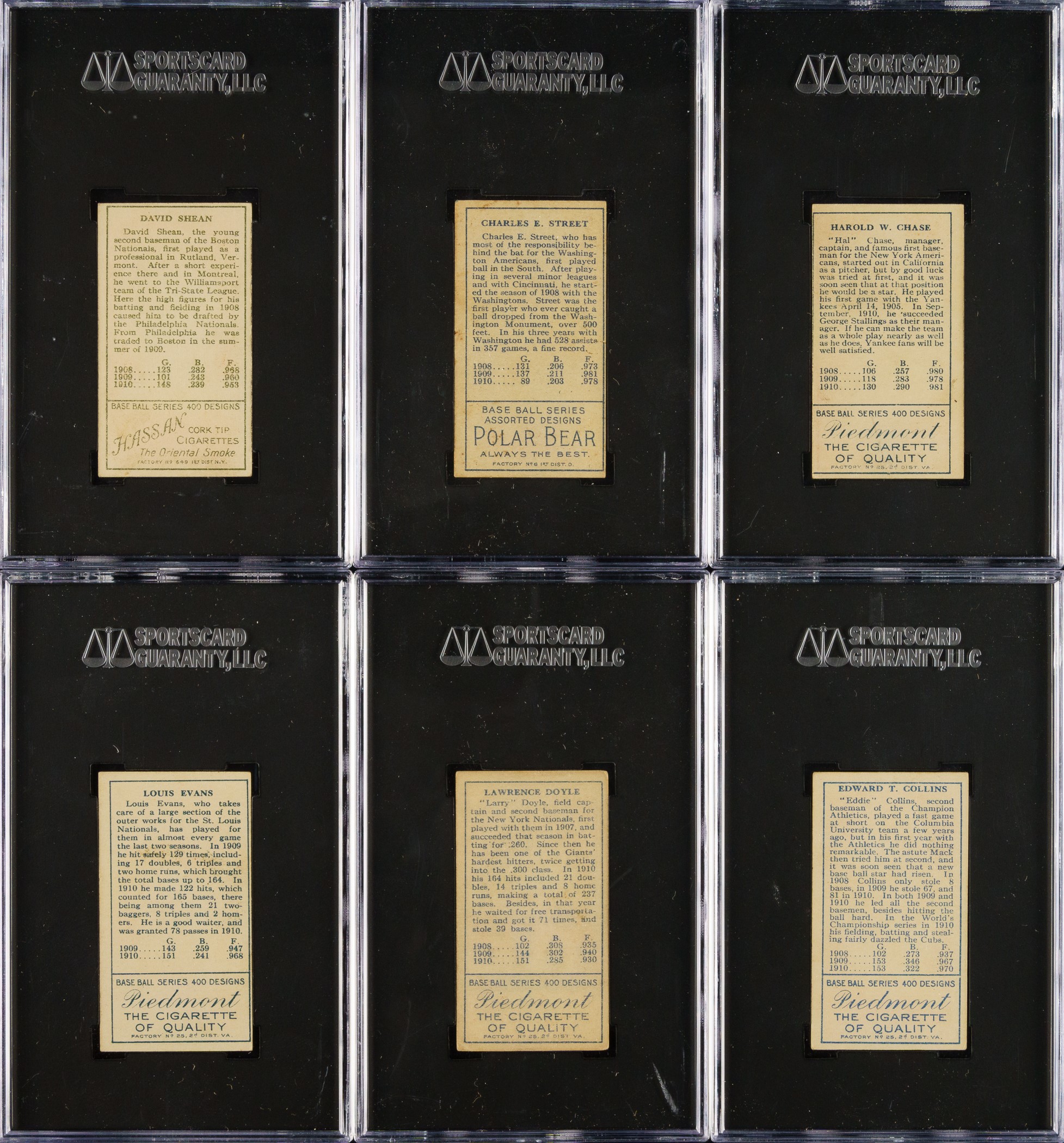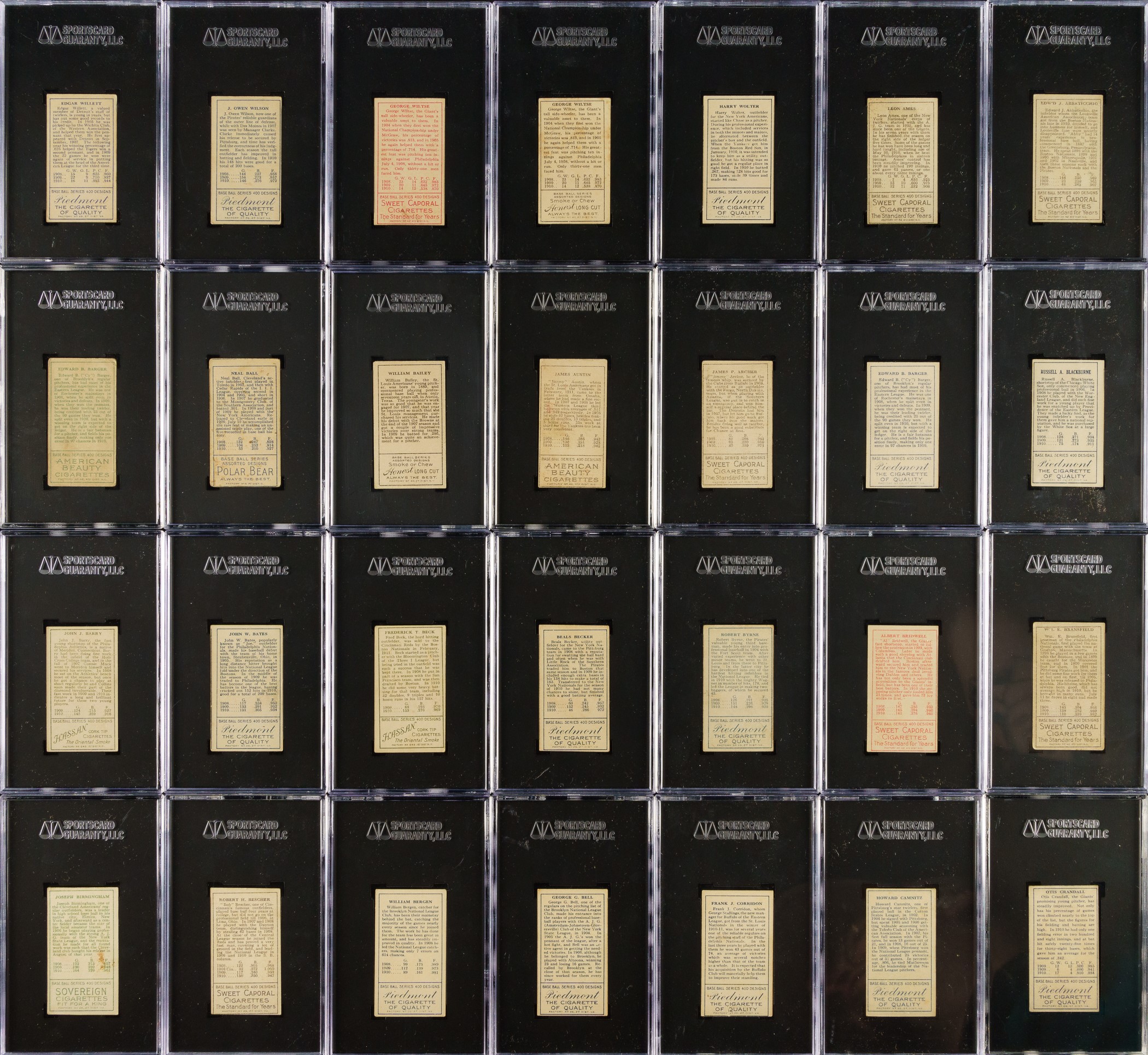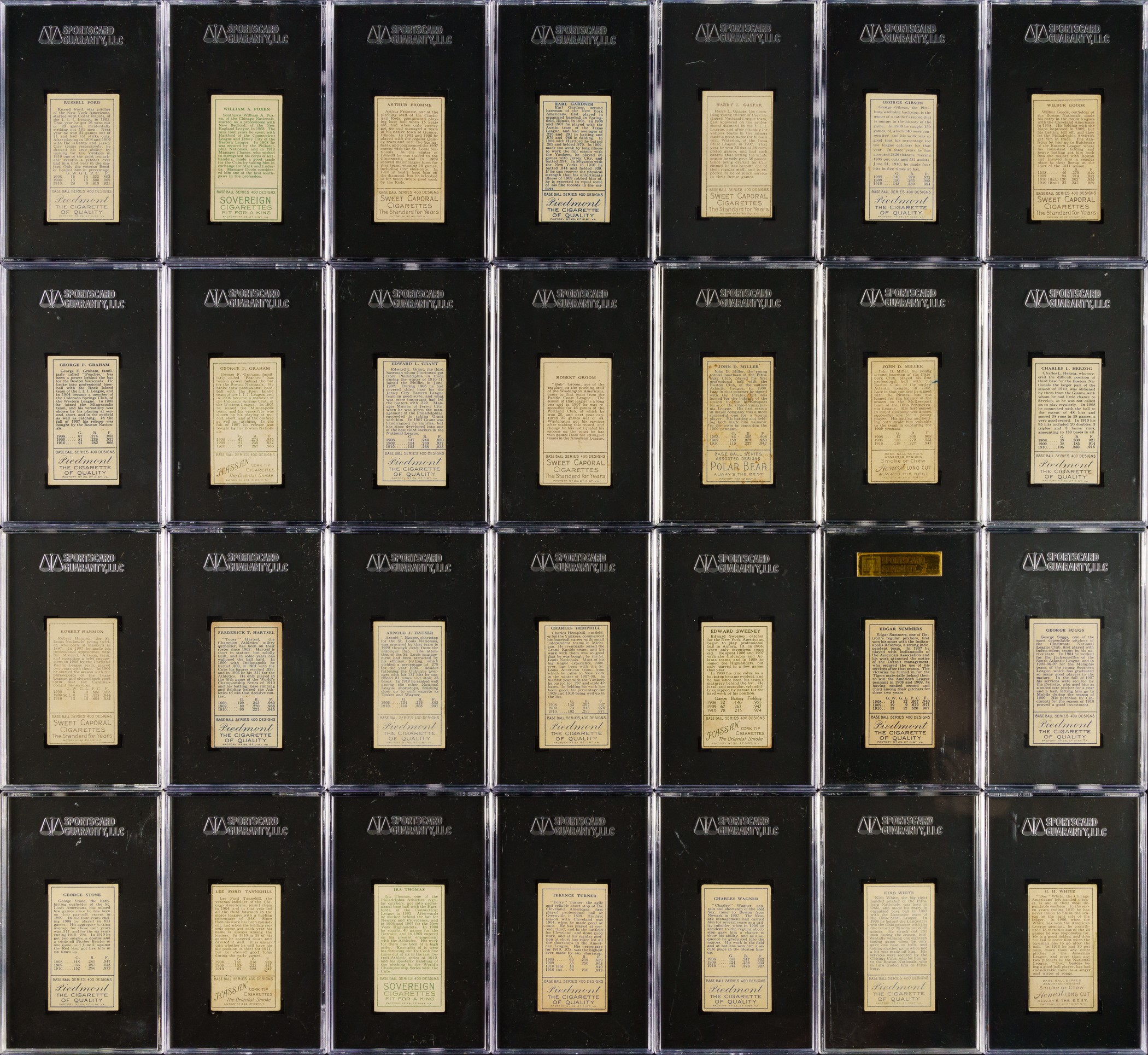 Presented is a mid-grade near-complete master set of T205 Gold Borders consisting of 174 different (of 221) cards, entirely graded and encapsulated by SGC. The T205 Gold Borders set is a classic issue that includes the great stars of the era and many rarities, which make it one of the most challenging and difficult-to-complete of all tobacco-card sets. Overall, this is a very attractive and consistent T205 near-complete set. This set includes the following advertising backs: Sovereign (14), American Beauty (3), and Polar Bear (7). SGC Grading Composite: EX+ 5.5 (12 cards): Including Batch (minor leaguer), Donohue, Lee (minor leaguer), Suggs, Sweeney, Turner, and K. White. EX 5 (54 cards): Including Adkins (minor leaguer), Barger/part "B", Chase/frame ends, Fisher, Graham/Cubs, Grant, Hanford (minor leaguer), Karger, Leifield/"A. P." on front (Polar Bear back), and Miller (Polar Bear back). VG/EX+ 4.5 (38 cards): Including Kleinow, McAllister (minor leaguer), Merritt (minor leaguer), and Scanlan. VG/EX 4 (14 cards): Including Cady (minor leaguer), Ford/white, Frick (minor leaguer), Latham/W. A. Latham on back, Phelan (minor leaguer), and Shean/Cubs. VG+ 3.5 (9 cards): Including Dougherty/red sock and Hoblitzell/"Cin." after 1908 stat. VG 3 (23 cards): Including Chase/gold frame extends (American Beauty back), Collins/mouth closed, Crandall/"t" not crossed, Hoblitzell/name incorrect, Rowan, Wagner, and Wiltse/right ear. GOOD+ 2.5 (7 cards): Including Leifield/"A" on front and Raymond. GOOD 2 (8 cards): Including Dougherty/white sock (Sovereign back). FAIR 1.5 (9 cards): Including Crandall/"t" crossed and Hoblitzell/name correct. Missing the following forty-seven cards for completion of 221-card master set: Baker, Bender, Bresnahan/mouth closed, Bresnahan/mouth open, Brown, Carrigan, Chance, Chase/left ear, Cicotte, Clarke, Cobb, Collins/mouth open, J. Collins, Dahlen, Duffy, Dunn, Evers, Gray/no stats on back, Gray/stats on back, Griffith, Harmon/left ear, Hoblitzell/no stats on back, Huggins, Jennings, Johnson, Joss, Lush, Marquard, Mathewson, Mathewson/1 loss, McGraw, Moran/stray line of type, Nee, Payne, Speaker, Stovall, Tinker, Titus, Vaughan, Wallace/with cap, Wallace/no cap, one line of 1910 stats, Wallace/no cap - two lines of 1910 stats, Walsh, Wheat, Wilhelm/"suffered" in bio, Wilhelm/"suffe ed" in bio, and Young. This is an outstanding offering and is far more complete than usually seen. Total: 174 cards. The size/weight of this item requires that there will be an additional shipping charge for this lot. Opening Bid $2,500.