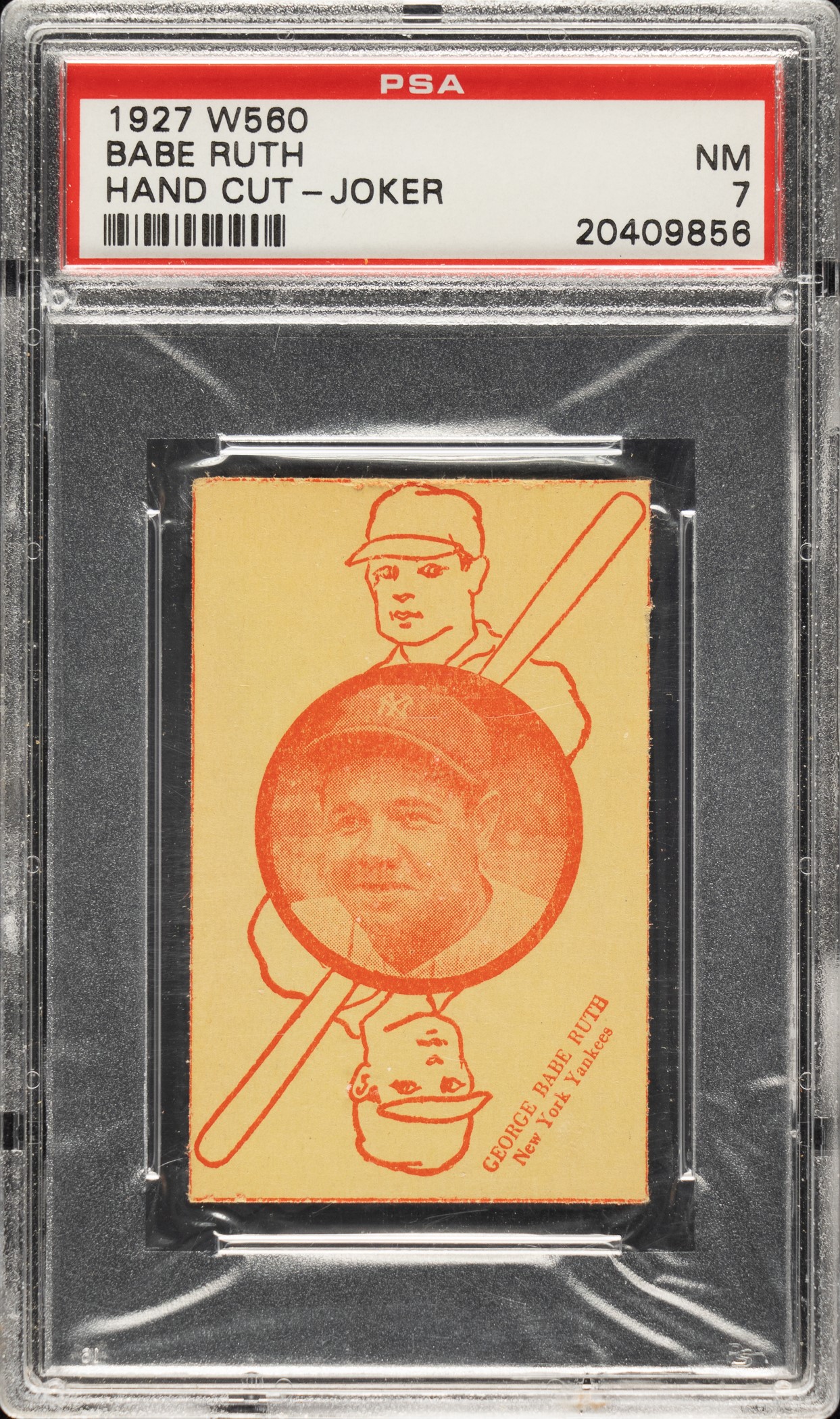 Graded NM 7 by PSA. High-grade example of New York Yankees Hall of Famer Babe Ruth from the W560 strip-card set. W560s were intended to be cut by hand to create a playing-card deck. Ruth is the key card (along with Lou Gehrig) from among the forty-nine baseball players within the set. This is one of the few sets issued in the late 1920s, and it is from Ruth's most legendary season. This neatly cut example is bright and crisp, with strong corners, and a clean blank reverse. W560 cards are beginning to be recognized for the outstanding value they represent compared with most other vintage cards, and the offered example of Ruth would be an ideal addition to any Babe Ruth, Hall of Fame, or strip-card collection. Opening Bid $1,000.