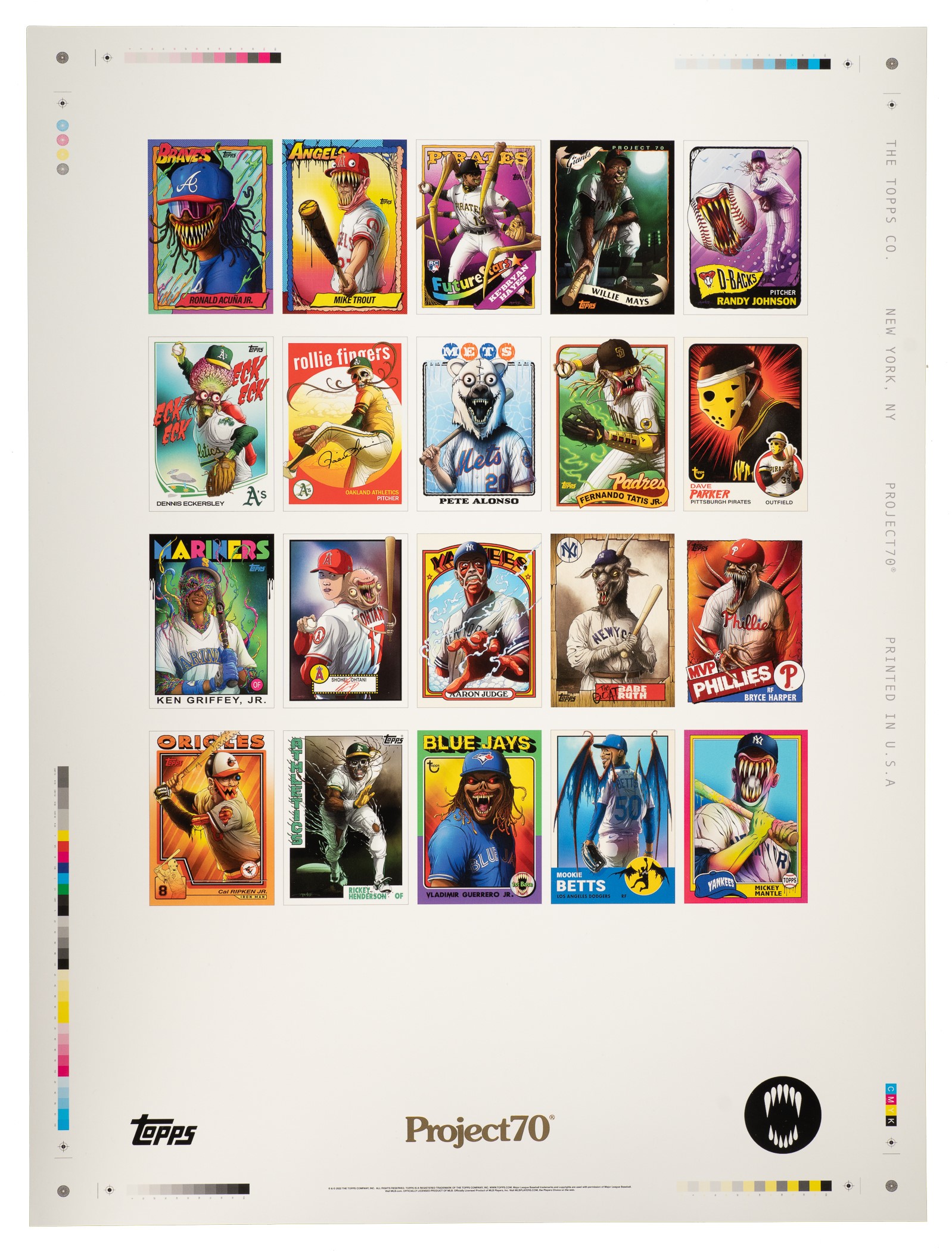 Complete set of the 20 cards (plus bonus All-Star game card) designed by artist Alex Pardee for the 2021 Topps Project 70 series. According to Topps, the series, which pays homage to 70 years of baseball cards, "pushes boundaries while paying homage to our heritage." A total of 53 artists/creators contributed cards to this 936-card series. Each artist/creator was empowered to put their unique spin on MLB players and Topps designs. Pardee's "Brightmares" style cards featured here are amongst the most popular in the series. With each card from the sets only available on Topps' website for 70 hours, many cards have limited print runs. This set features the following players: Mickey Mantle, Cal Ripken Jr., Rickey Henderson, Vladamir Guerro Jr., Mookie Betts, Ronald Acuna Jr., Mike Trout, Ke'Bryan Hayes, Willie Mays, Randy Johnson, Dennis Eckersley, Rollie Fingers, Pete Alonzo, Fernando Tatis Jr., Dave Parker, Ken Griffey Jr., Shohei Ohtani, Aaron Judge, Babe Ruth, Bryce Harper, and Teoscar Hernadez/Ronald Acuna Jr. All-Star game card. The set of cards is accompanied by an exclusive gold-stamped poster (18 x 24 inches) featuring all 20 cards. This poster could only be obtained when buying all 20 cards from a specific artist via the Topps website. The poster is in Mint condition overall. The card's original Topps envelopes are included as well. Total: 21 cards (plus original envelopes) and poster. The size/weight of this item requires that there will be an additional shipping charge for this lot. Opening Bid $10.
