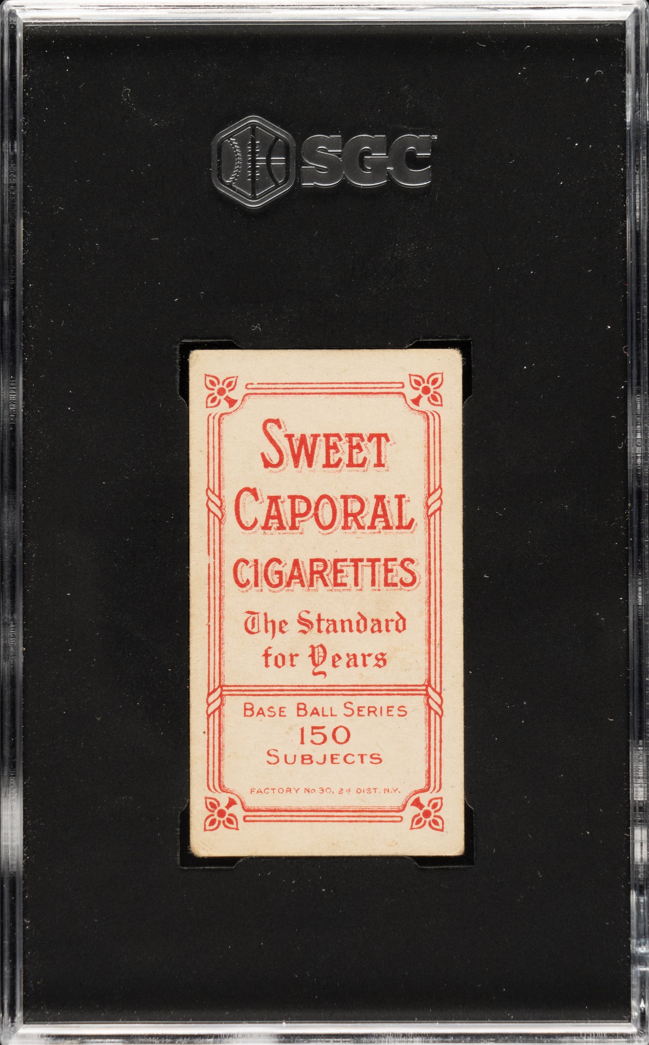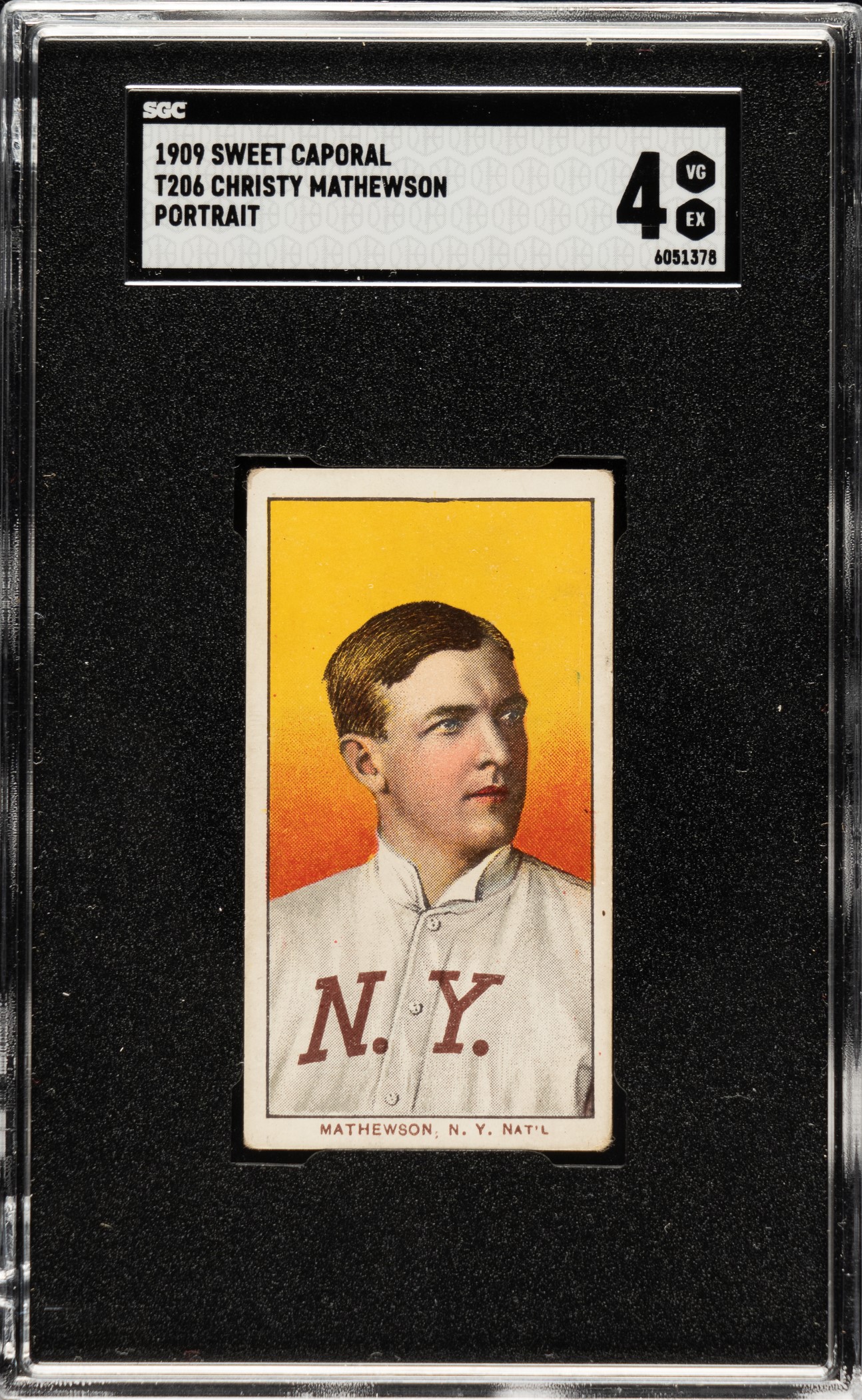 Graded VG/EX 4 by SGC. Mid-grade example of one of the three classic poses of New York Giants Hall of Famer Christy Mathewson from the T206 White Borders series. This portrait pose is one of the most popular of all T206s and all Mathewson cards. This example has vibrant colors, outstanding registration, and honest corner wear. Boldly printed Sweet Caporal 150/30 advertising reverse. Opening Bid $10.