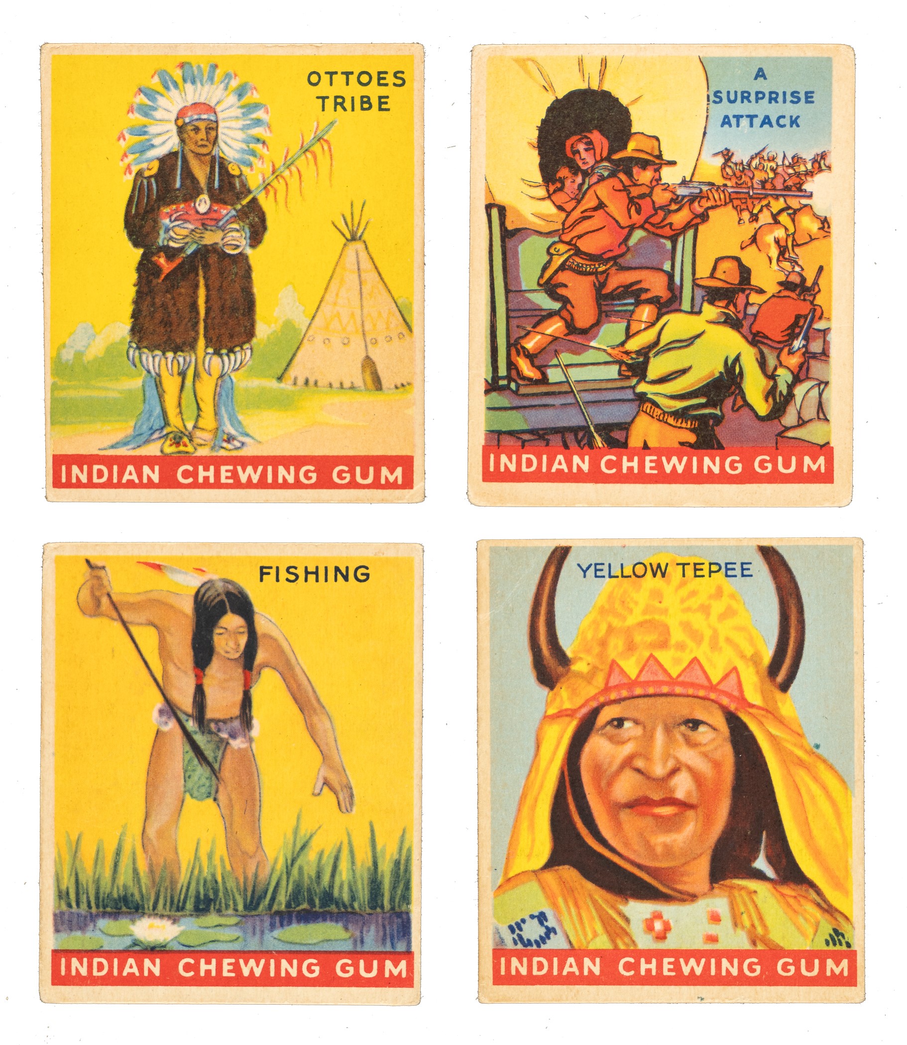 Extremely presentable near-complete set (80/96) of Goudey "Indian Gum," missing the following sixteen cards for completion: #3, 12, 20, 29, 32, 33, 37, 50, 55, 56, 58, 64, 75, 85, 86, and 88. Condition ranges from Good to Vg including some higher and lesser. This is a fascinating and very historic set. Goudey Gum attempted to reenter the bubble-gum card market following WWII, reprinting in 1947 ninety-six cards from one of its most successful sets of the 1930s, "Indian Gum." The fronts feature the very same artwork of the Indian Gum cards issued by Goudey in the 1930s. The reverses have a slightly different design than their 1930s counterparts and are printed in black ink (as opposed to the green ink of the 1930s issue). Goudey's 1947 efforts were apparently not very successful as the company was never heard from again. This series represents Goudey's very last card set. If this set had been a hit, we might have seen Goudey battling with Topps and Bowman in the bubble-gum card wars of the early 1950s! This is an outstanding near-complete set (minus sixteen) of this colorful and historically extremely significant final Goudey issue. Total: 80 cards. Opening Bid $10.