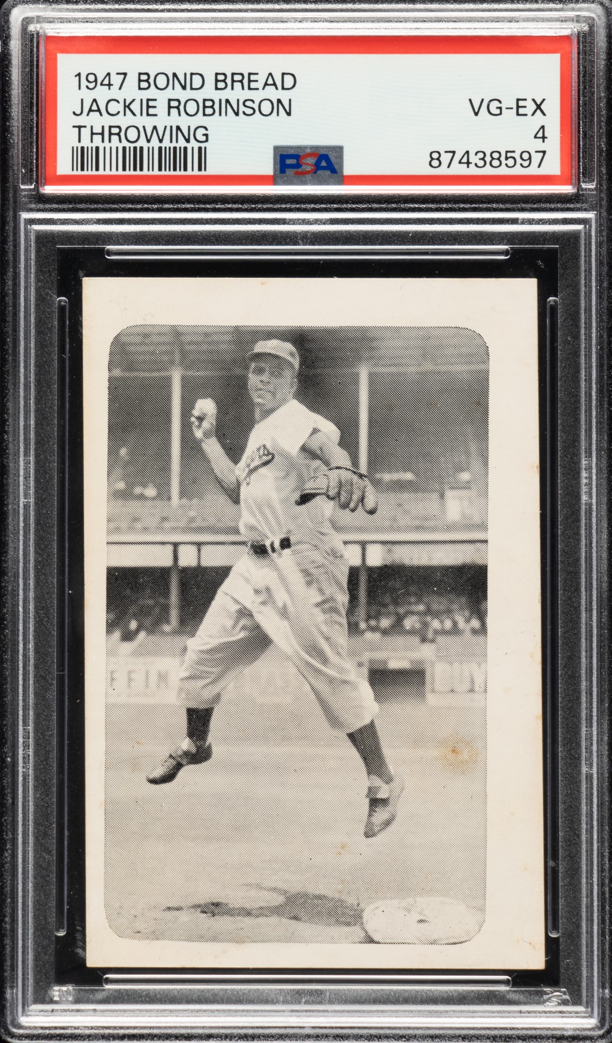 Graded VG-EX 4 by PSA. Beautiful mid-grade example of Jackie Robinson (throwing) from the circa 1947 Bond Bread set. The thirteen-card set is devoted entirely to Jackie Robinson and features the Brooklyn Dodgers Hall of Famer in various black-and-white poses on glossy card stock. The offered card is bright and crisp with strong corners displaying light touches of wear. The back, which bears Robinson's facsimile signature and the tagline "Folks, why not eat the bread that Jackie eats?", is boldly printed. Spots of light staining are visible along the front and back. The circa 1947 Bond Bread issue is a historic set, dating from Jackie Robinson's earliest days in the major leagues, and individual cards from this classic issue will always be extremely desirable. Opening Bid $1,000.